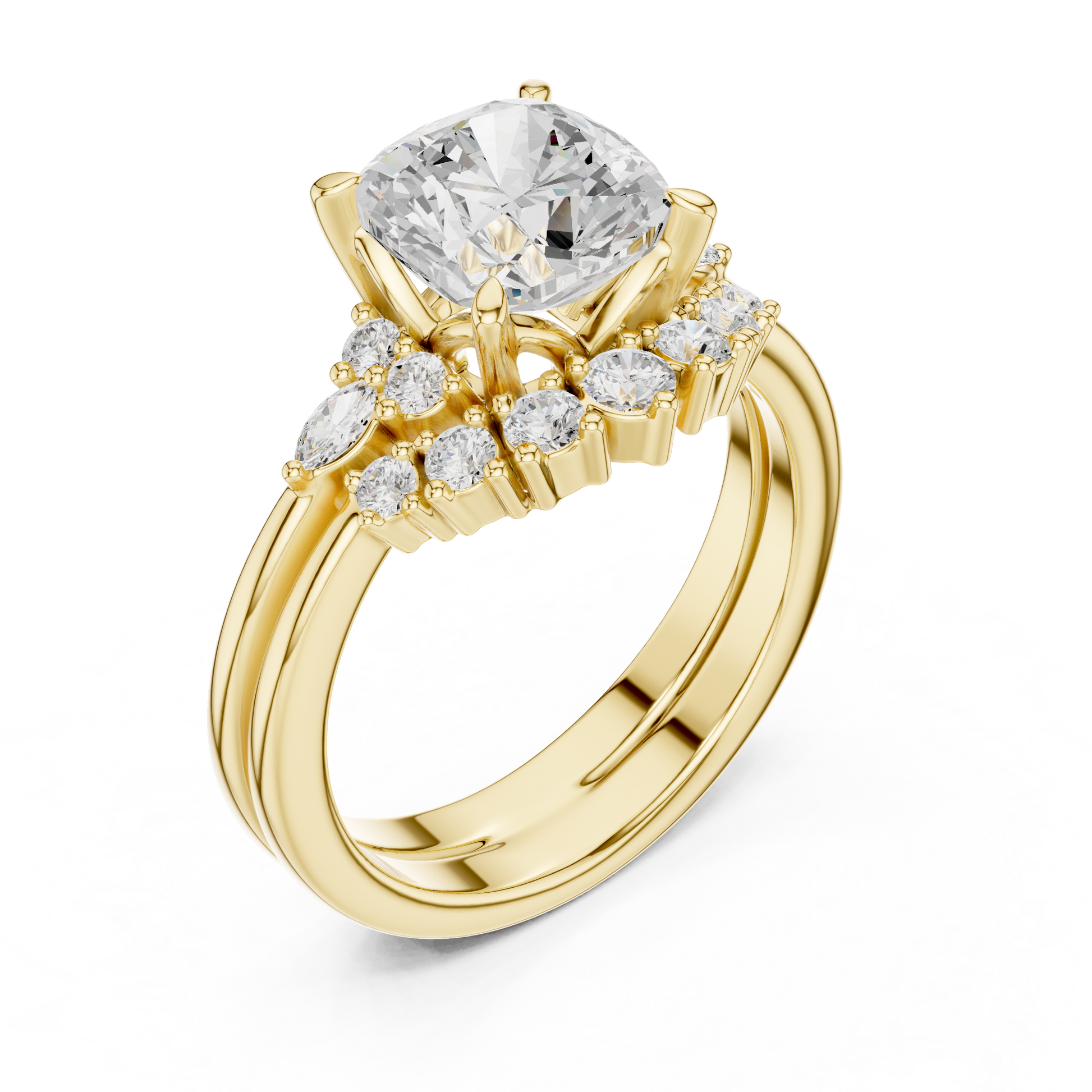 This stunning engagement ring features a radiant cushion square-cut center diamond embraced by a sparkling halo of petite diamonds, creating exceptional brilliance and visual depth. Crafted in polished gold, the elegant split-style shoulders add balance and refinement while enhancing the center stone’s presence. Timeless yet luxurious, this ring blends classic halo design with modern sophistication, making it a breathtaking symbol of love, commitment, and enduring elegance.