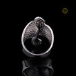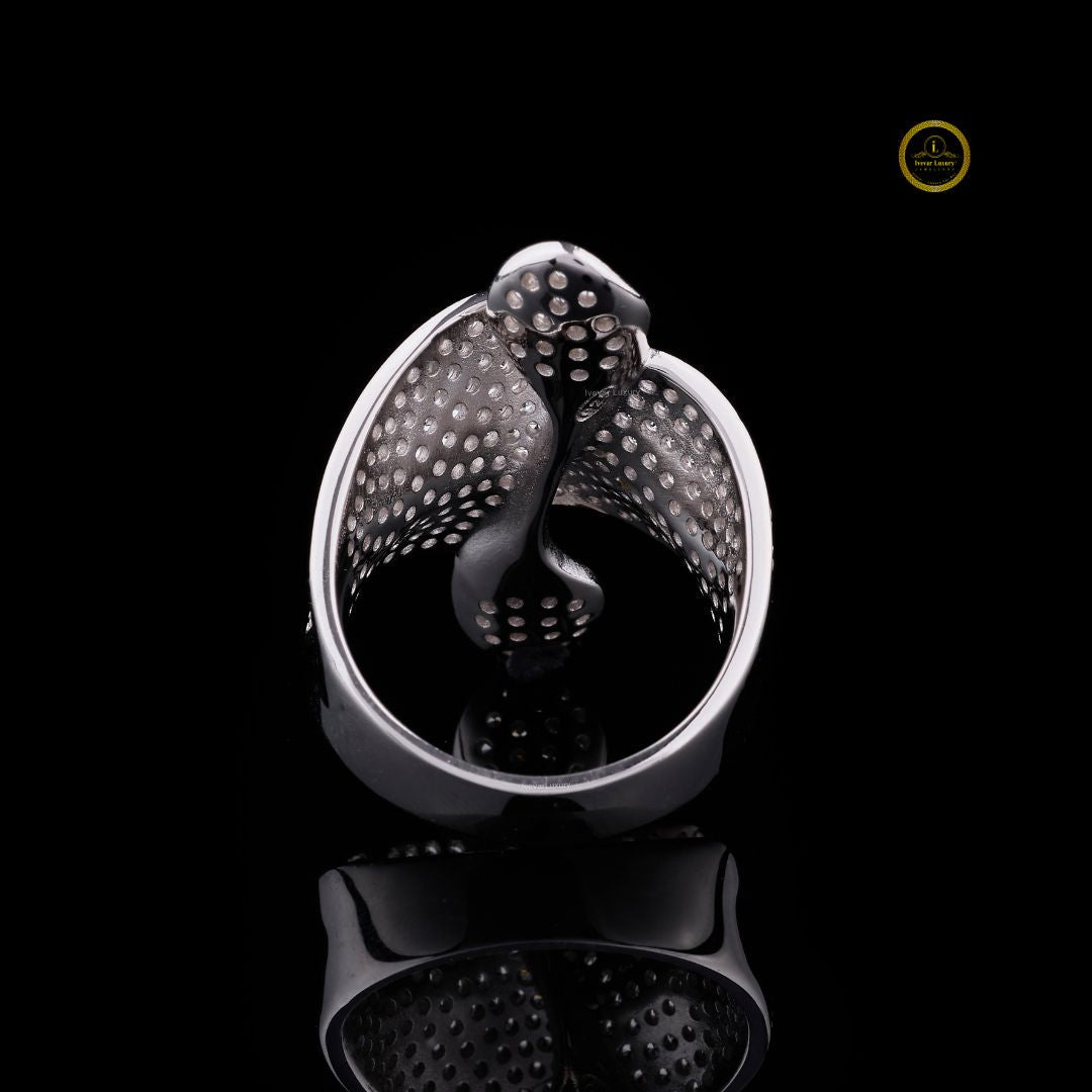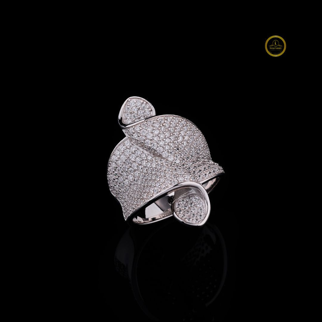 This elegant piece showcases a beautifully sculpted leaf-inspired design, fully adorned with pave-set diamonds that create a radiant, shimmering effect. The ring features an artistic curved silhouette, giving it a modern and expressive character. Its smooth silver finish enhances the brilliance of the stones, making it an exceptional accessory for those who appreciate statement jewelry, luxury craftsmanship, and unique, nature-inspired aesthetics. Perfect for elevating both formal and everyday looks, this ring embodies refinement and bold elegance.