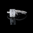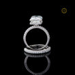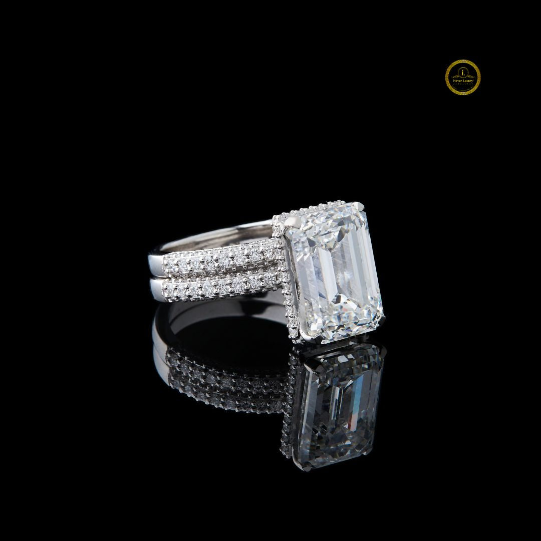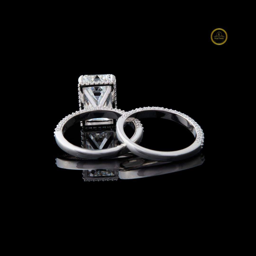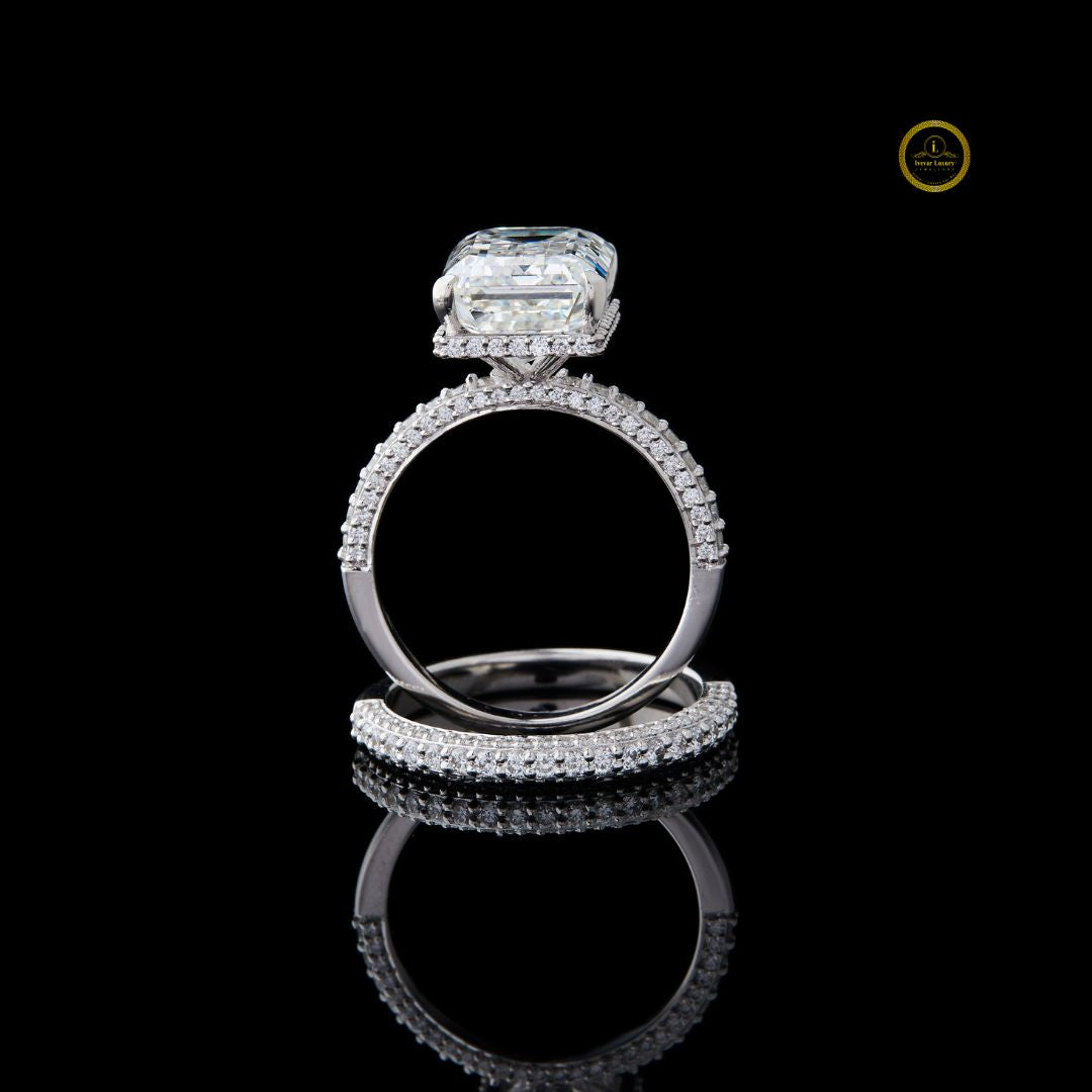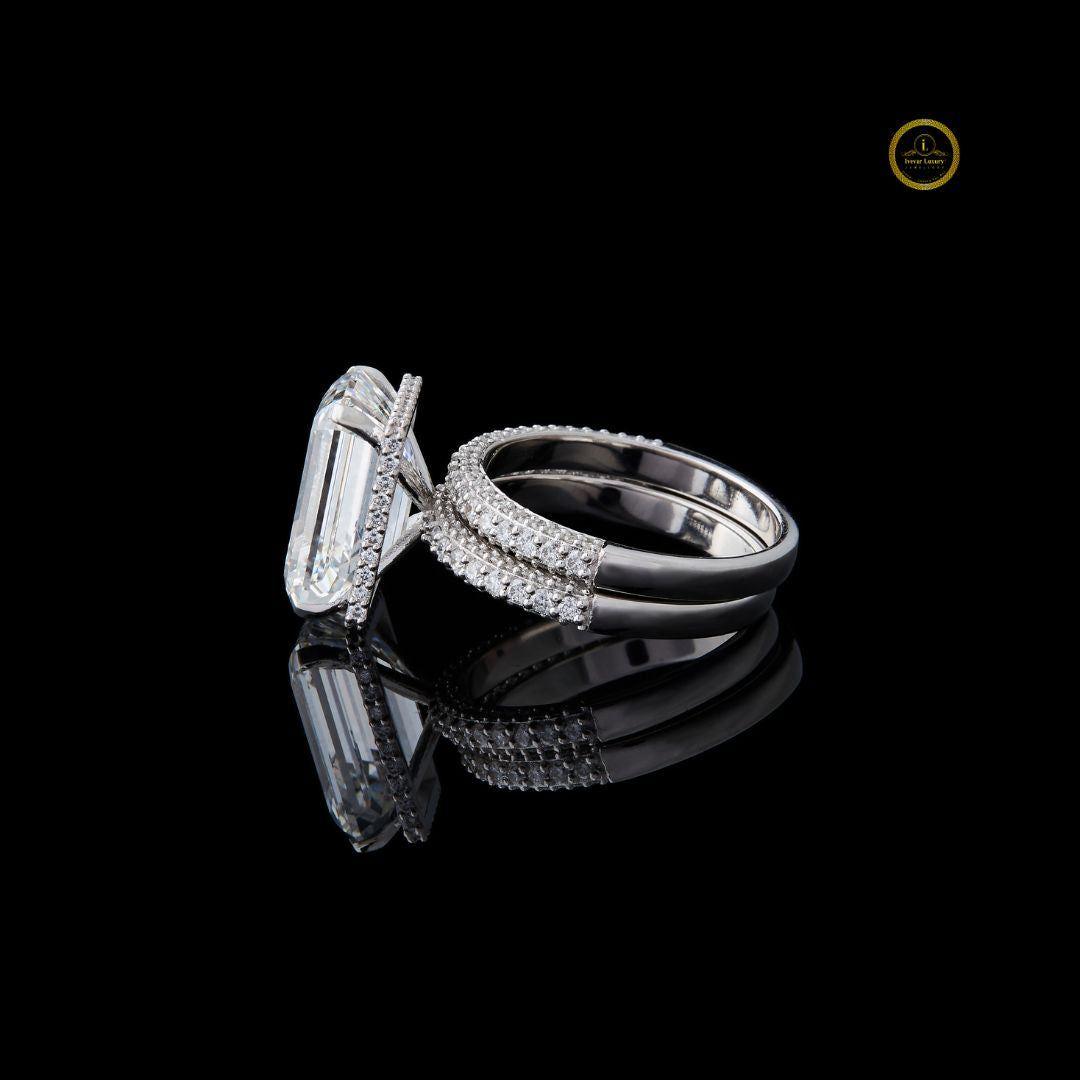 This stunning bridal set features a magnificent emerald-cut diamond engagement ring. The center stone is elegantly bordered by a hidden halo of round diamonds with delicate pave band, enhancing its brilliance and size. The ring's band, along with the perfectly matched accompanying wedding band, is also encrusted with brilliant pave-set diamonds, creating continuous sparkle from every angle. Set in a luminous white metal, this design perfectly blends classic sophistication with modern luxury, making it an ideal symbol of enduring love and commitment.
