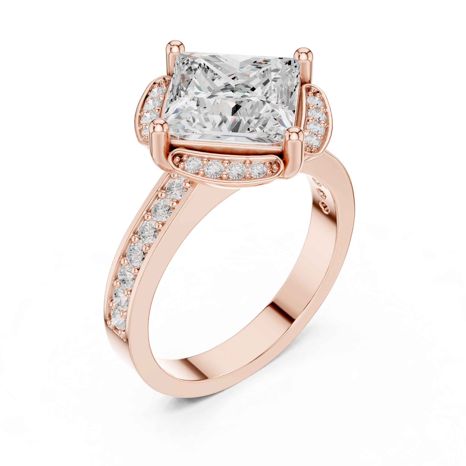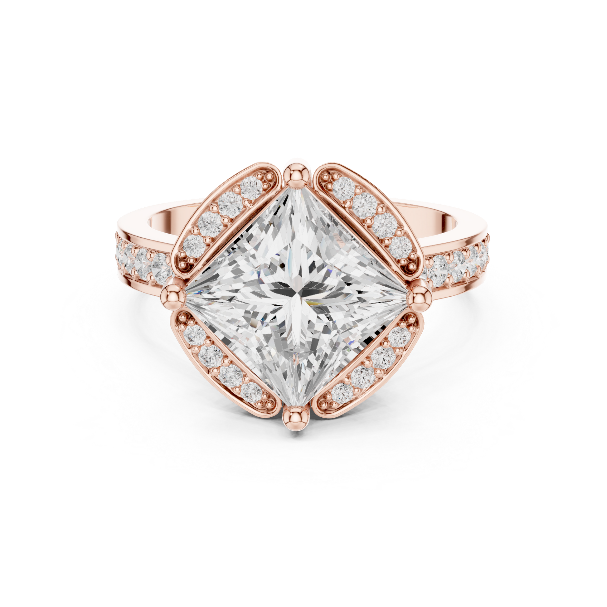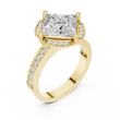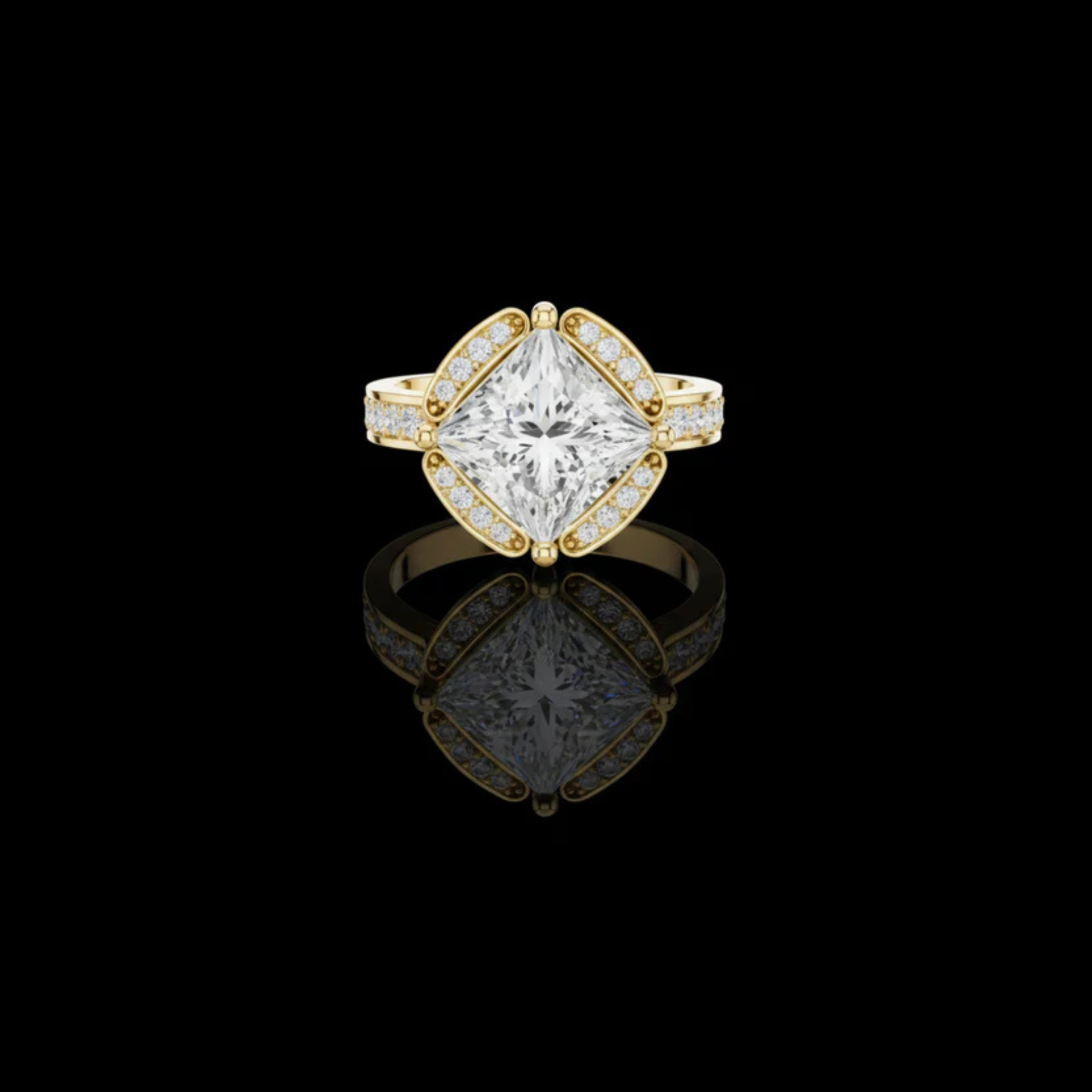 This ring showcases a striking princess-cut center stone set in a dramatic square orientation, framed by a vintage-inspired pavé halo on all four sides. Crafted in rich gold, the ring blends bold geometry with timeless sparkle, creating a luxurious and eye-catching statement. Perfect for engagements or special celebrations, this design delivers brilliance, uniqueness, and refined sophistication.