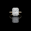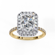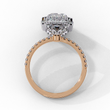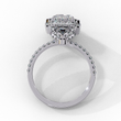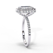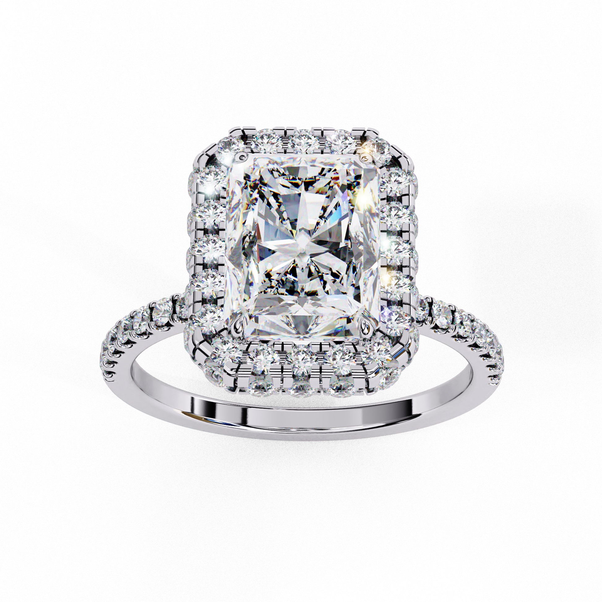 This stunning ring features a large, radiant-cut center diamond surrounded by a dazzling halo of smaller round brilliant diamonds that amplify its sparkle and presence. The delicate band is adorned with a row of pavé-set diamonds, adding extra shimmer and elegance to the design. Crafted with meticulous attention to detail, the combination of the halo setting and the shimmering band.