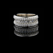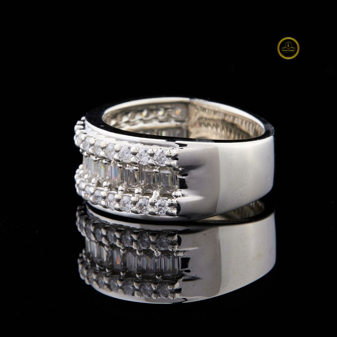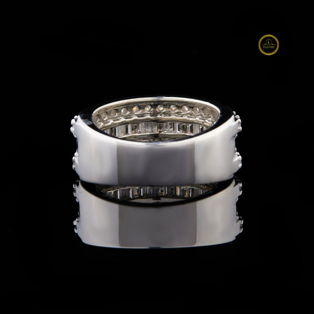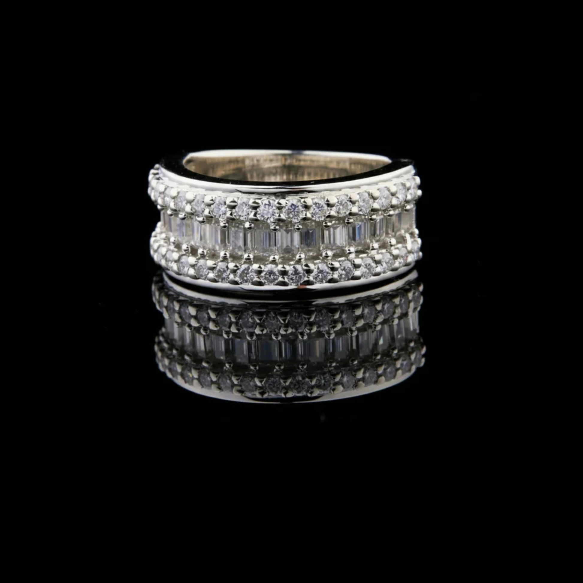 This stunning wide-band ring showcases a luxurious blend of brilliance and sophistication, featuring two rows of round-cut diamonds framing a center row of elegant baguette diamonds for a striking multidimensional sparkle. Crafted in polished white metal, its bold yet refined design creates a captivating presence, making it an exquisite statement piece for special occasions or elevated everyday wear. Experience Luxury with custom wide band ring by Ivevar.