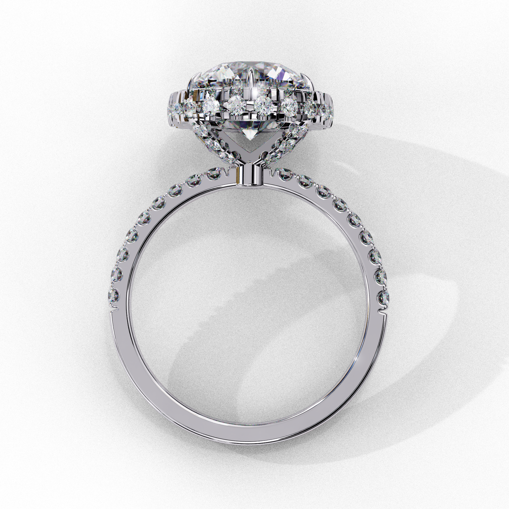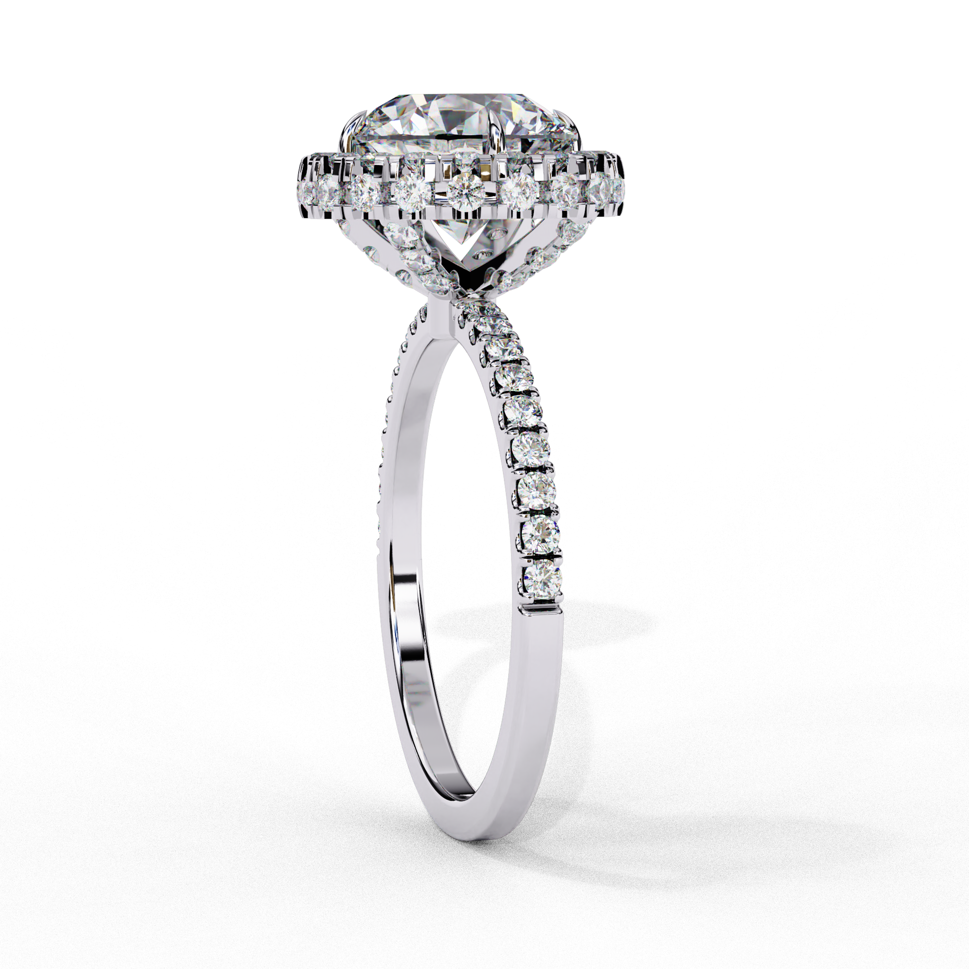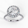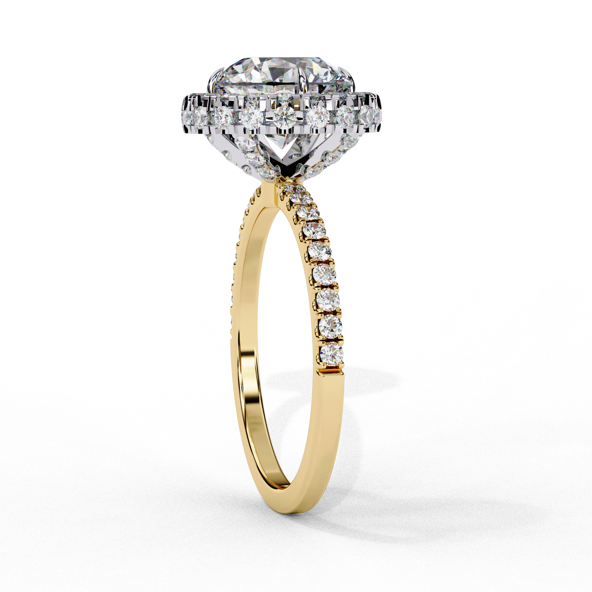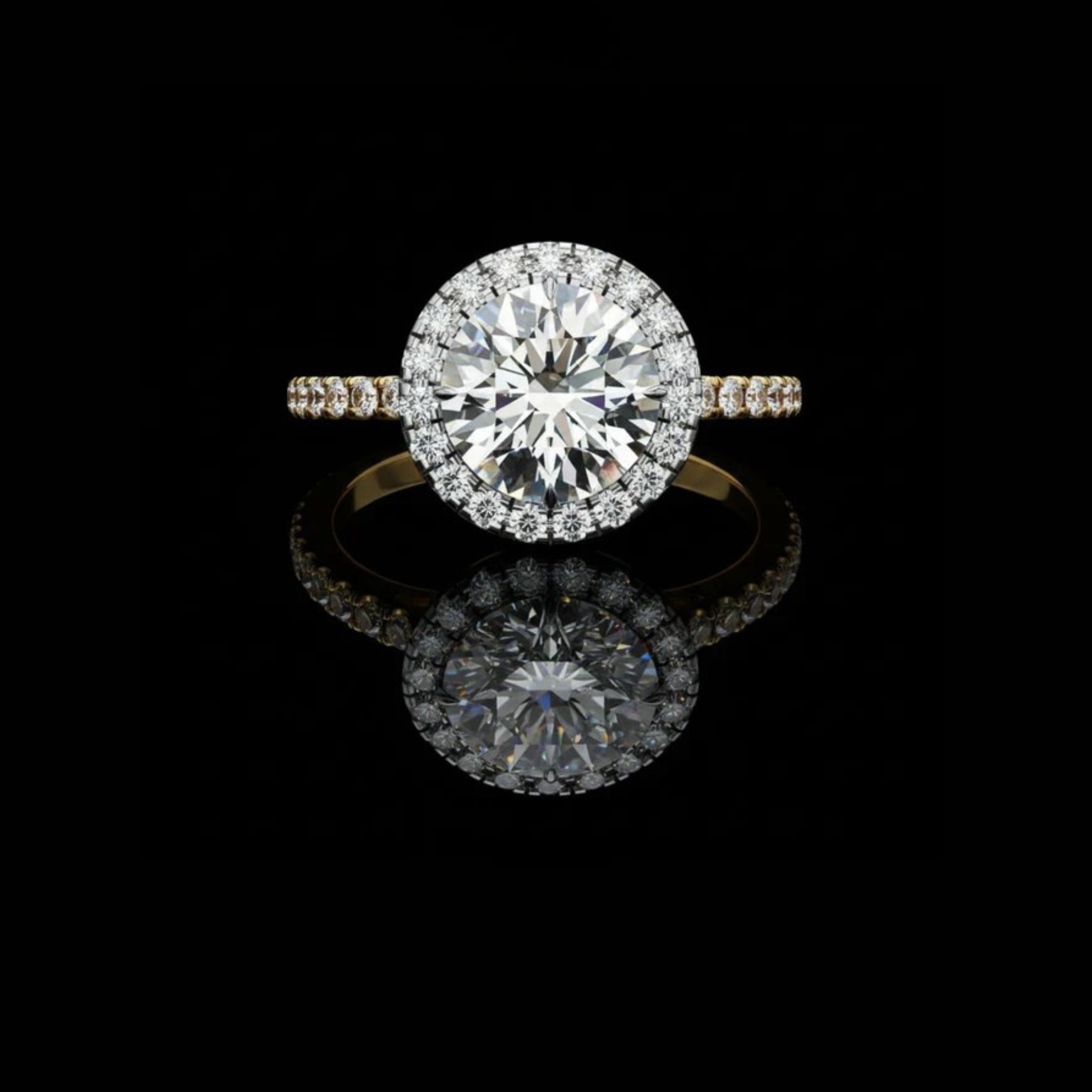 This exquisite engagement ring features a stunning round brilliant diamond at its center, encircled by a halo of smaller diamonds, enhancing its brilliance and creating a breathtaking sparkle. The band is crafted from a combination of gold and diamond accents, providing a luxurious contrast that highlights the central diamond's radiance. The intricate design not only emphasizes the beauty of the main stone but also adds an air of sophistication, making this ring a timeless symbol of love and elegance.