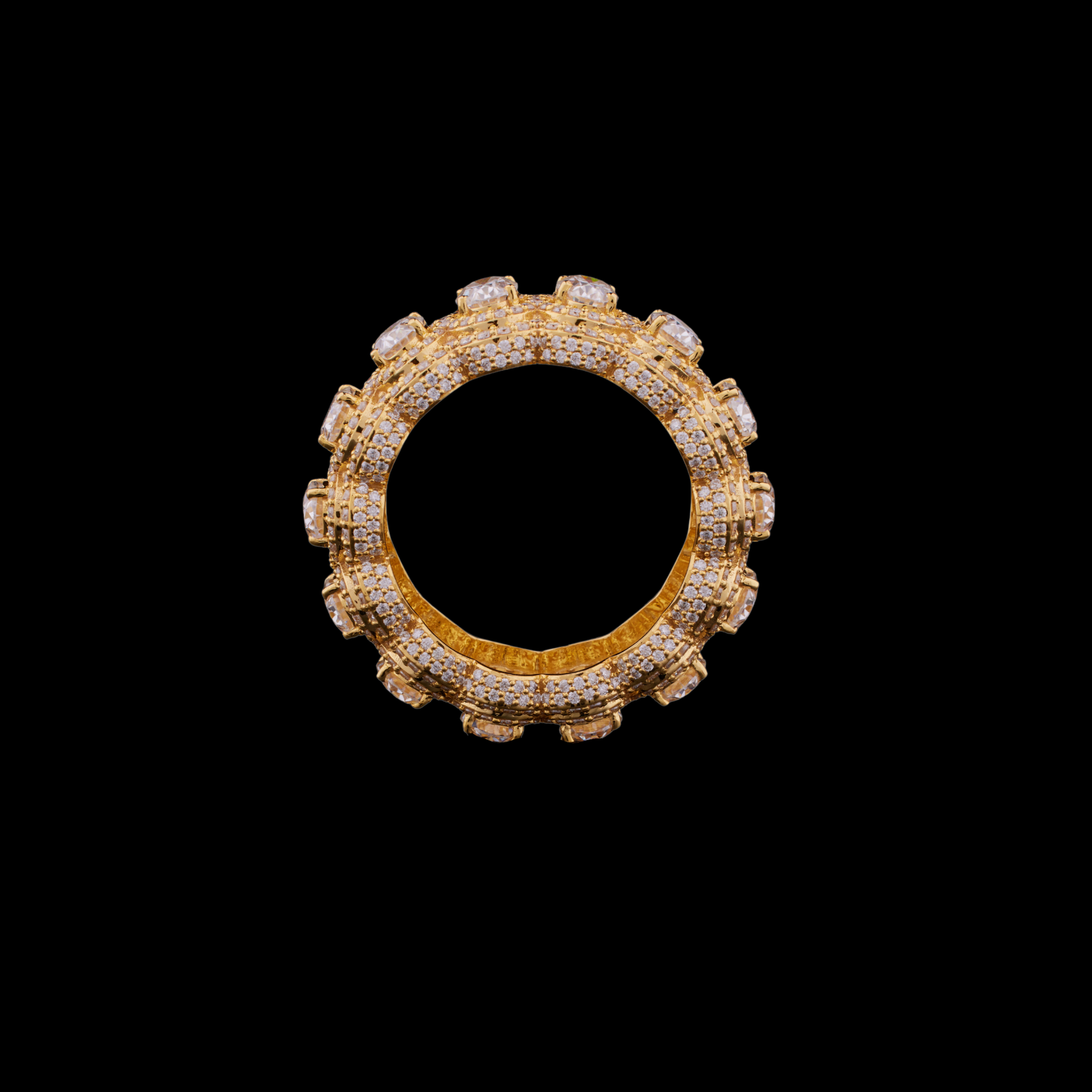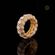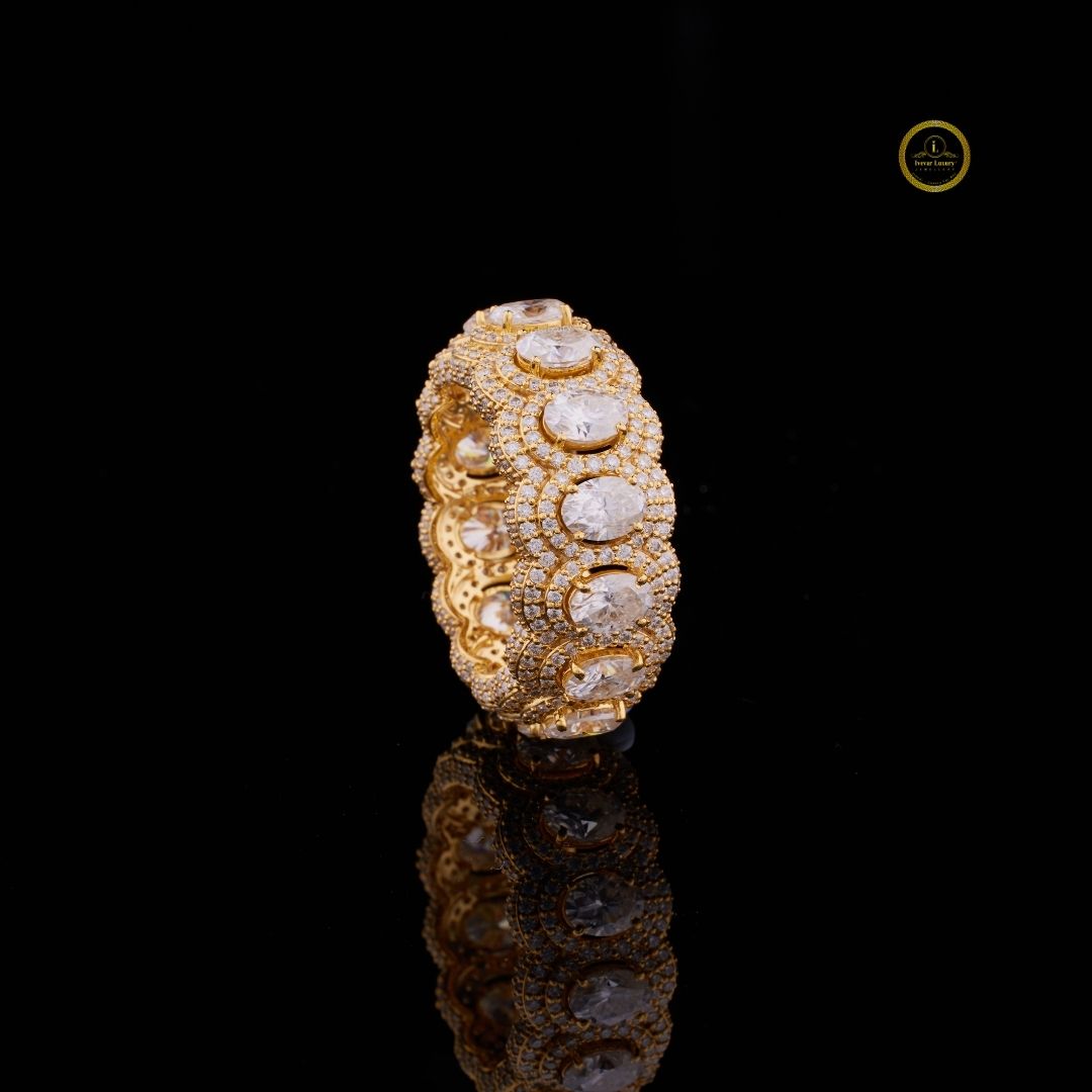 This exquisite gold eternity band features a series of large oval-cut stones encircled by intricate pave detailing, creating a luxurious, textured surface that radiates brilliance from every angle. Its rich golden setting contrasts beautifully with the shimmering round diamonds, giving the ring a regal, opulent presence. The continuous pattern of sparkling stones symbolizes unending elegance, while the finely crafted scalloped interior adds a touch of refinement and comfort. Perfect as a statement piece or a lavish complement to formal attire, this ring embodies both timeless glamour and exceptional craftsmanship.