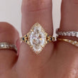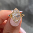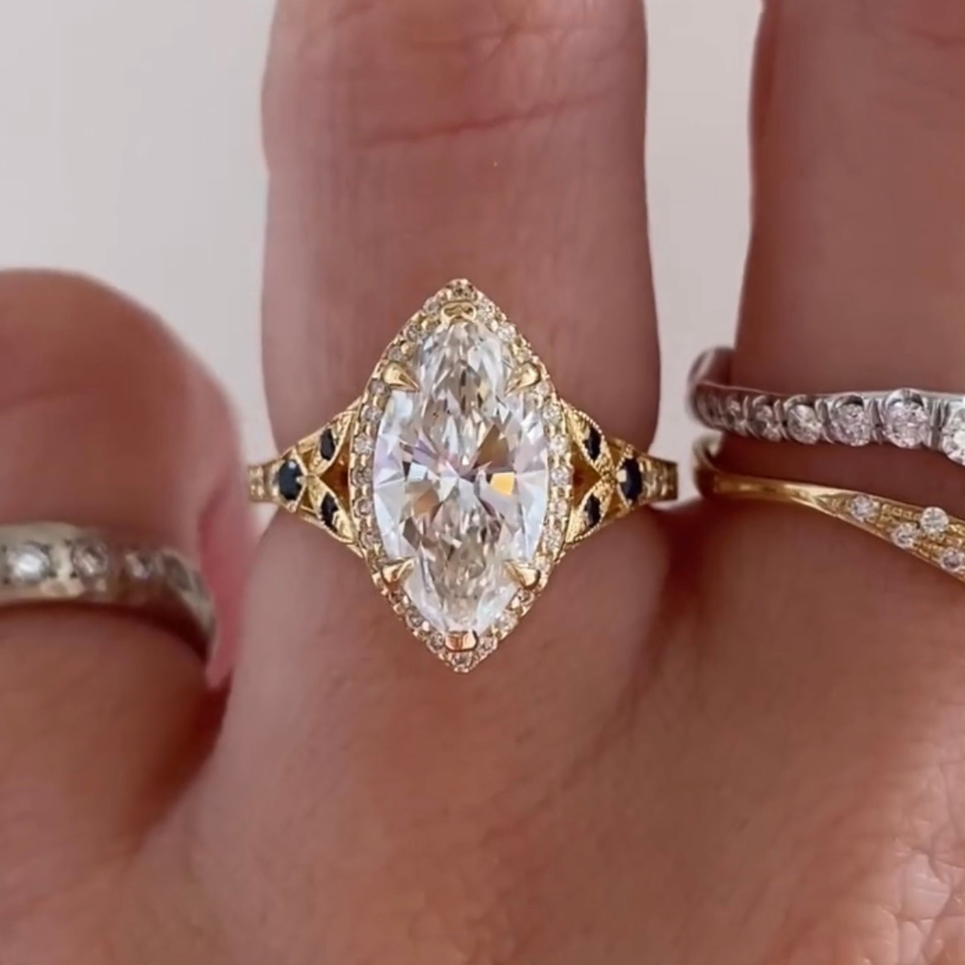 This breathtaking ring features a dazzling marquise-cut diamond framed by a delicate diamond halo, enhancing its brilliance and elongating the finger. Crafted in rich gold, the band showcases intricate detailing with elegant accent stones, giving the design a timeless, vintage-inspired charm. Perfect as an engagement ring or a luxurious statement piece, this ring blends classic romance with refined craftsmanship. The bold center stone and ornate setting make it ideal for those who appreciate heirloom-style jewelry with modern sparkle.