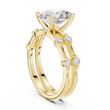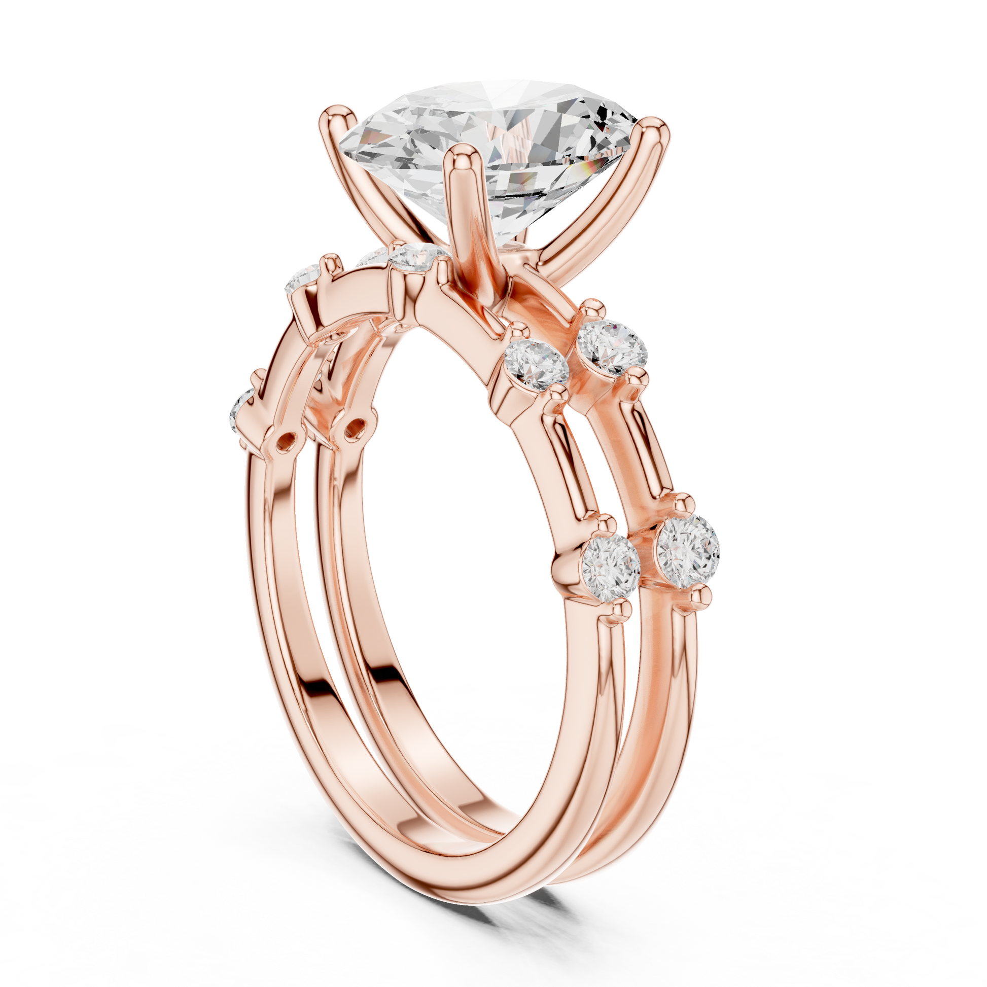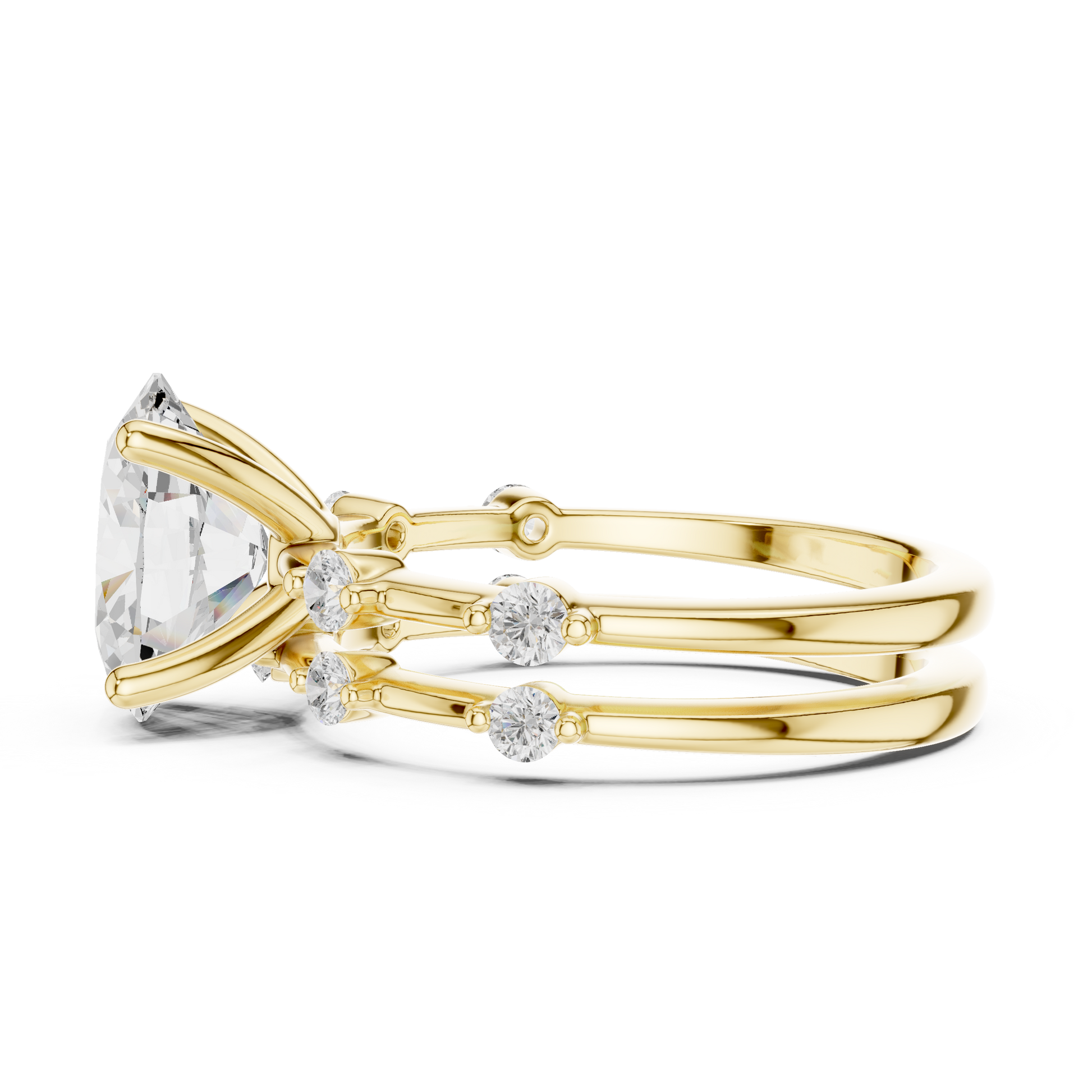 This elegant engagement ring features a dazzling oval-cut solitaire diamond set in a classic four-prong setting, accentuated by delicate round diamonds artfully arranged along the gold band. The open, airy design of the setting enhances the center stone’s brilliance and elongates the finger for a graceful look. Perfectly balancing sophistication with understated glamour, this ring is an exquisite symbol of enduring love and refined style.