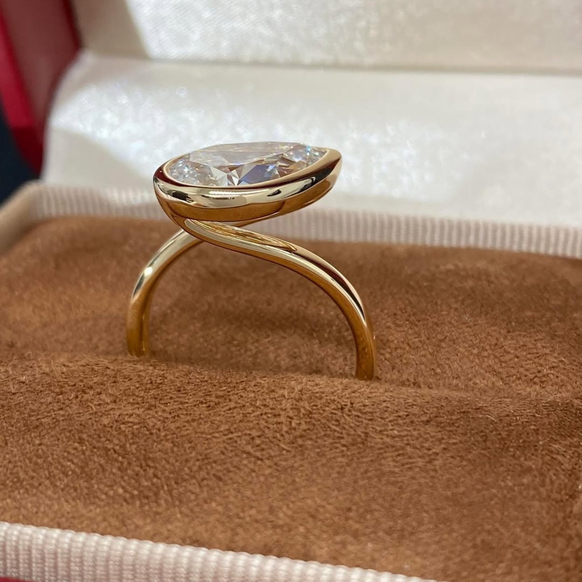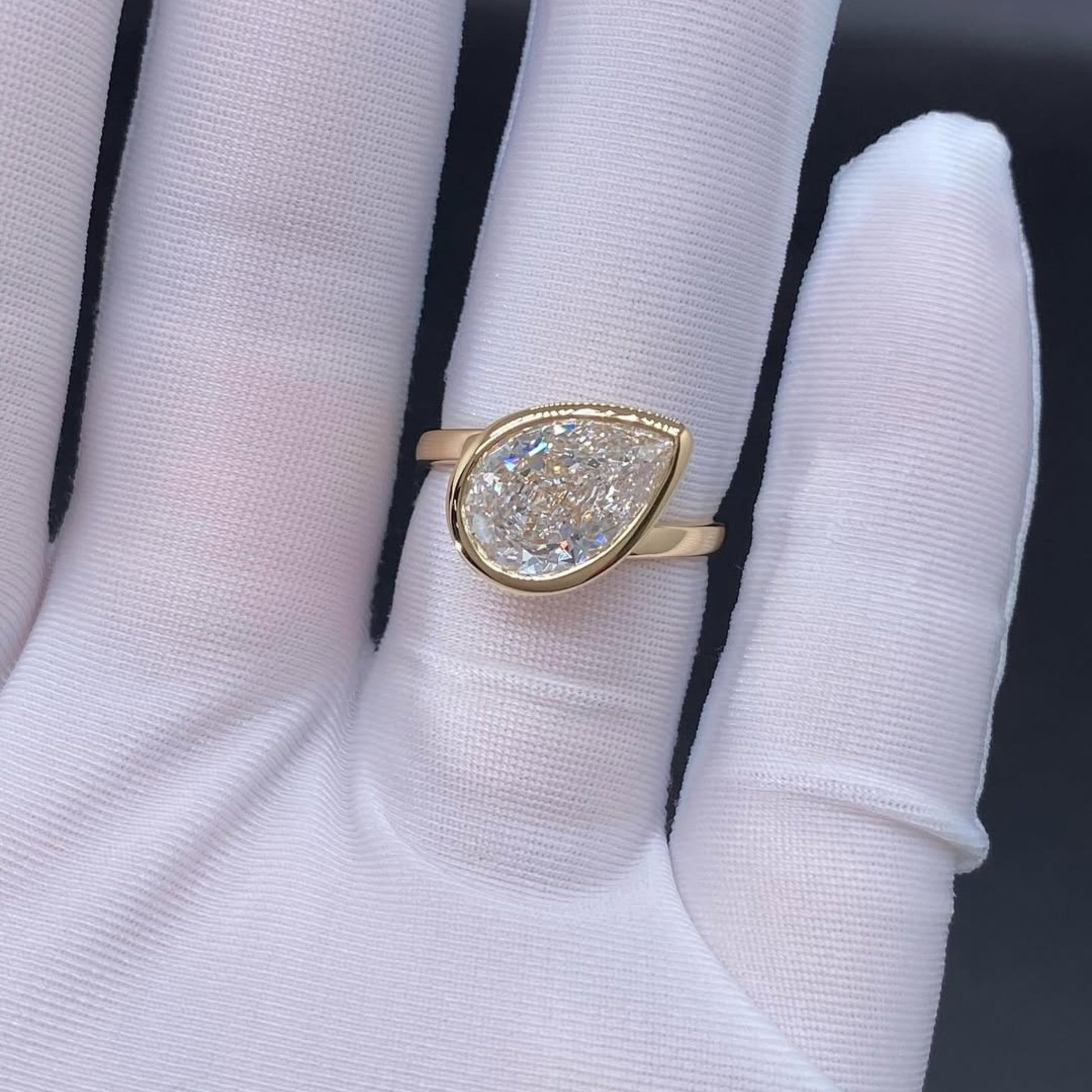 This refined ring showcases a brilliant pear-shaped diamond securely set in a smooth bezel setting, offering both elegance and durability. Crafted in rich gold, the sleek design highlights the diamond’s natural sparkle while maintaining a clean, modern silhouette. Perfect for those who appreciate minimalist luxury, this ring is ideal as an engagement ring, anniversary gift, or a sophisticated everyday statement piece. The bezel setting provides a contemporary look while protecting the stone, making it as practical as it is beautiful.