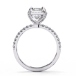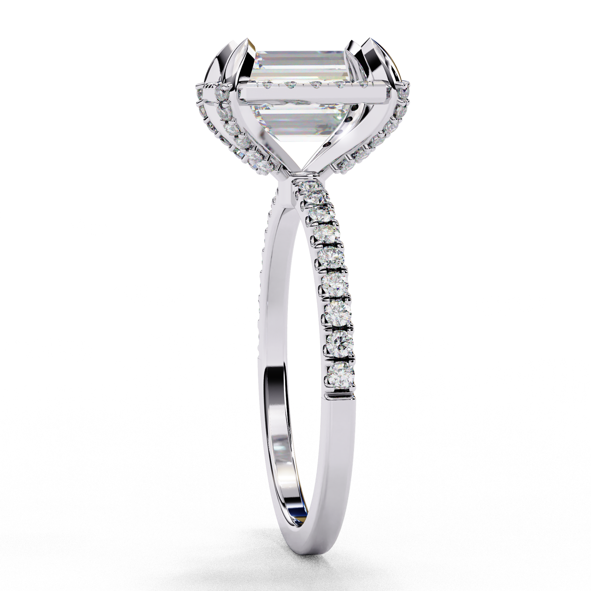 This stunning emerald cut diamond engagement ring features a large, emerald diamond at its center, set in a classic band. The band is adorned with pave diamonds, enhancing the ring's overall sparkle and elegance. The four-prong setting secures the diamond beautifully, while the pavé accents add an extra touch of luxury and sophistication. The high-quality craftsmanship ensures this piece will be treasured for a lifetime, making it an ideal choice for a timeless engagement ring or special celebration.