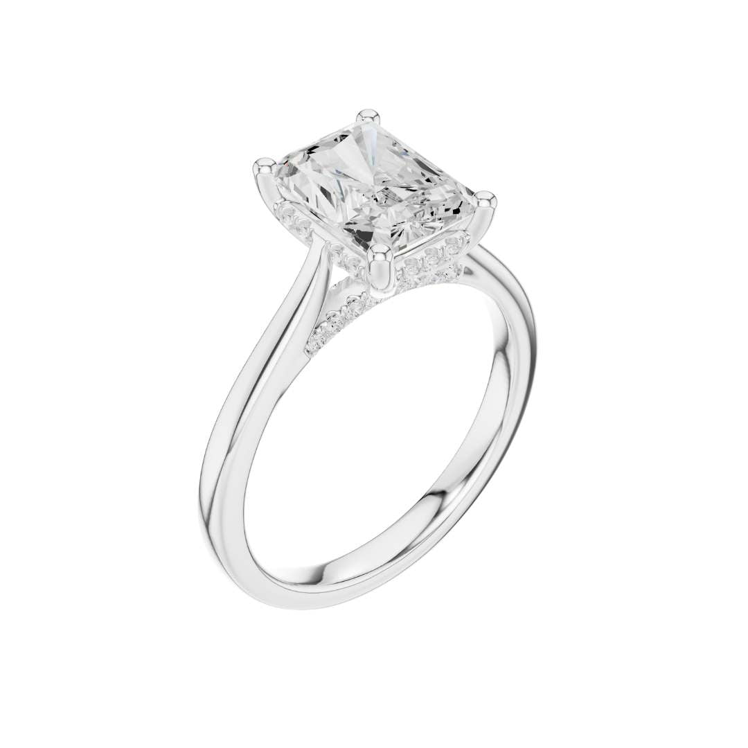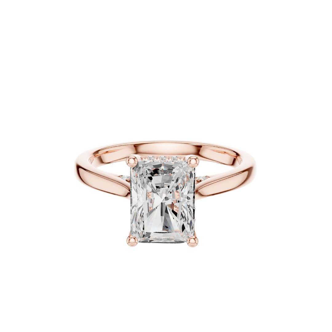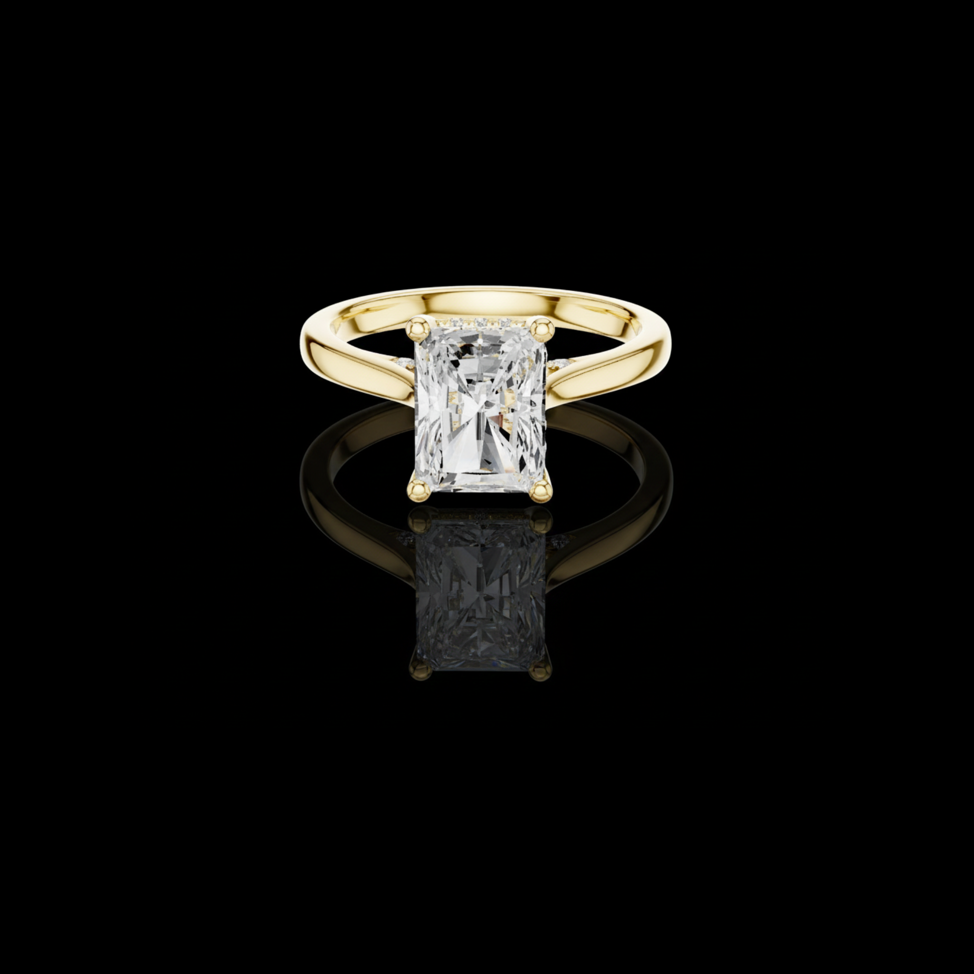 This breathtaking engagement ring showcases a brilliantly faceted radiant-cut diamond held securely in a timeless four-prong setting of polished gold. The radiant cut blends the fire of a round diamonds with the elegant silhouette of a radiant shape, creating exceptional sparkle from every angle. Its smooth, tapered band enhances the stone’s elongated form, offering a luxurious, modern, and effortlessly sophisticated expression of enduring love.