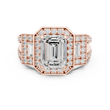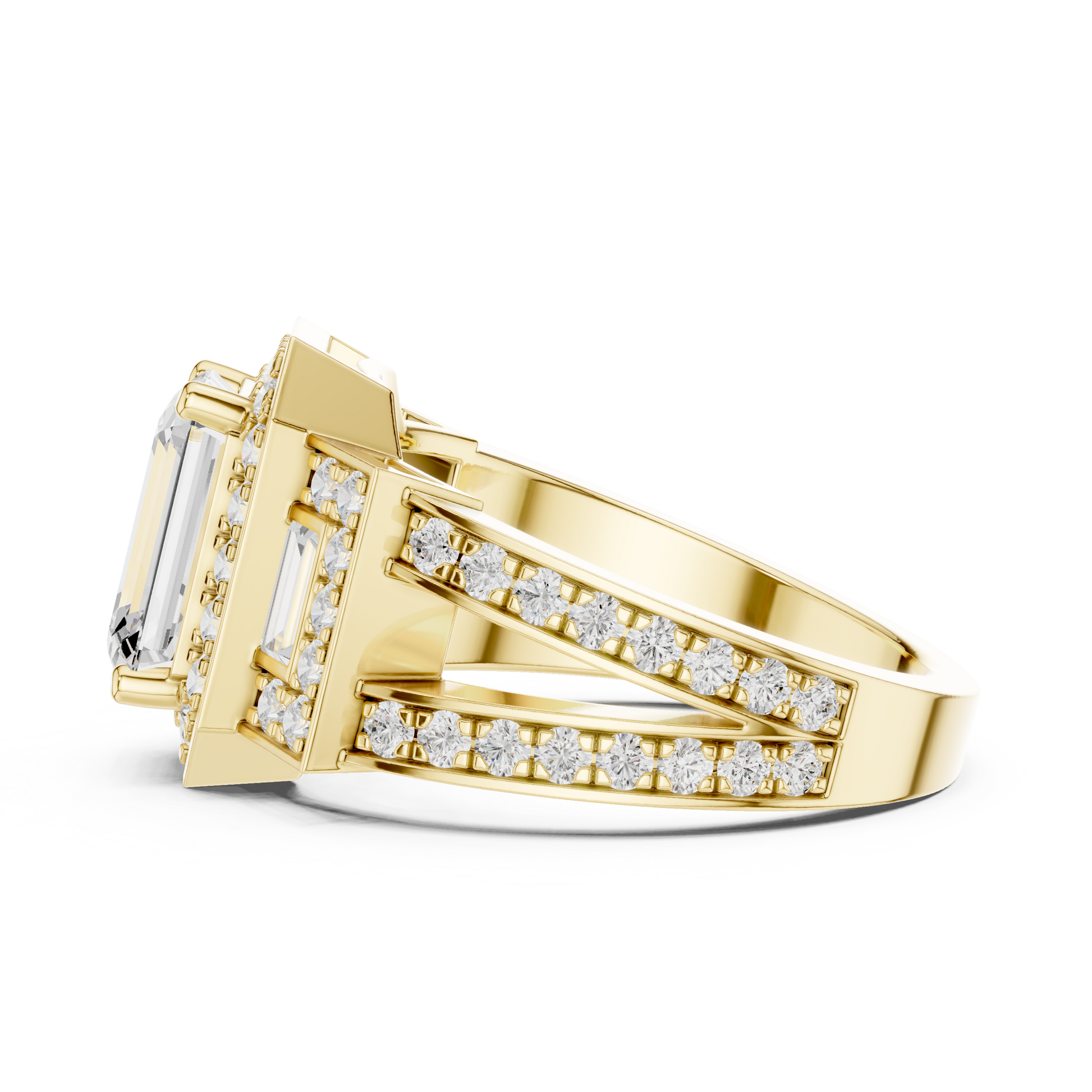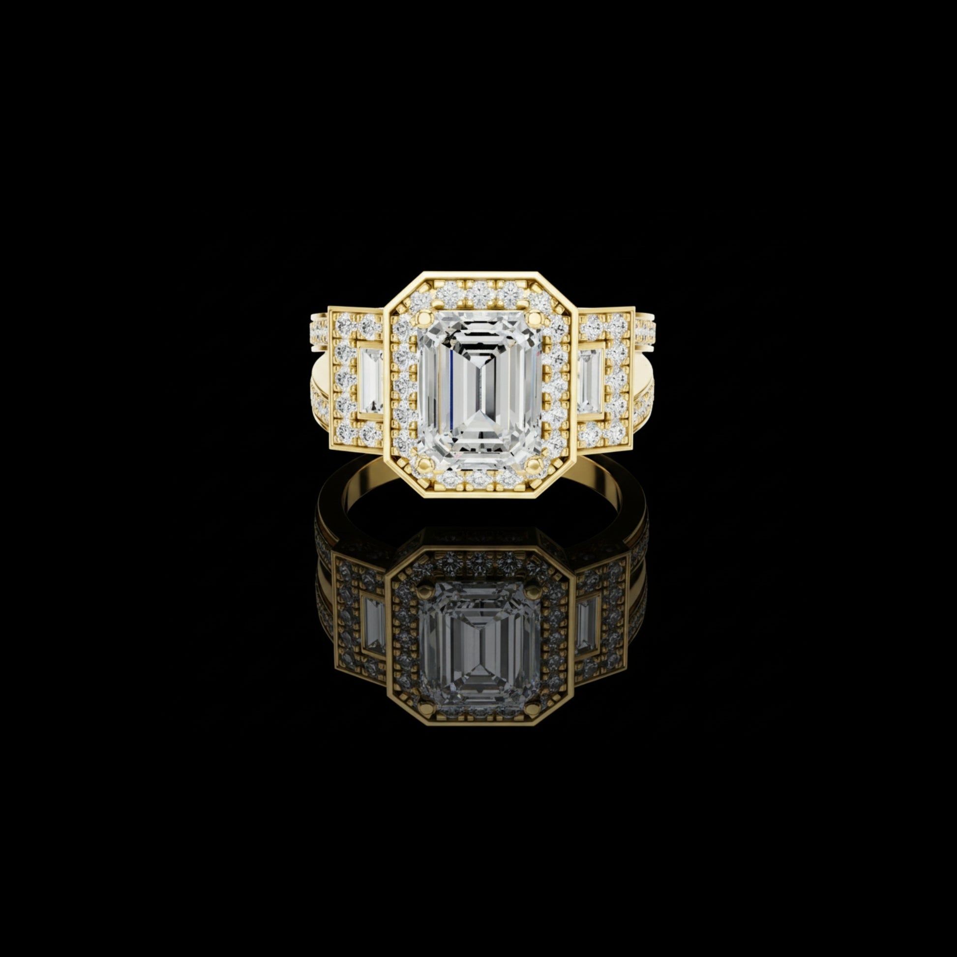 Make a bold and unforgettable statement with this Emerald Cut Three-Stone Double Halo Diamond Ring, exquisitely crafted in radiant gold. The striking emerald-cut center stone is framed by a geometric double halo of fine pavé diamonds, intensifying its depth, clarity, and clean architectural lines. Flanked by matching baguette side stones, each encircled with its own shimmering halo, the design creates a powerful balance of symmetry and brilliance