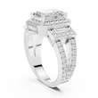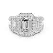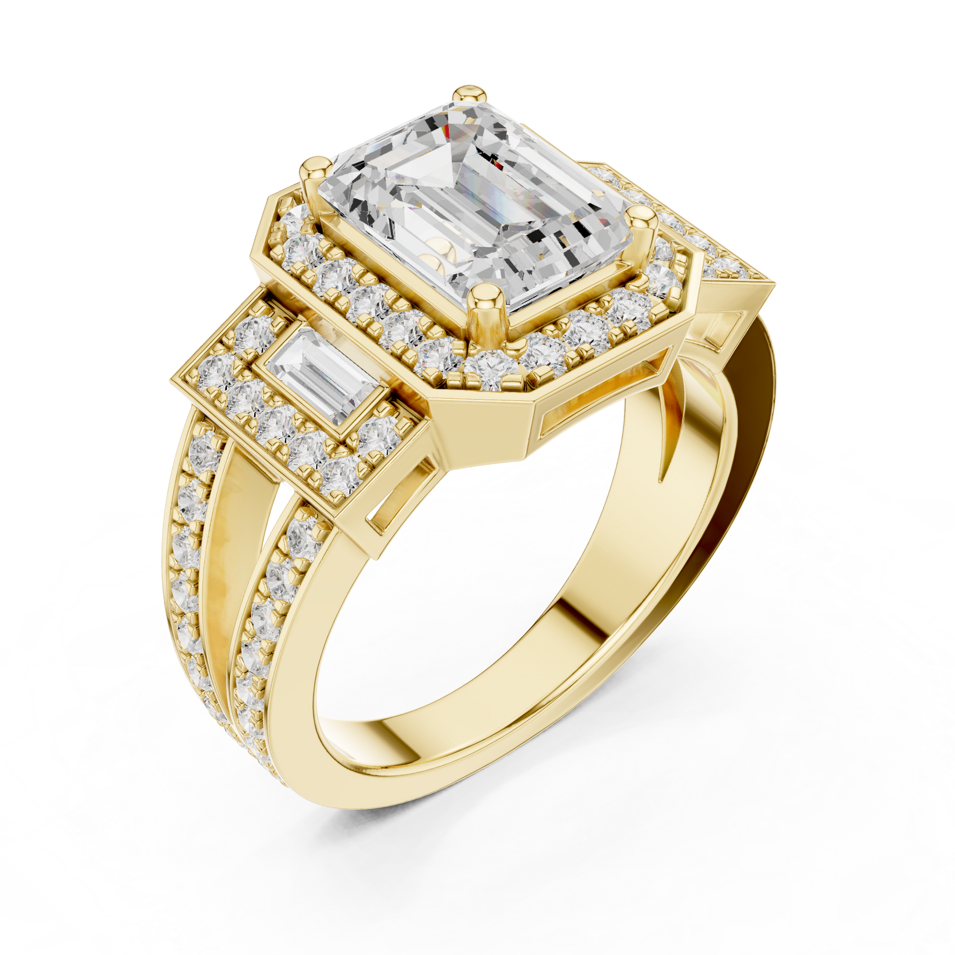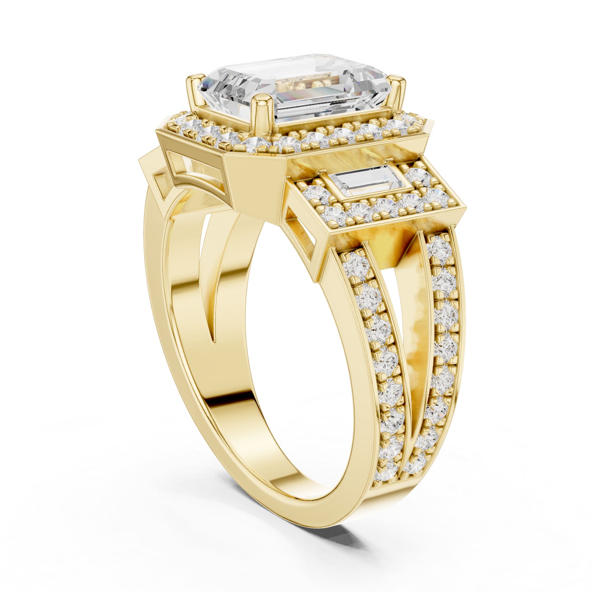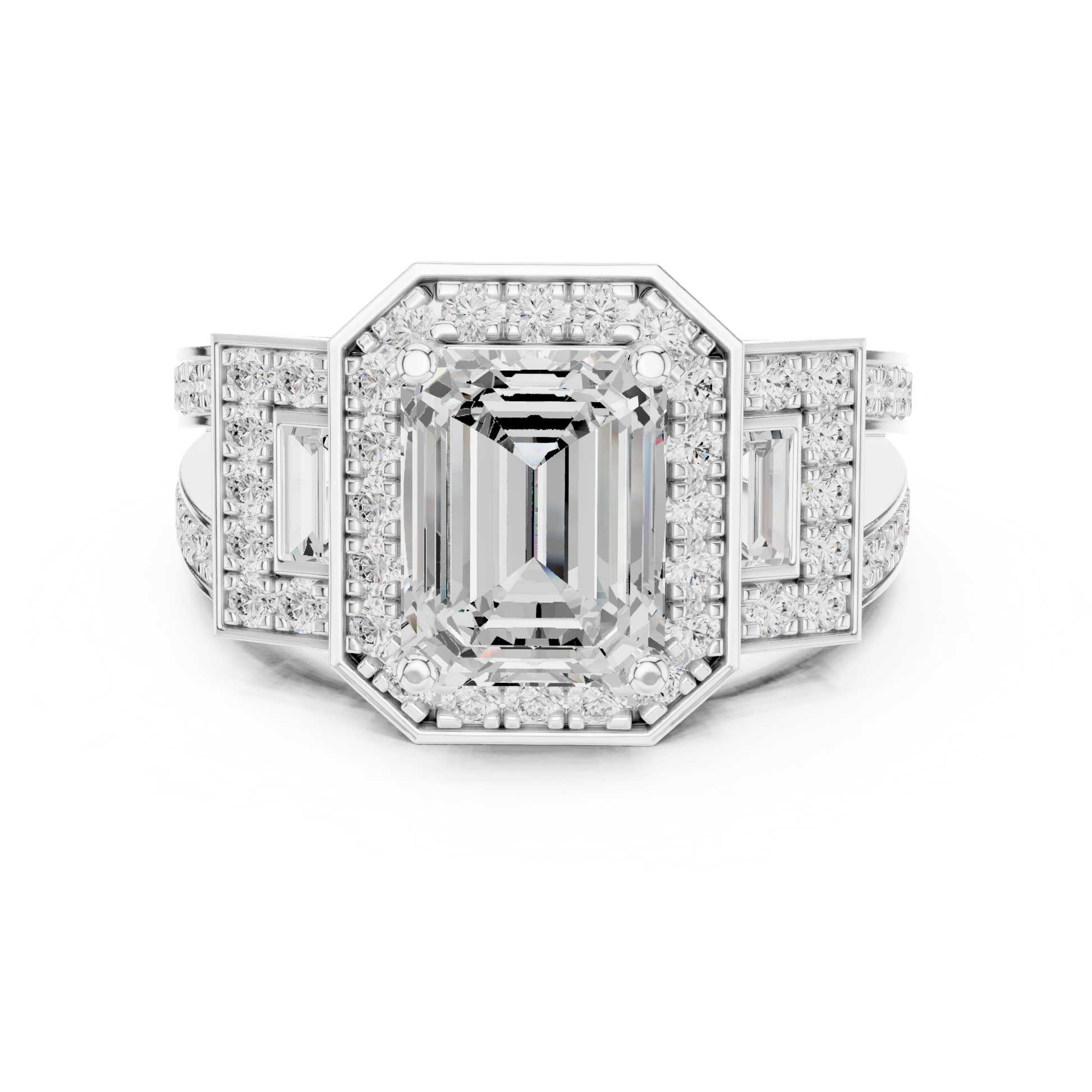 2.5 CT Iconic Statement Emerald Cut Center with Side Baguette Three Stone Double Halo Moissanite Diamond Ring