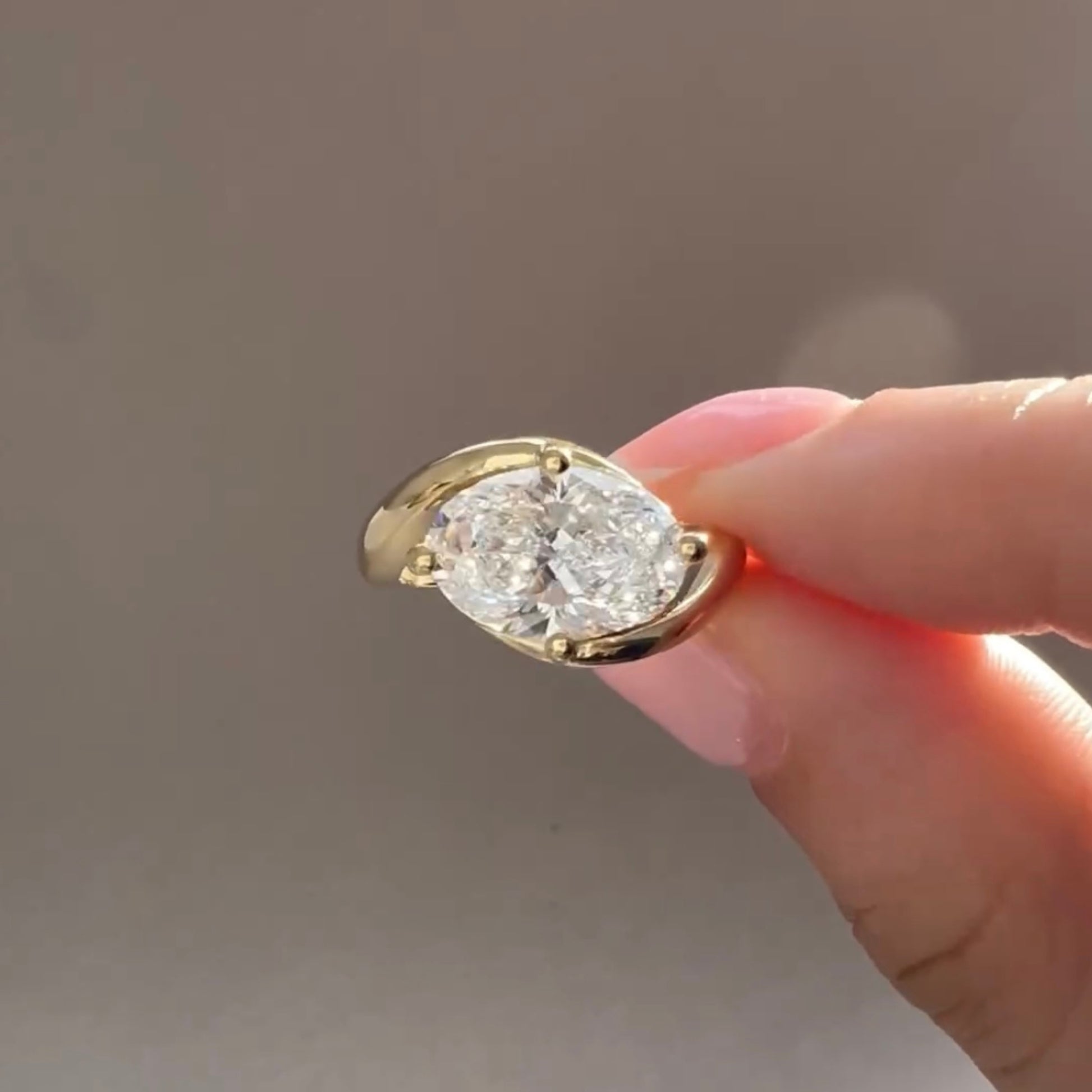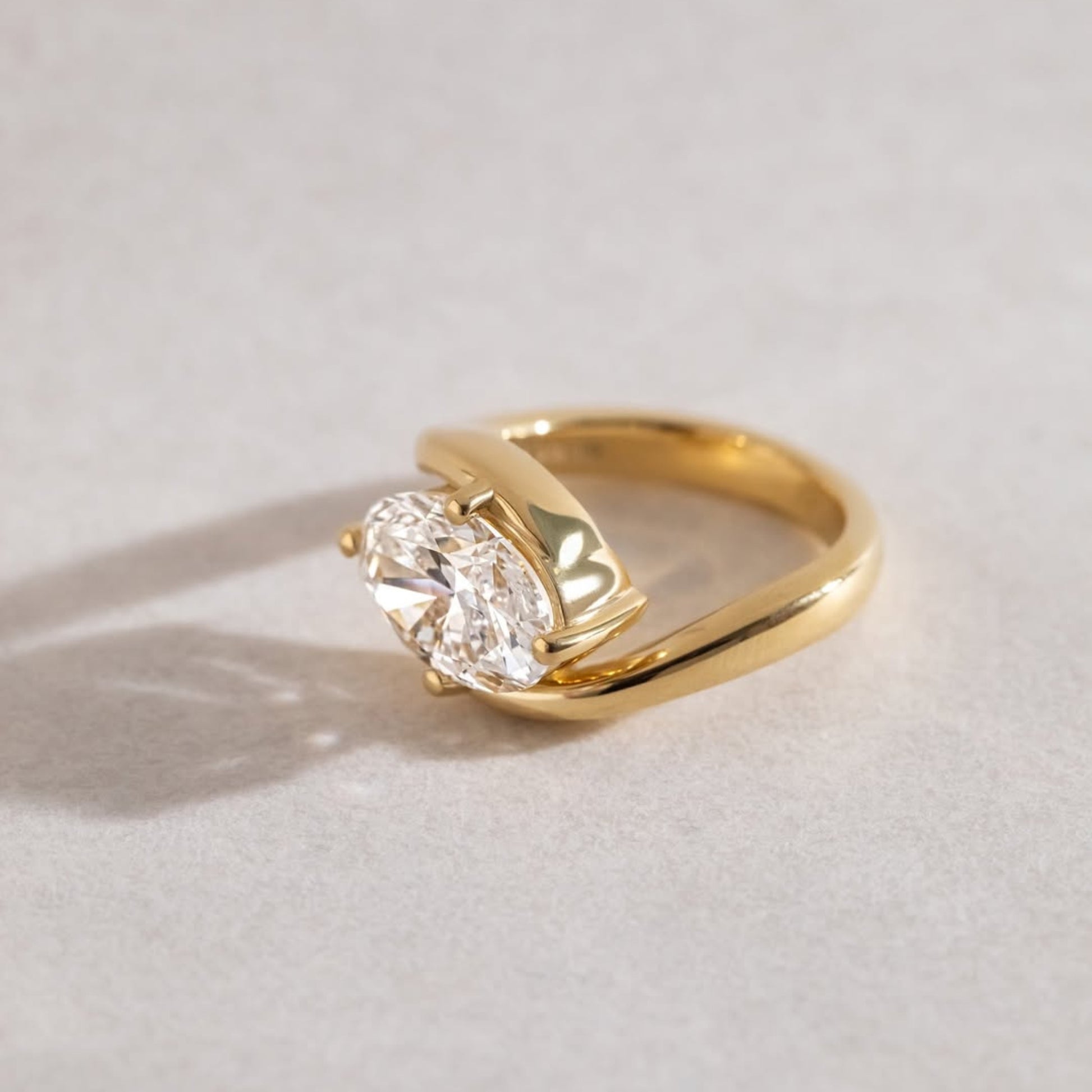 This contemporary oval solitaire ring features a brilliant oval-shaped center stone held securely within a refined bypass-style gold band. The smooth, high-polish finish enhances the stone’s natural sparkle while the sculpted setting offers a modern yet timeless appeal. Designed for everyday elegance and special moments alike, this ring blends minimalism with sophistication, making it an ideal engagement or statement piece.