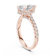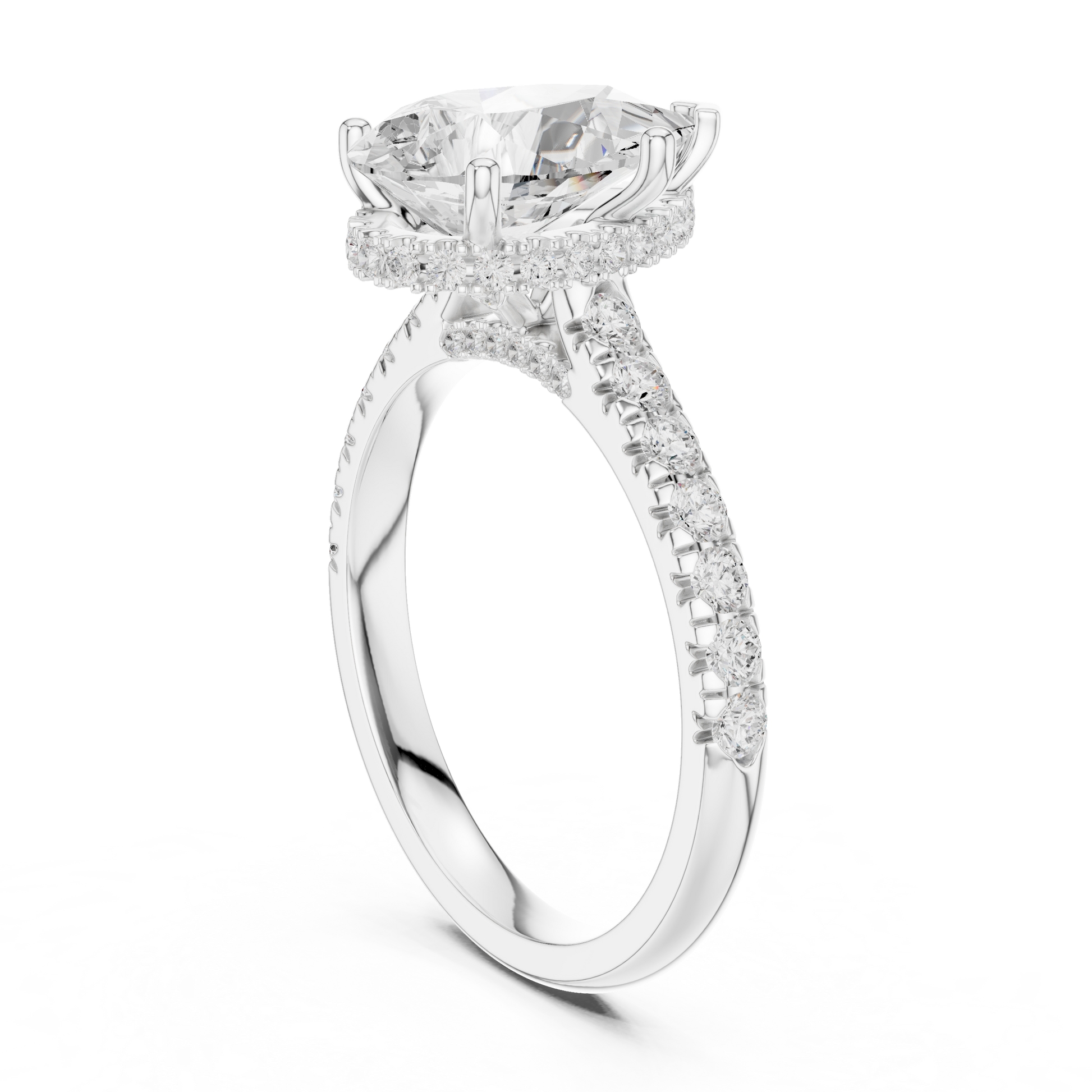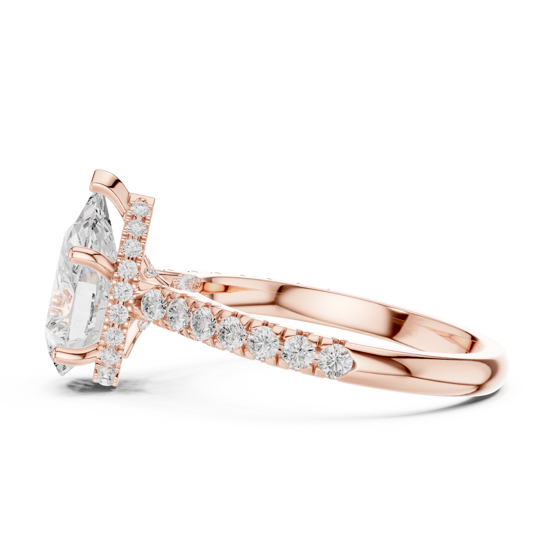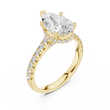 This exquisite pear-cut diamond engagement ring is a true statement of elegance and refined craftsmanship. Designed with a radiant gold band, the ring features a beautifully elevated cathedral setting accented with sparkling pavé diamonds along the shank. The pear-shaped center stone is perfectly secured, creating a graceful silhouette that catches light from every angle.
