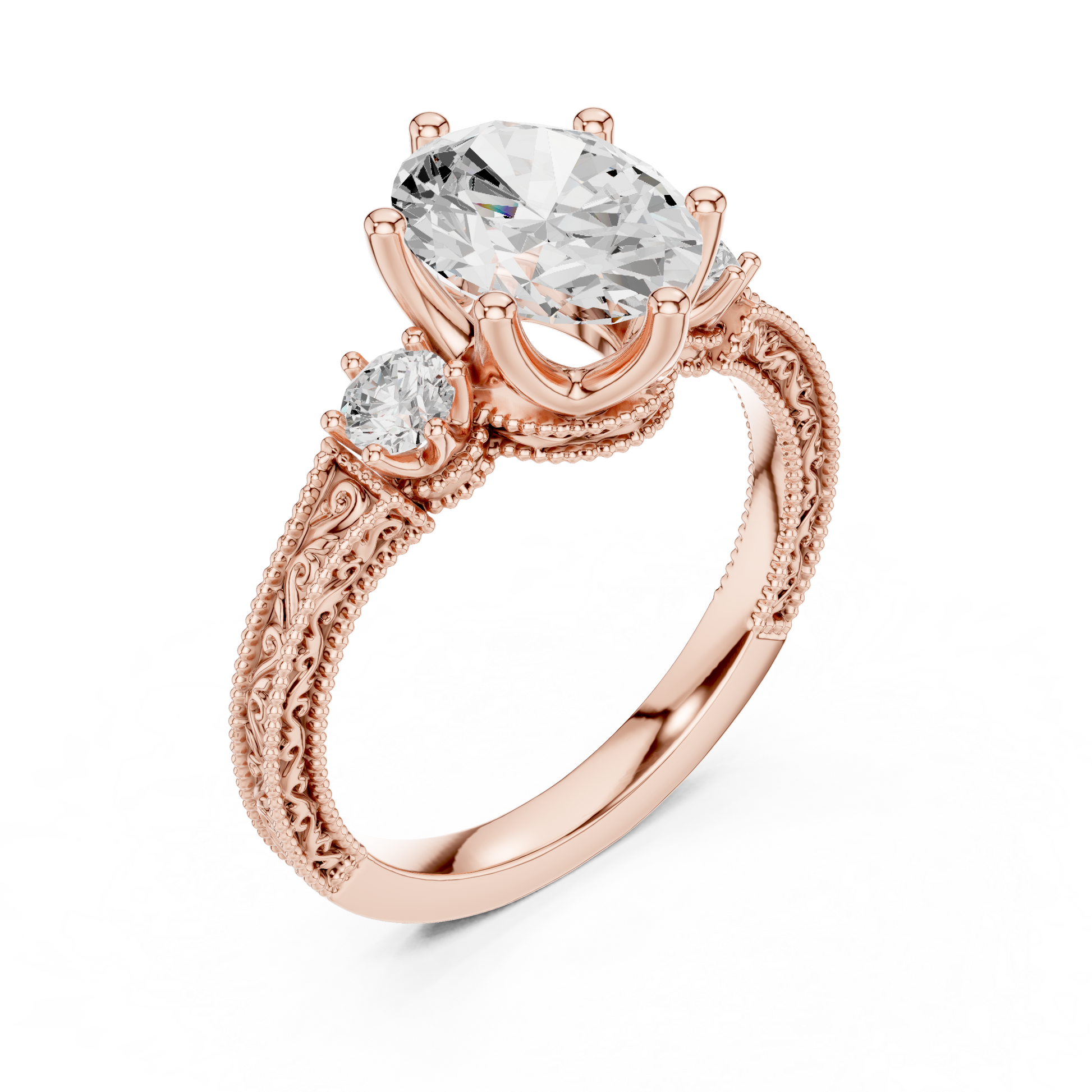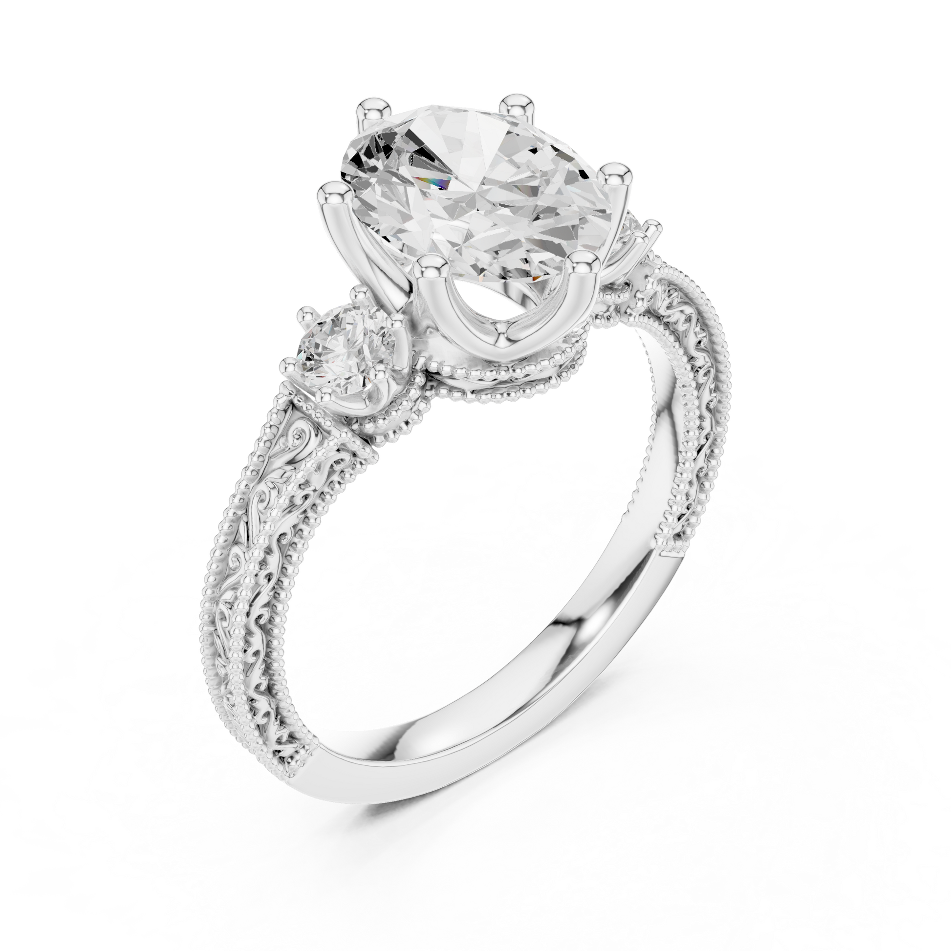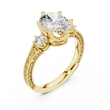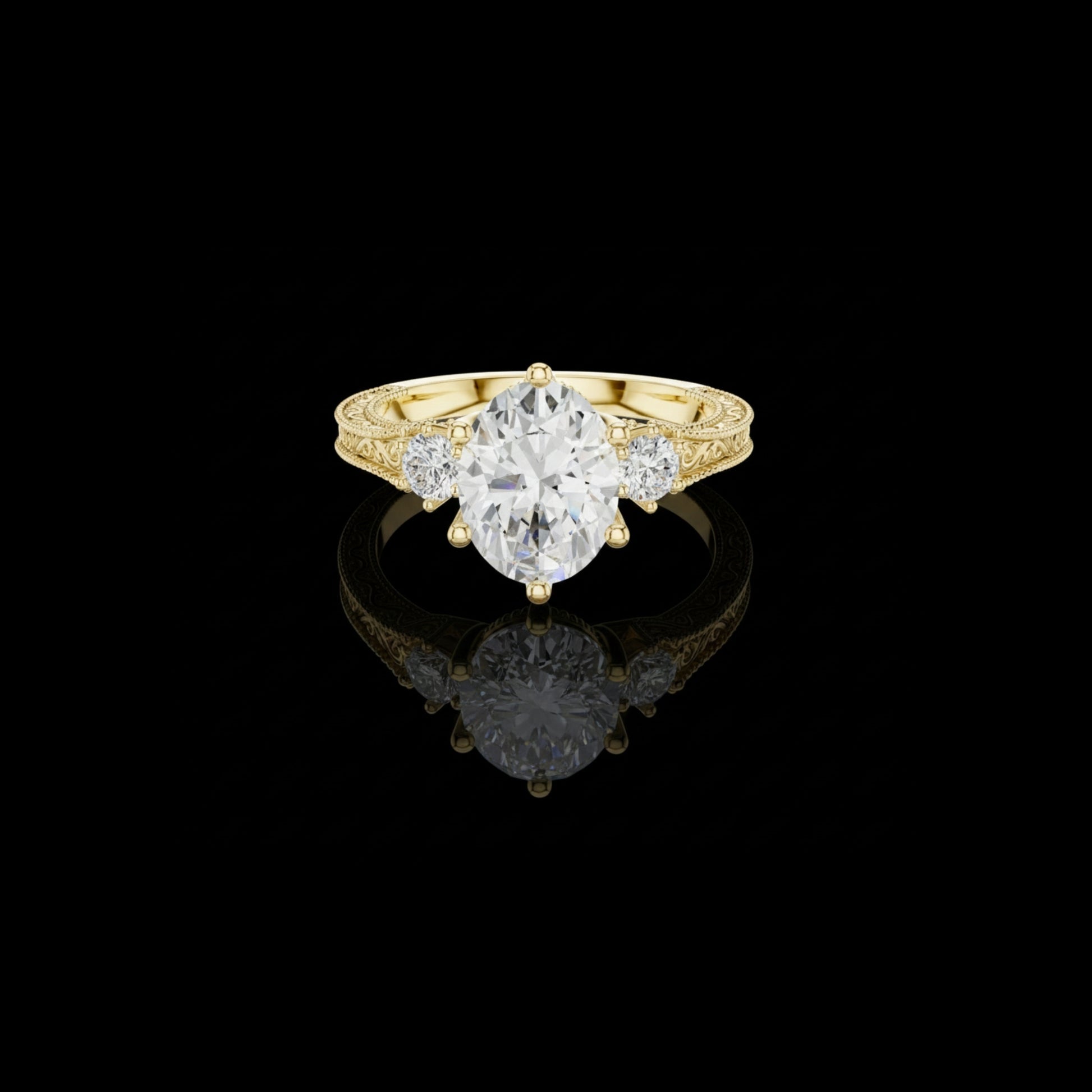 This exquisite vintage-inspired ring features a brilliant oval-cut center diamond flanked by two round side stones, creating a balanced and romantic three-stone silhouette. The yellow gold band is richly detailed with intricate antique-style engravings and milgrain beading, adding depth, artistry, and heirloom charm. Designed for those who appreciate timeless beauty with a touch of old-world craftsmanship, this ring is a stunning choice for engagements, anniversaries, or anyone seeking a distinctive and elegant statement piece.
