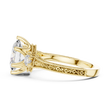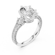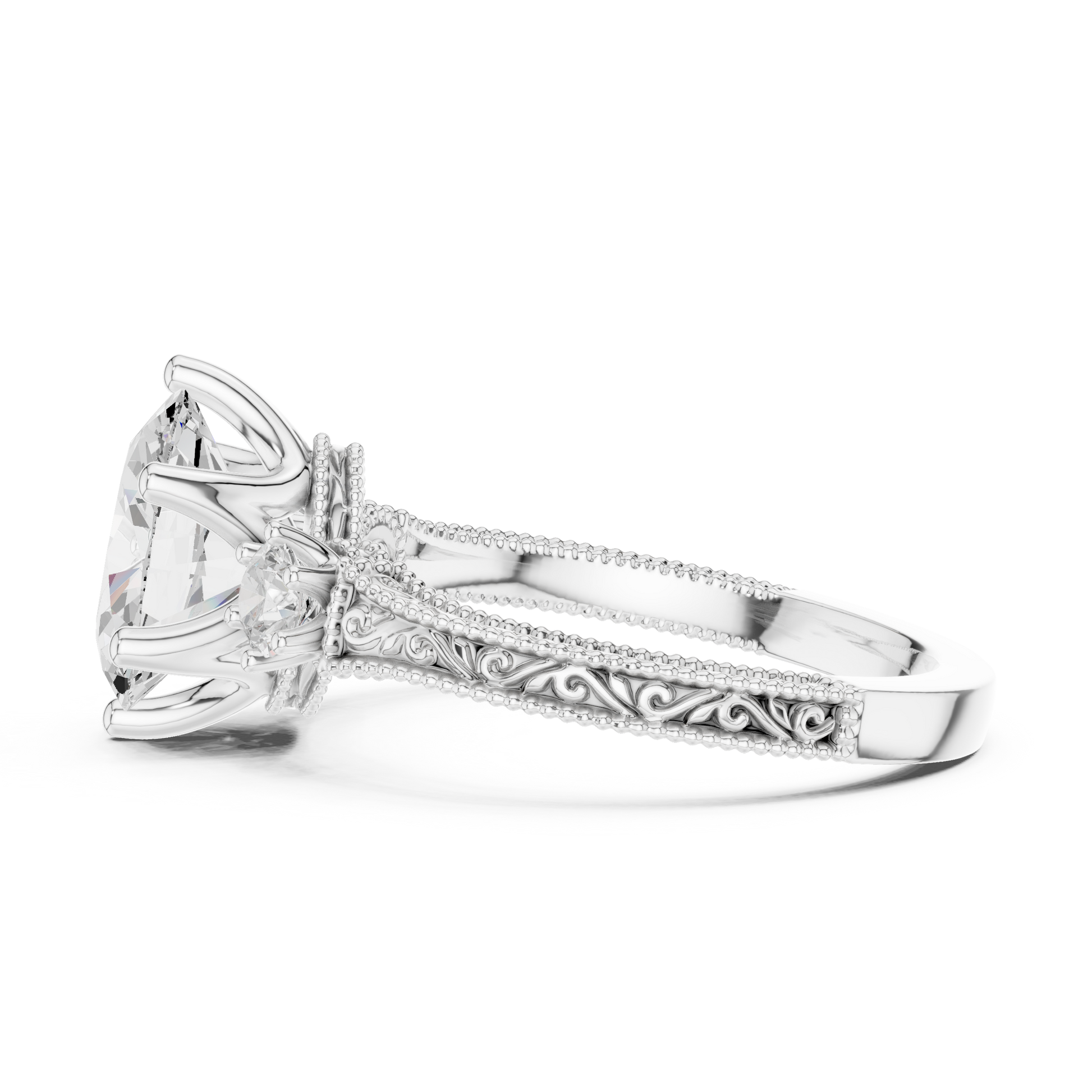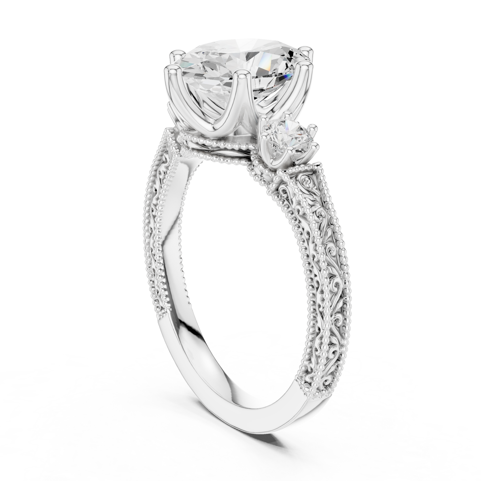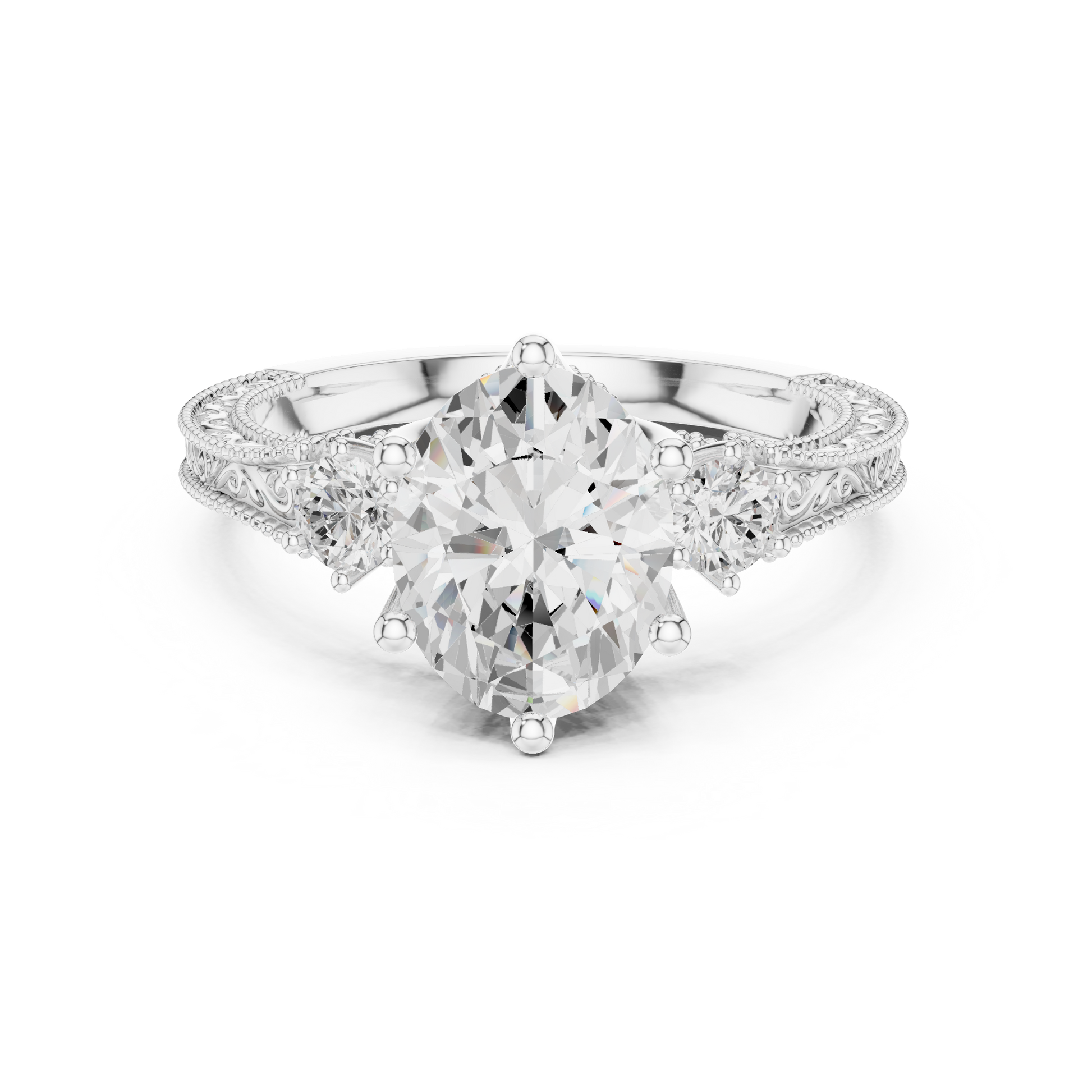 This exquisite vintage-inspired ring features a brilliant oval-cut center diamond flanked by two round side stones, creating a balanced and romantic three-stone silhouette. The yellow gold band is richly detailed with intricate antique-style engravings and milgrain beading, adding depth, artistry, and heirloom charm. Designed for those who appreciate timeless beauty with a touch of old-world craftsmanship, this ring is a stunning choice for engagements, anniversaries, or anyone seeking a distinctive and elegant statement piece.