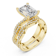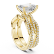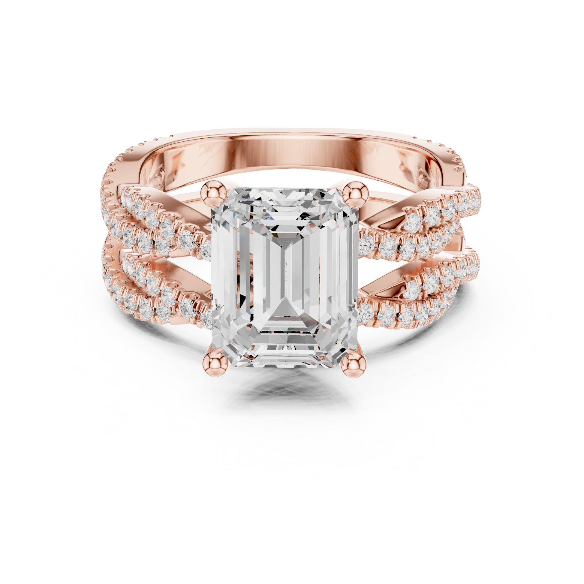 This refined gold ring features a striking emerald-cut center diamond secured in a classic four-prong setting. The bold split-shank design is accented with shimmering pavé diamonds, creating depth, brilliance, and architectural beauty. Designed for modern brides and luxury jewelry lovers, this piece delivers timeless sophistication with a contemporary edge—perfect for engagements, anniversaries, or unforgettable moments.