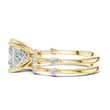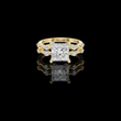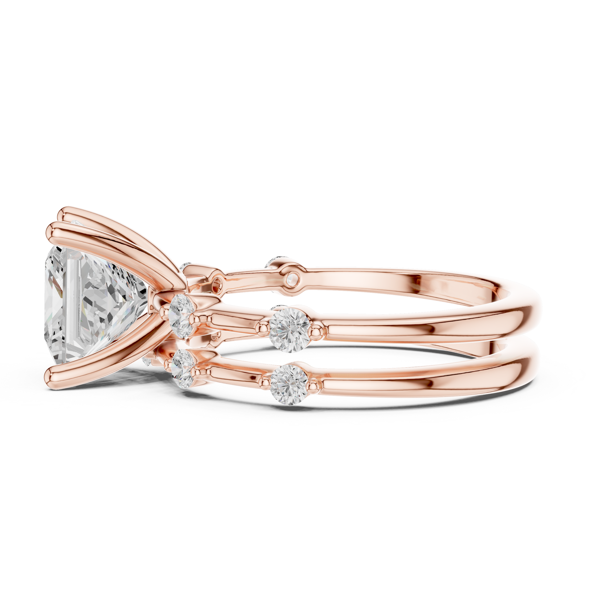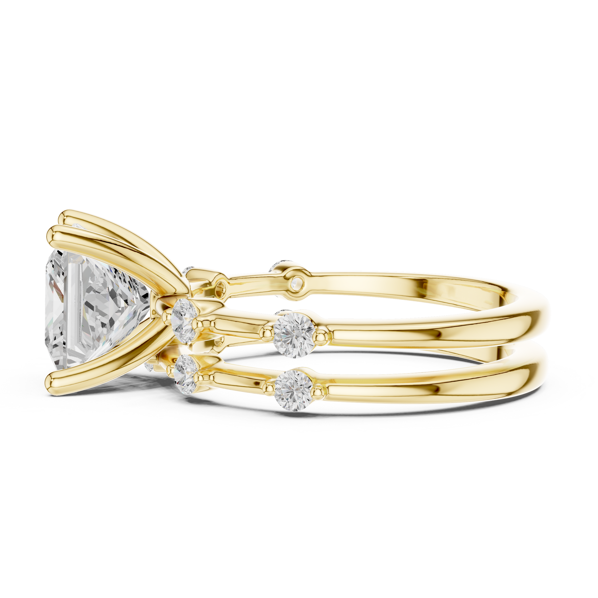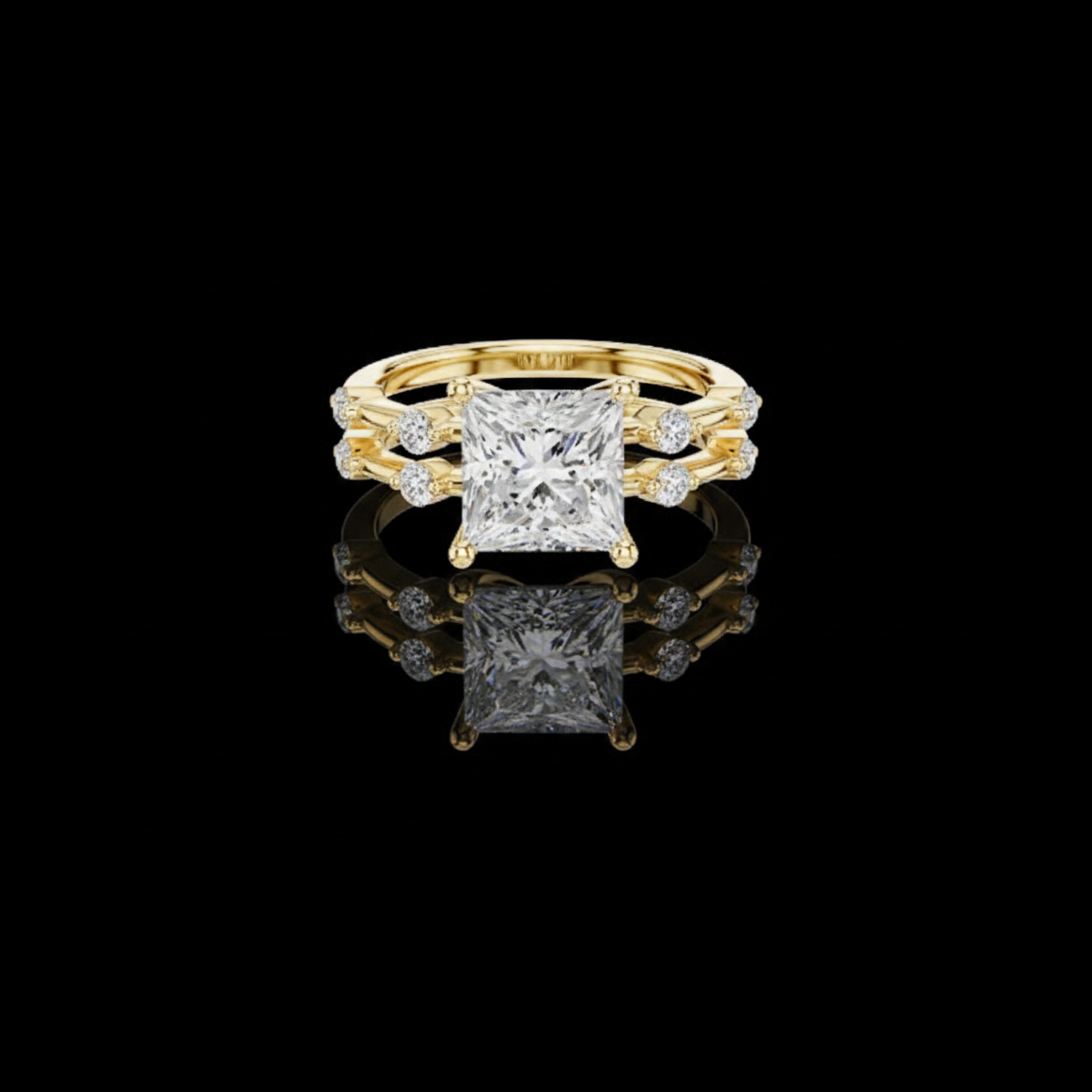This striking ring features a brilliant princess-cut center diamond set in radiant gold, framed by a distinctive double-band design that adds depth and modern elegance. Round diamond accents are gracefully set along the bands, enhancing sparkle and creating a bold yet refined look from every angle. Blending contemporary style with timeless craftsmanship, this ring is designed for those who appreciate a statement of strength, beauty, and everlasting love.