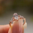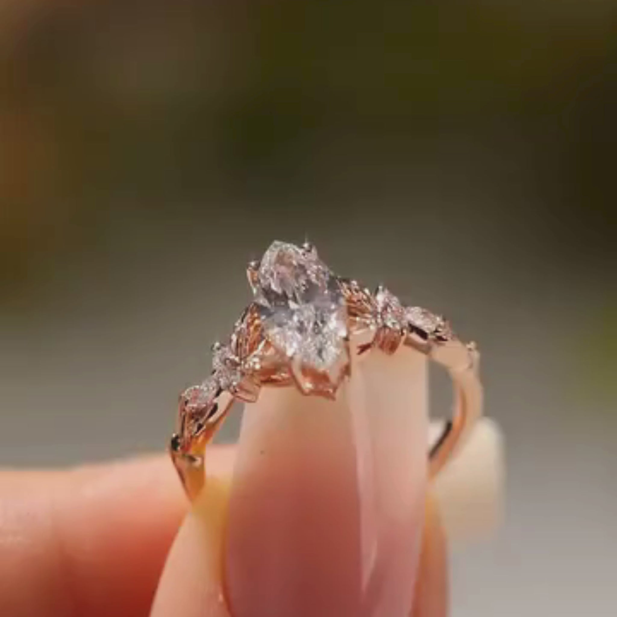 This exquisite engagement ring features a dazzling marquise-cut diamond set in warm rose gold, radiating elegance and charm. The slender band is enhanced with delicate floral-inspired accents and petite diamonds, adding soft sparkle and refined detail from every angle. Designed with a graceful profile and romantic character, this ring is perfect for those who love timeless beauty with an artistic, feminine touch.