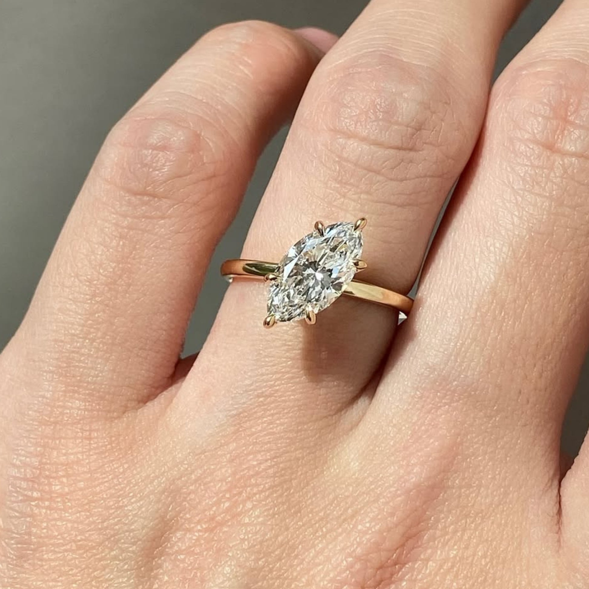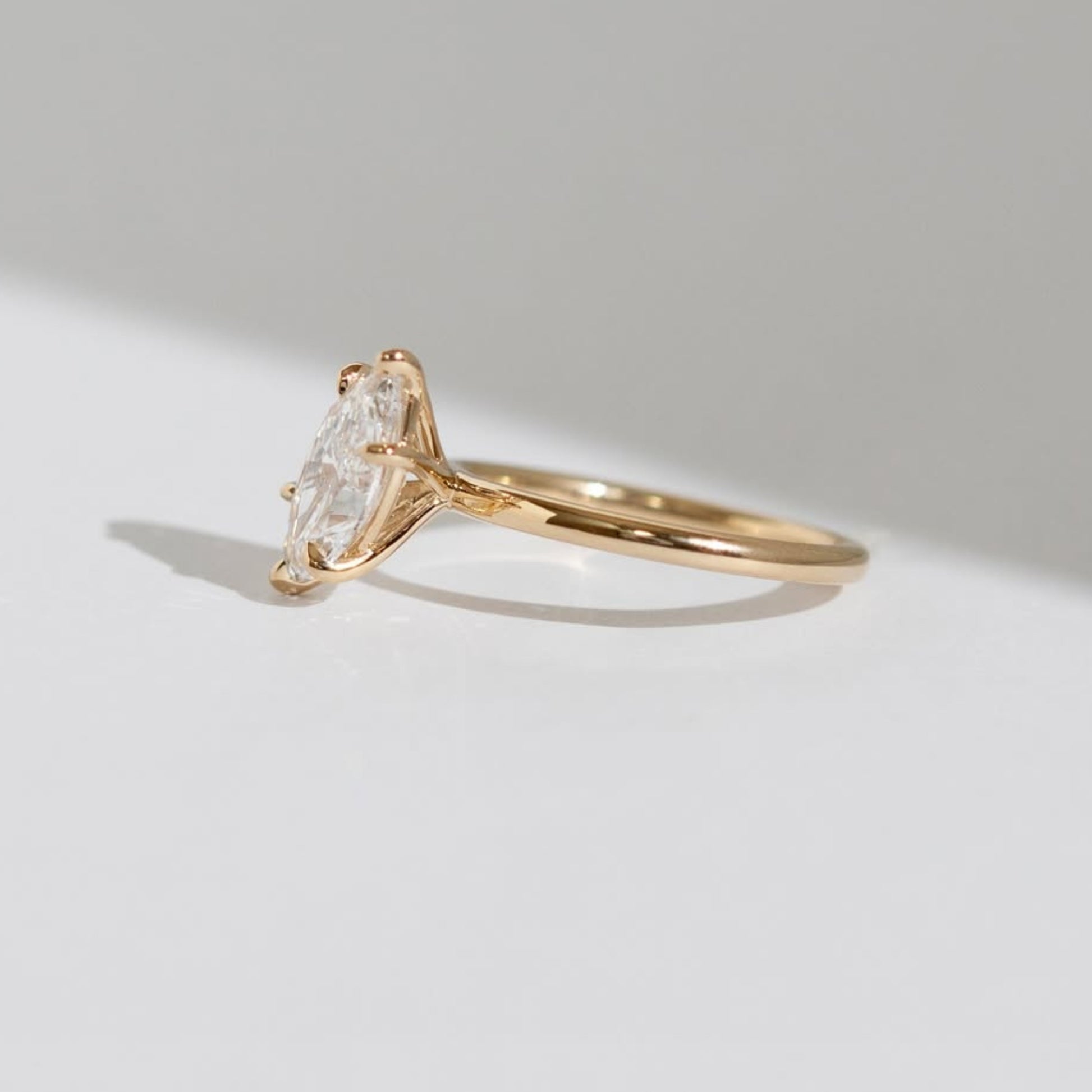This refined ring features a striking marquise cut Moissanite diamond, admired for its elongated silhouette and exceptional brilliance. Set in a classic four-prong solitaire setting, the center stone takes full focus, allowing its shape and fire to shine effortlessly. The marquise cut creates a flattering look on the hand, symbolizing romance, confidence, and timeless sophistication. Perfect for a modern engagement, meaningful proposal, or elegant everyday luxury, this ring represents ethical craftsmanship, enduring design, and a love that stands apart.