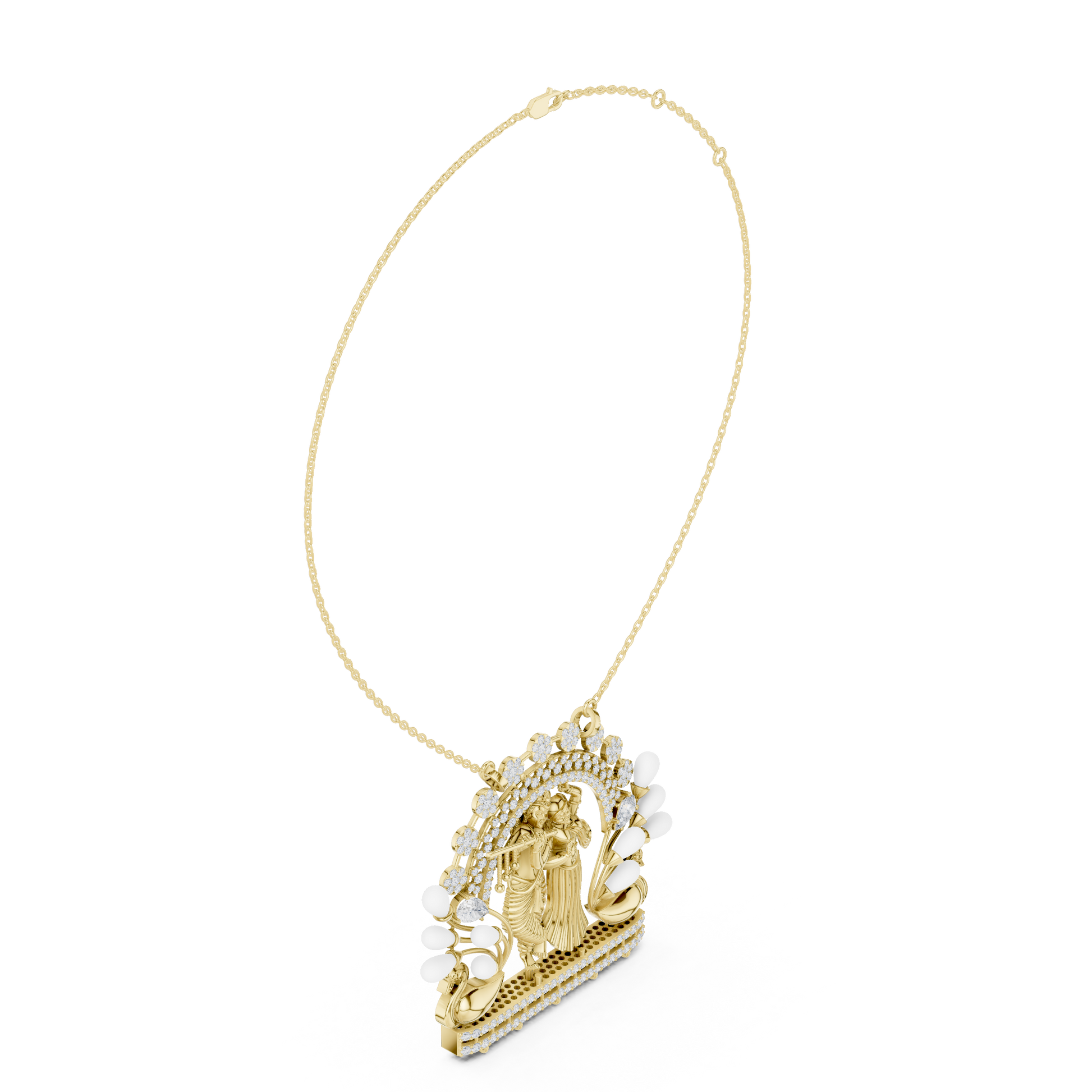 This elegant Radha Krishna pendant showcases divine artistry with a radiant gold-polished finish, intricate sculpted detailing, and sparkling diamond-like stones framed in a graceful peacock-inspired design. this piece blends spiritual symbolism with refined craftsmanship, making it perfect for daily devotion, festive wear, or meaningful gifting. A timeless expression of faith, love, and luxury.