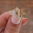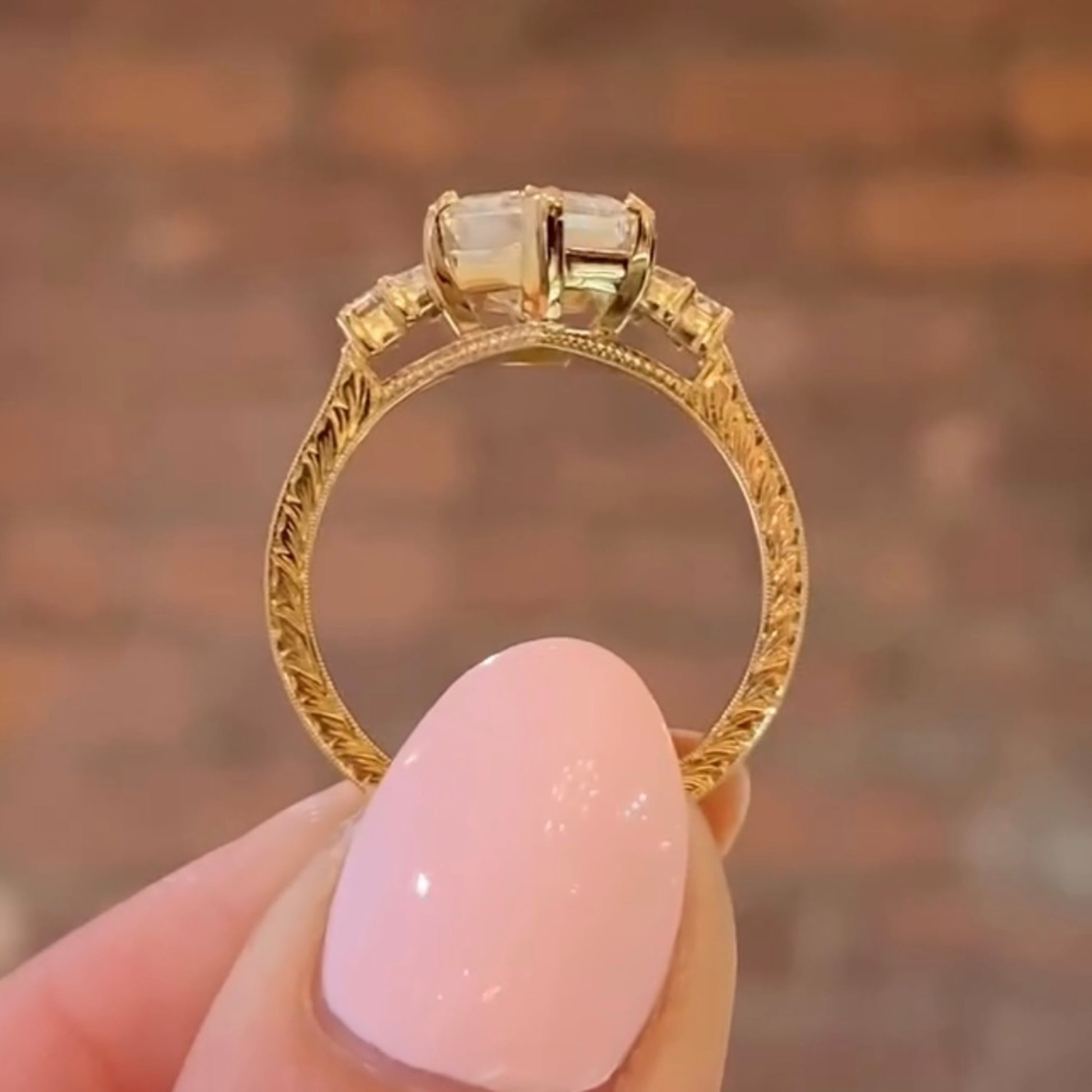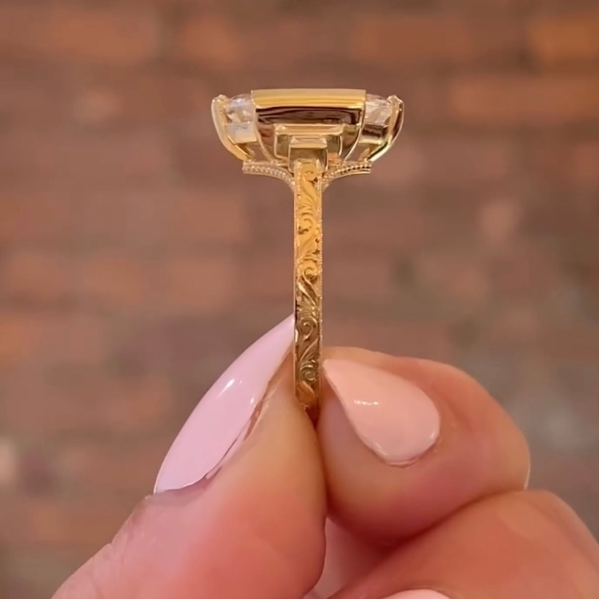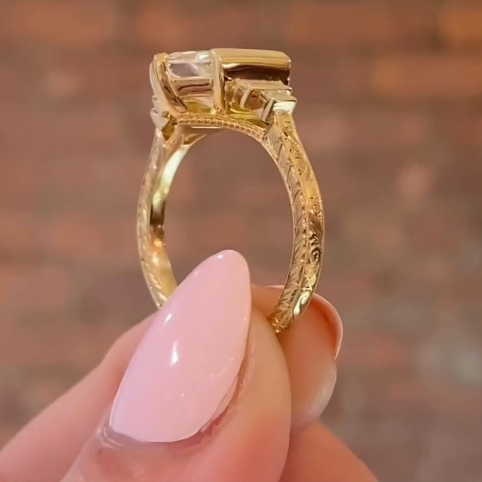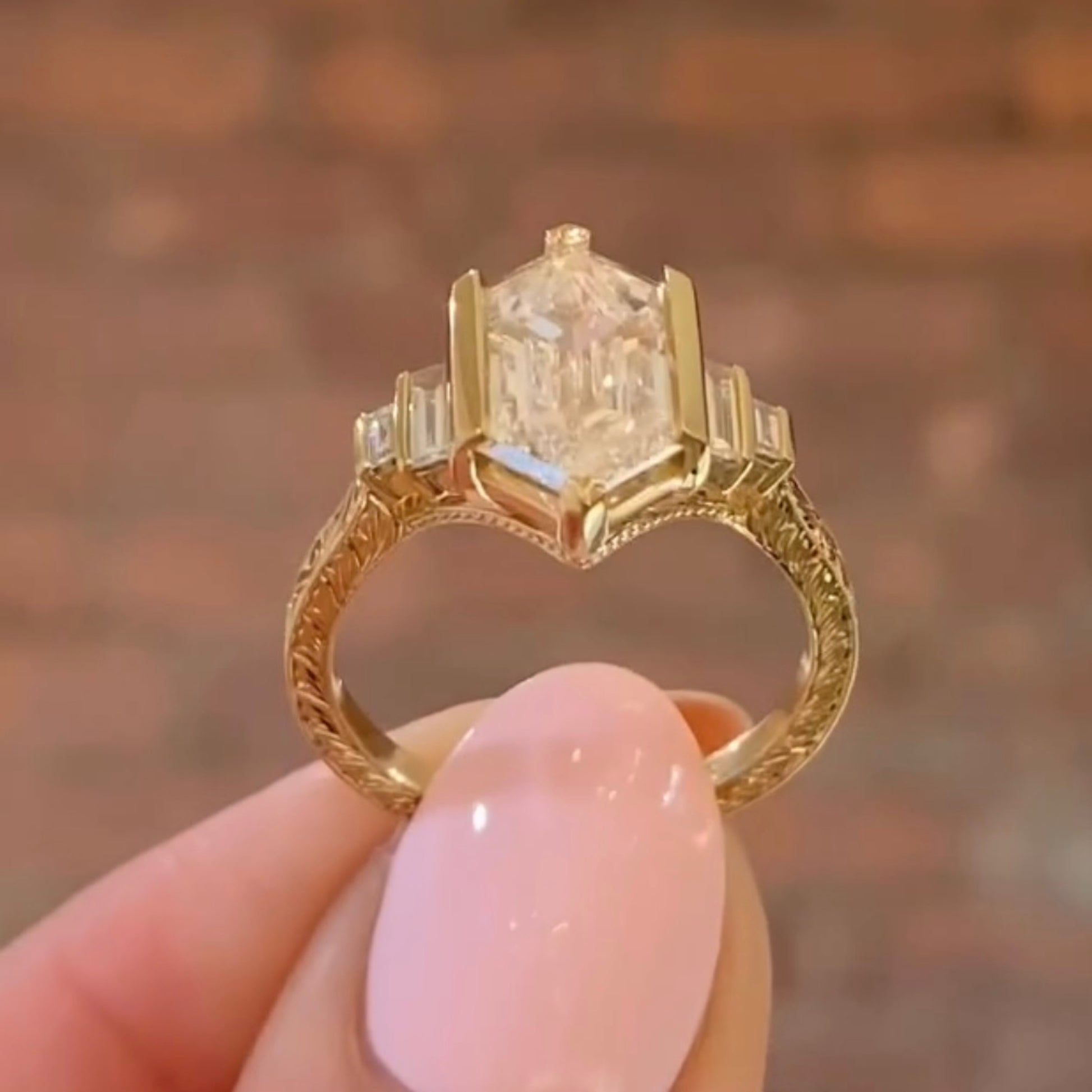 This striking ring showcases an elongated antique-cut diamond set in a bold, architectural design that blends modern symmetry with refined elegance. Flanked by sleek baguette diamonds arranged in a stepped formation, the center stone is beautifully balanced to create a sculptural, Art-Deco–inspired look. Crafted in lustrous gold, the clean lines and mirror-like facets enhance brilliance while delivering a confident, contemporary statement ideal for an engagement or standout fine jewelry piece.