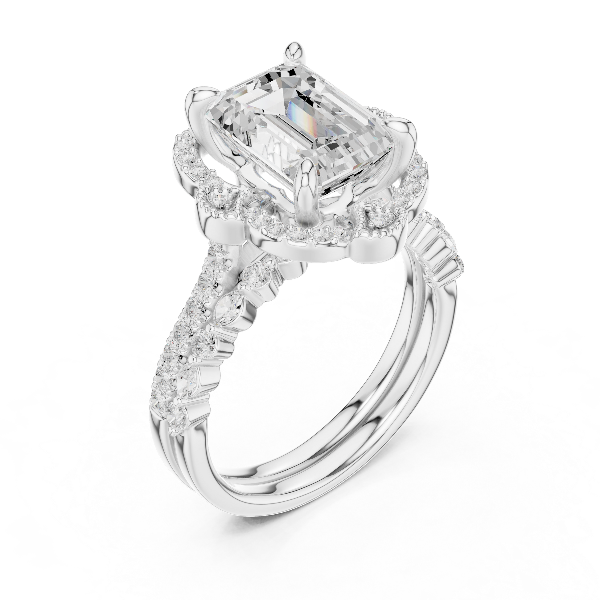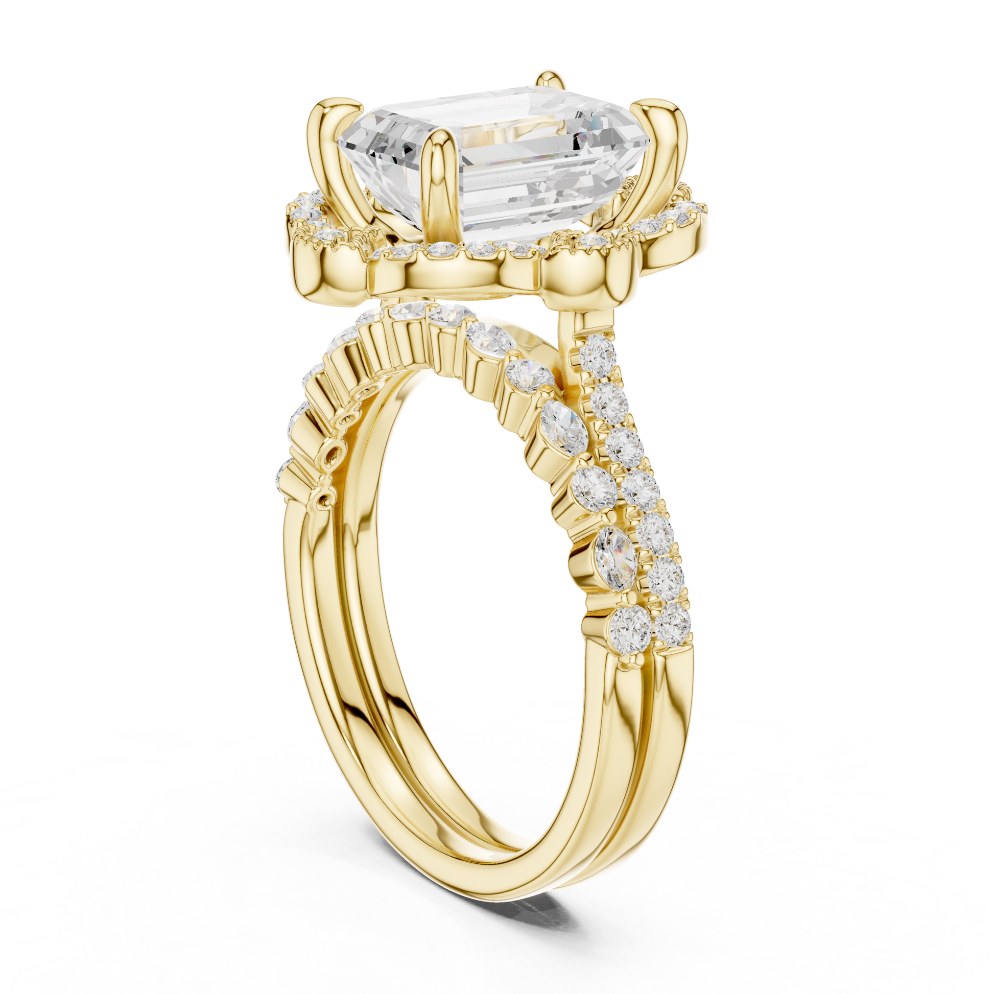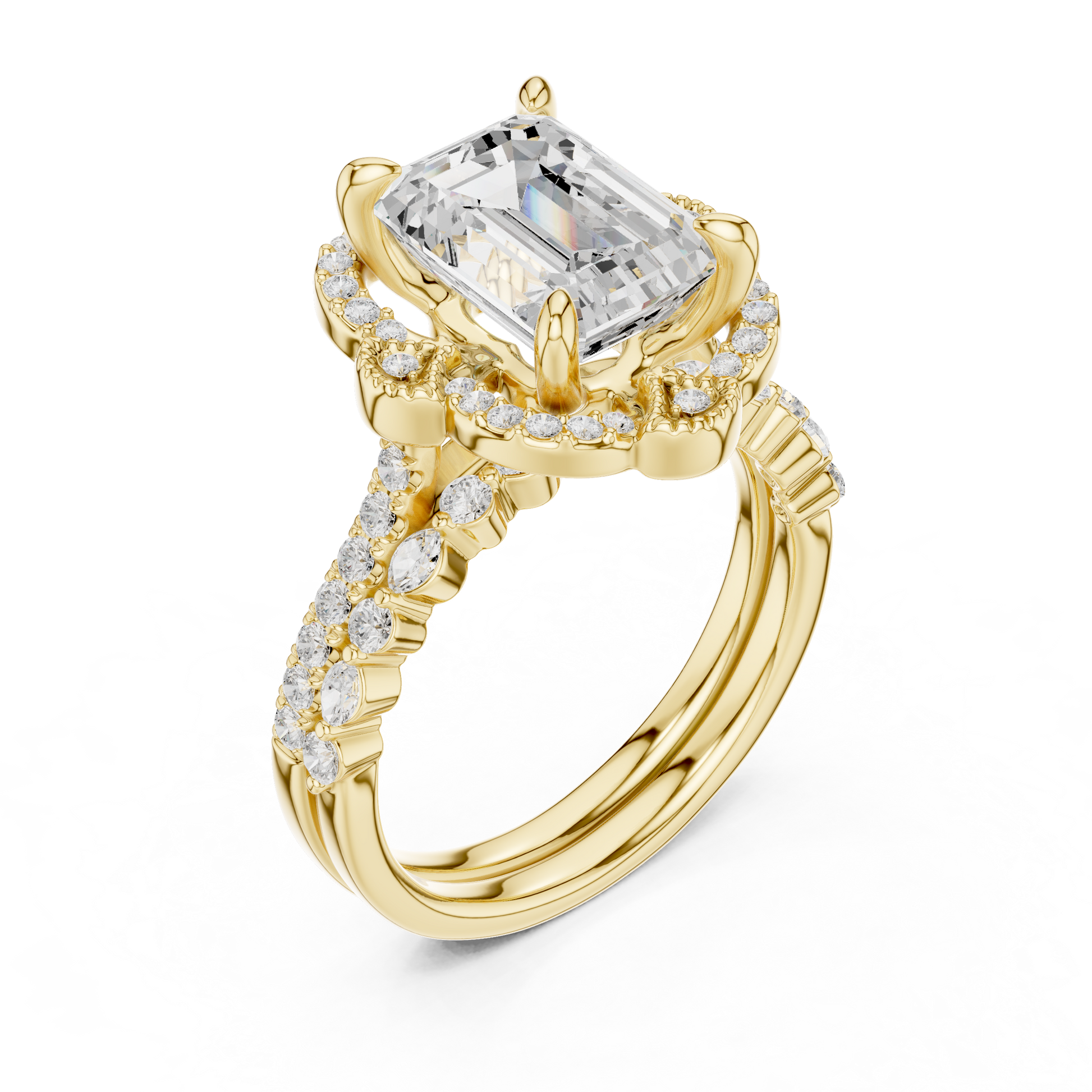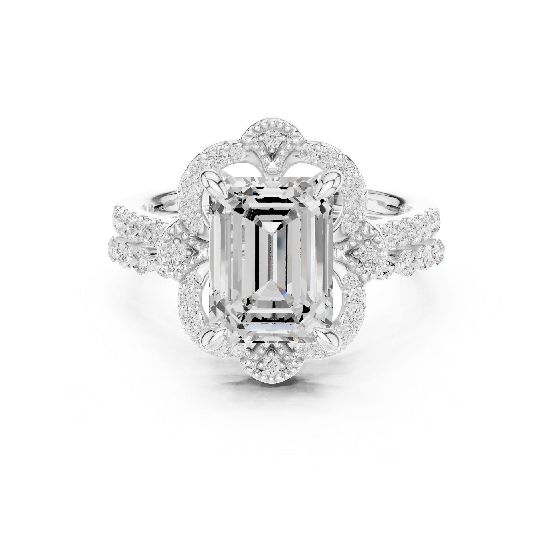 This exquisite ring showcases a striking emerald-cut center diamond, framed by an ornate scalloped halo of brilliant round diamonds that evoke timeless vintage elegance. Crafted in warm gold, the intricate halo design features delicate milgrain detailing and graceful floral-inspired contours, while the diamond-adorned band adds continuous sparkle from every angle. The combination of bold geometry and romantic craftsmanship creates a captivating balance of sophistication and charm, making this ring a breathtaking statement of enduring beauty and refined luxury.