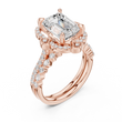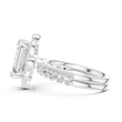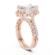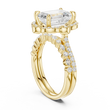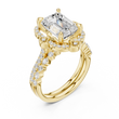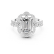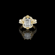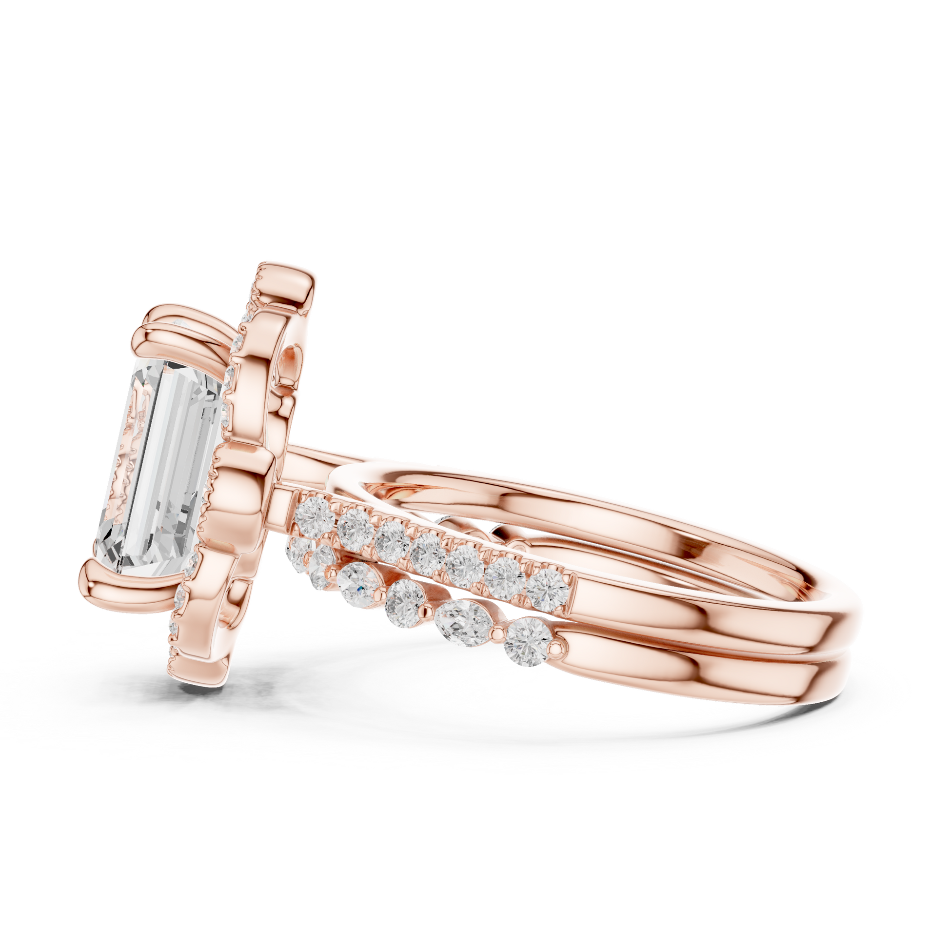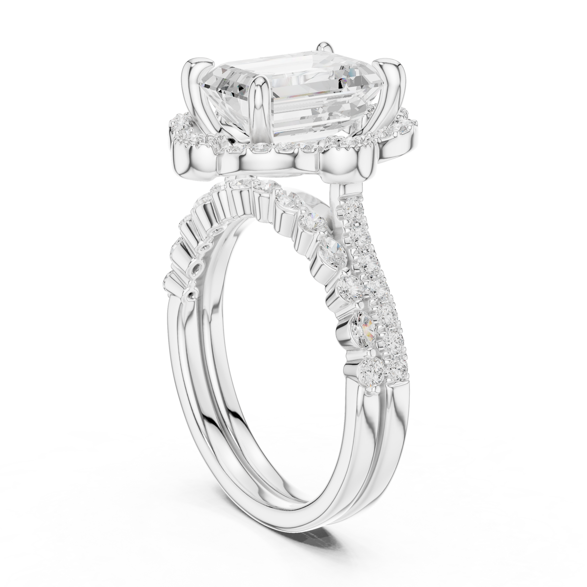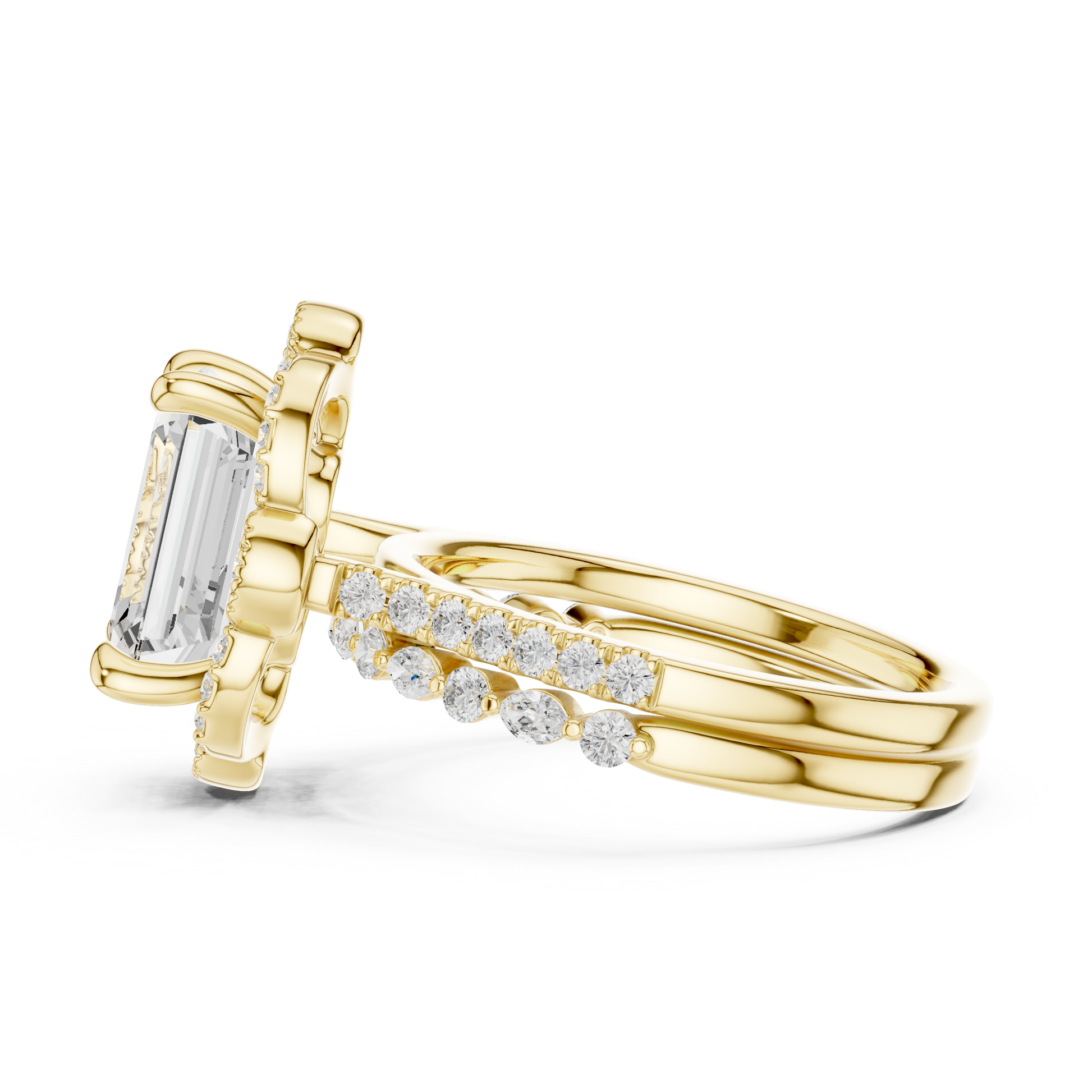 This exquisite ring showcases a striking emerald-cut center diamond, framed by an ornate scalloped halo of brilliant round diamonds that evoke timeless vintage elegance. Crafted in warm gold, the intricate halo design features delicate milgrain detailing and graceful floral-inspired contours, while the diamond-adorned band adds continuous sparkle from every angle. The combination of bold geometry and romantic craftsmanship creates a captivating balance of sophistication and charm, making this ring a breathtaking statement of enduring beauty and refined luxury.