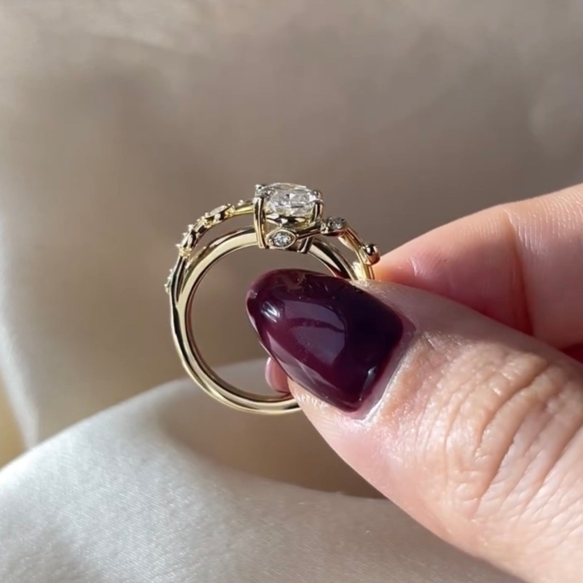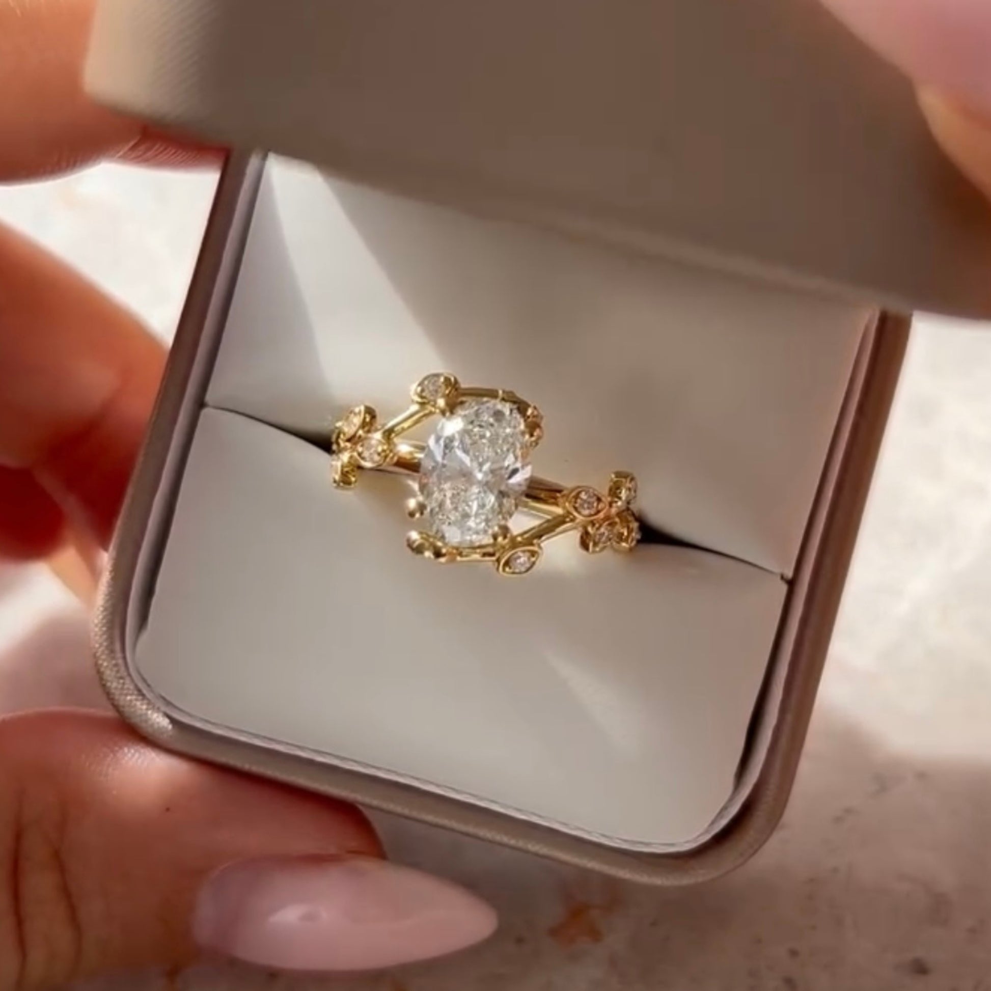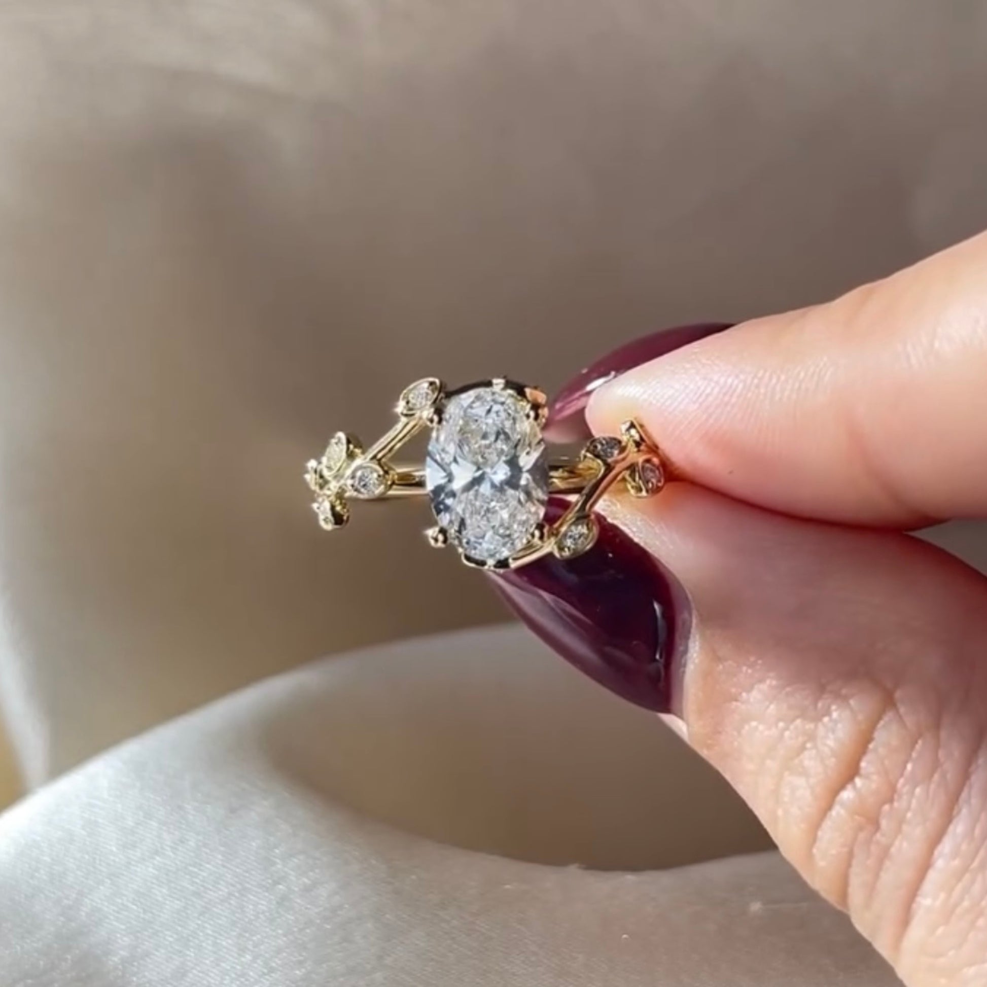 This oval diamond engagement ring features a luminous oval-cut diamond set in rich gold with intricate vintage floral detailing. Delicate accent diamonds and an ornate handcrafted setting create a look that feels romantic, royal, and timeless. Designed for those who adore heirloom-inspired luxury, this ring is perfect as a statement engagement ring or a forever love symbol.