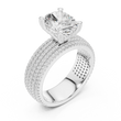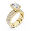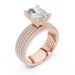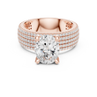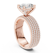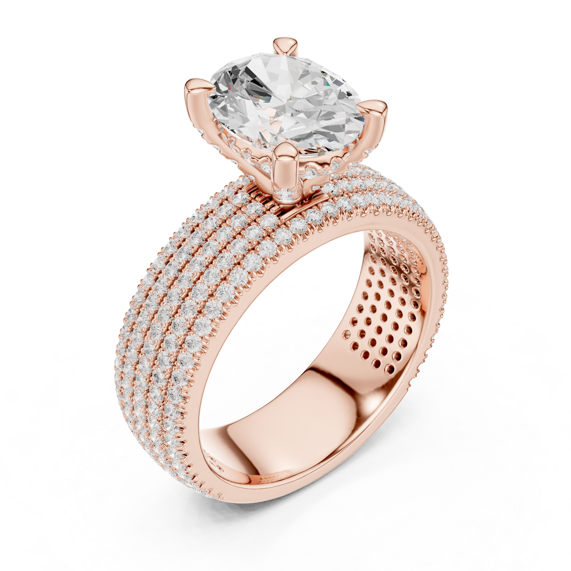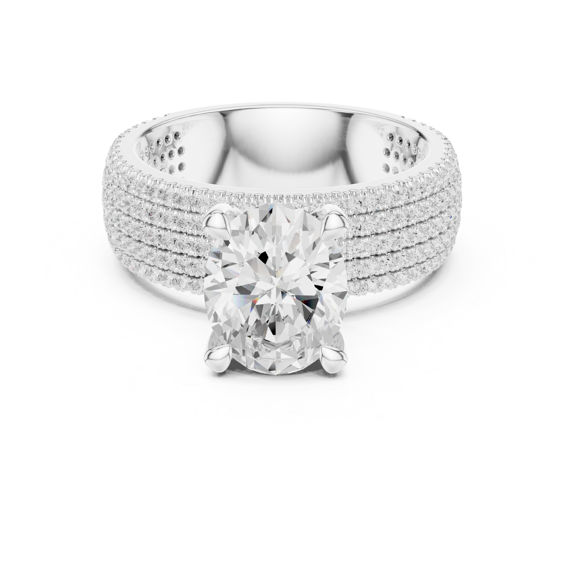 This breathtaking engagement ring showcases a brilliant oval-cut diamond set in an elegant four-prong gold setting. The standout feature is the wide, multi-row pave band—crafted with meticulous precision to create maximum sparkle and a luxurious, bold silhouette. Designed for those who love high-impact glamour, this ring blends timeless elegance with a striking modern presence. An extraordinary choice for engagements, anniversaries, or statement moments.