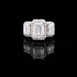 This luxurious ring features a striking three-stone design, with a large central emerald-cut diamond flanked by two slightly smaller, matching emerald-cut side stones. The geometric clarity and step-cut facets of all three diamonds create stunning, deep flashes of light. Each of the three main stones is perfectly framed by an individual halo of micro-pave set round diamonds, maximizing the sparkle and emphasizing the clean, rectangular shapes. The three clusters are set close together in white precious metal, forming a continuous, dazzling display.