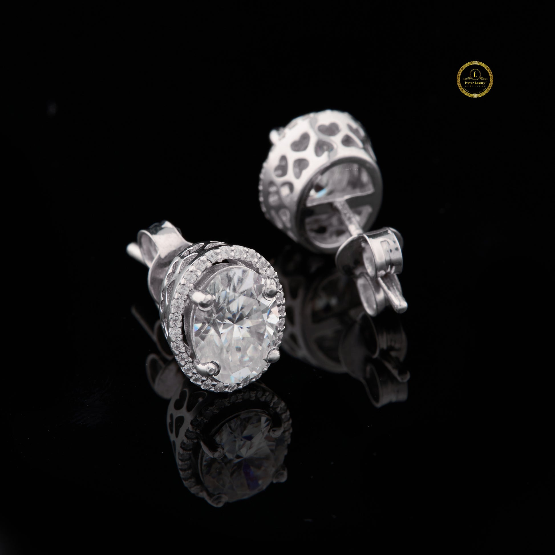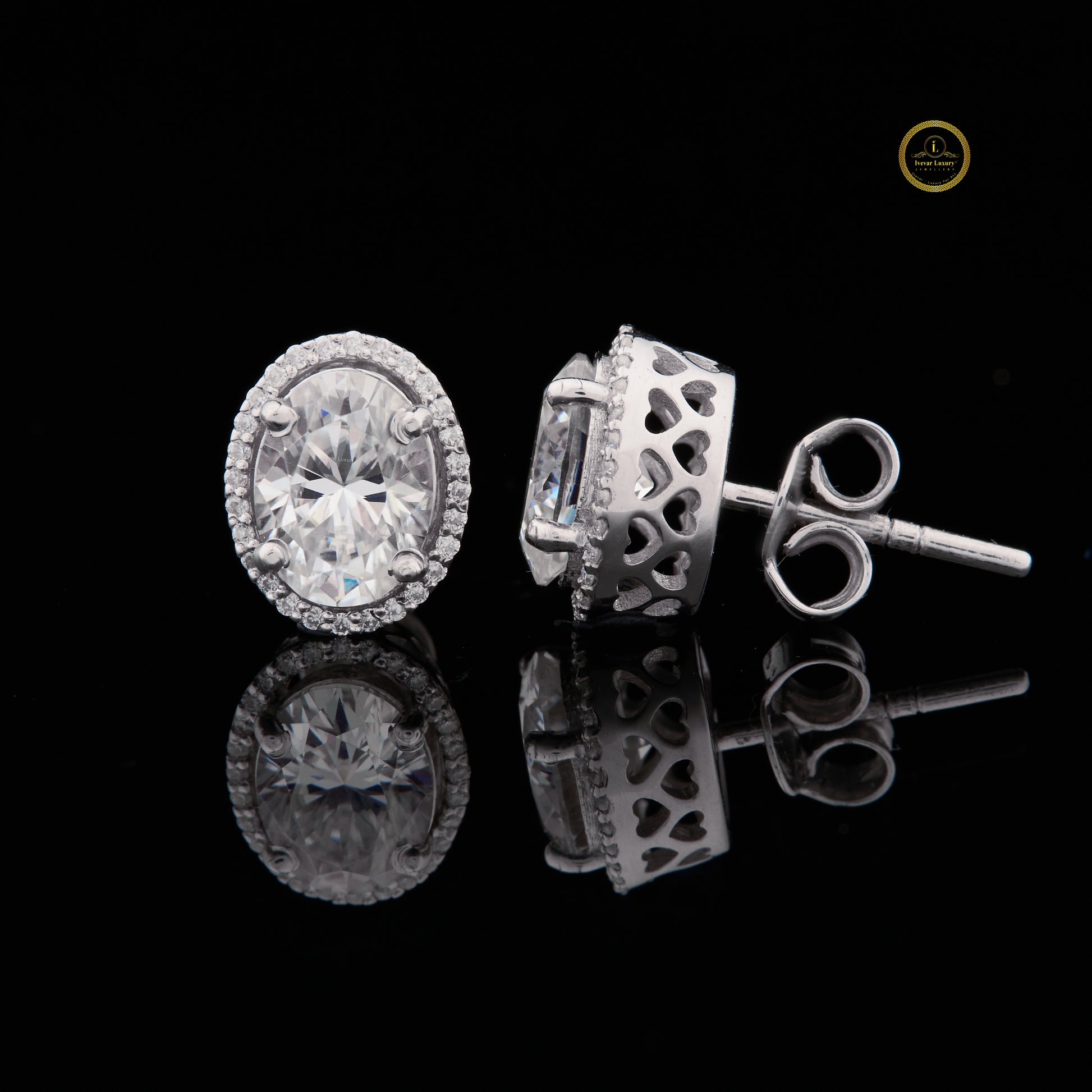 These elegant stud earrings feature stunning oval-cut center stones surrounded by a shimmering halo of smaller round diamonds, creating a refined and luxurious sparkle. The elongated oval shape adds a touch of sophistication, while the halo enhances brilliance and depth from every angle. Set in a polished metal finish with secure prong settings, these earrings offer a timeless blend of classic design and modern radiance—perfect for elevating everyday style or adding a graceful touch to special occasions.