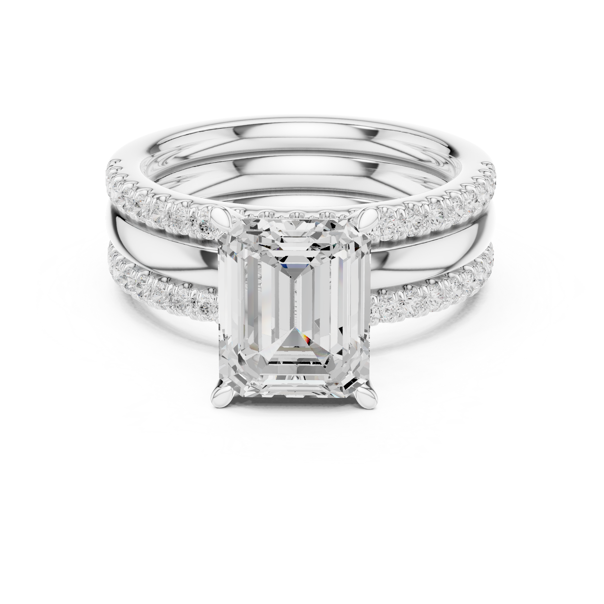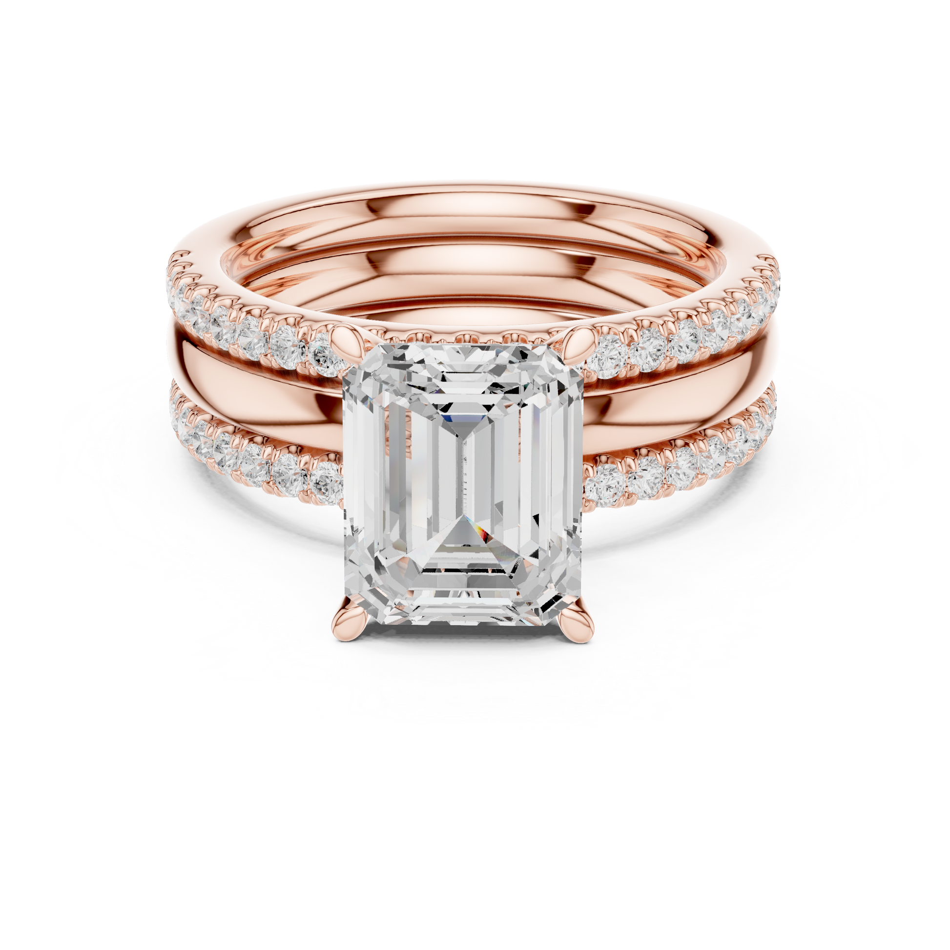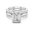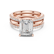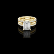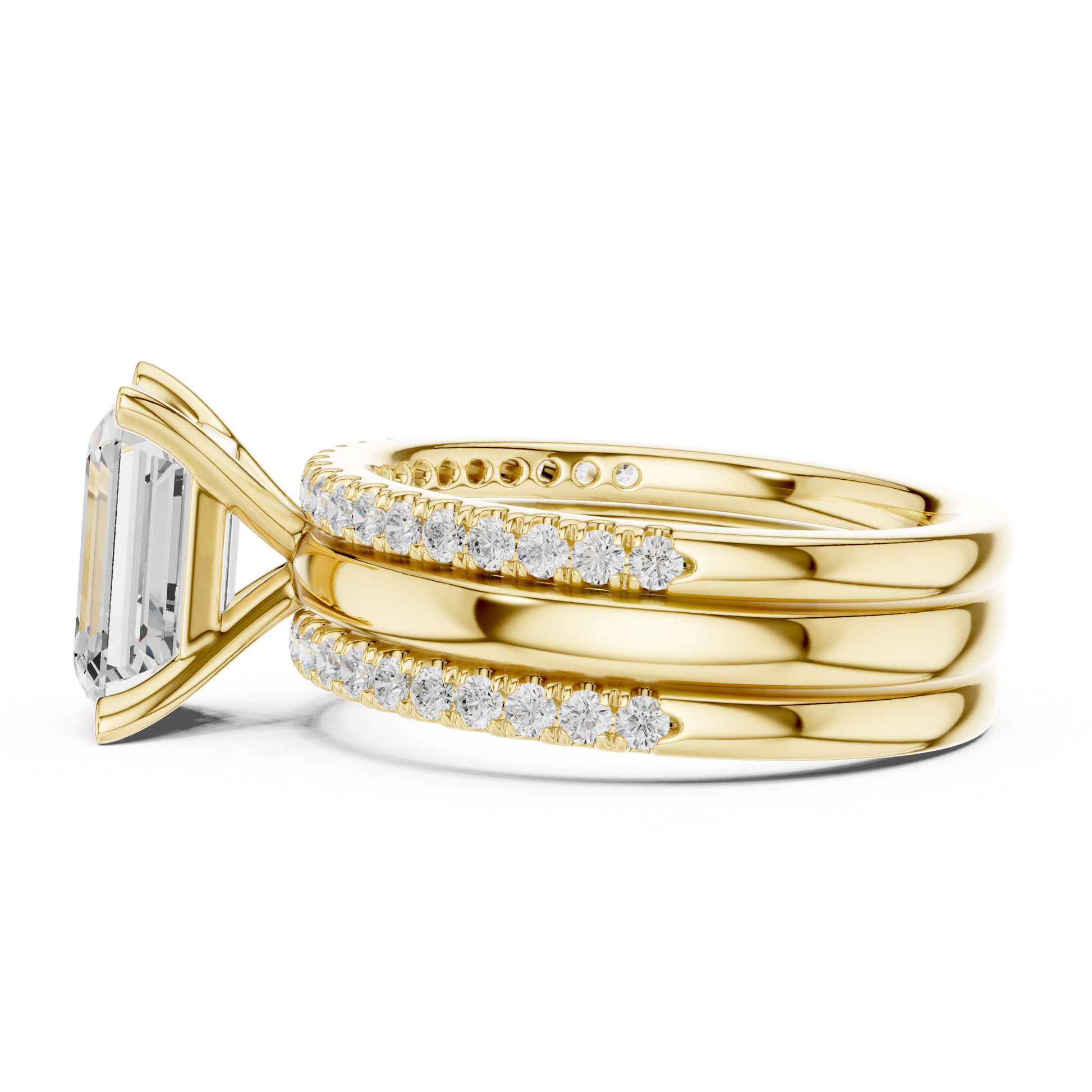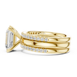 This elegant gold bridal ring set features a striking emerald-cut center diamond, celebrated for its clean lines and sophisticated brilliance. The ring is accented by pave-set diamonds along the band, adding refined sparkle while maintaining a timeless silhouette. Paired with a perfectly matched diamond-accented wedding band, this set offers a harmonious blend of modern luxury and classic design, making it a stunning symbol of love, commitment, and enduring style by Ivevar.
