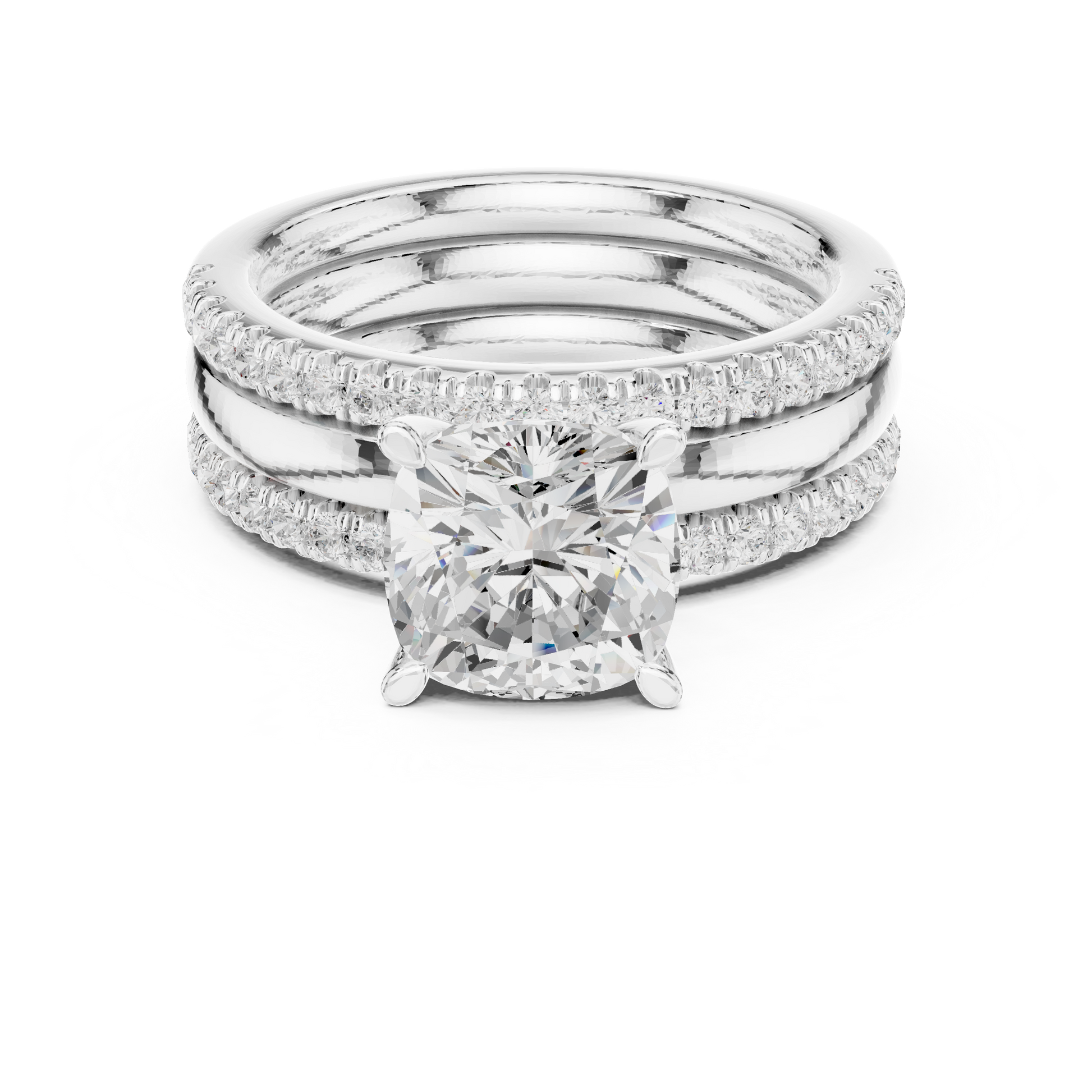 This refined gold ring features a radiant cushion-cut center diamond secured in a graceful four-prong setting. Framed by two shimmering pavé-set diamond bands, the design creates a rich layered look with exceptional brilliance and balance. Crafted for lovers of timeless glamour and contemporary elegance, this ring is perfect for engagements, weddings, or unforgettable milestone moments.