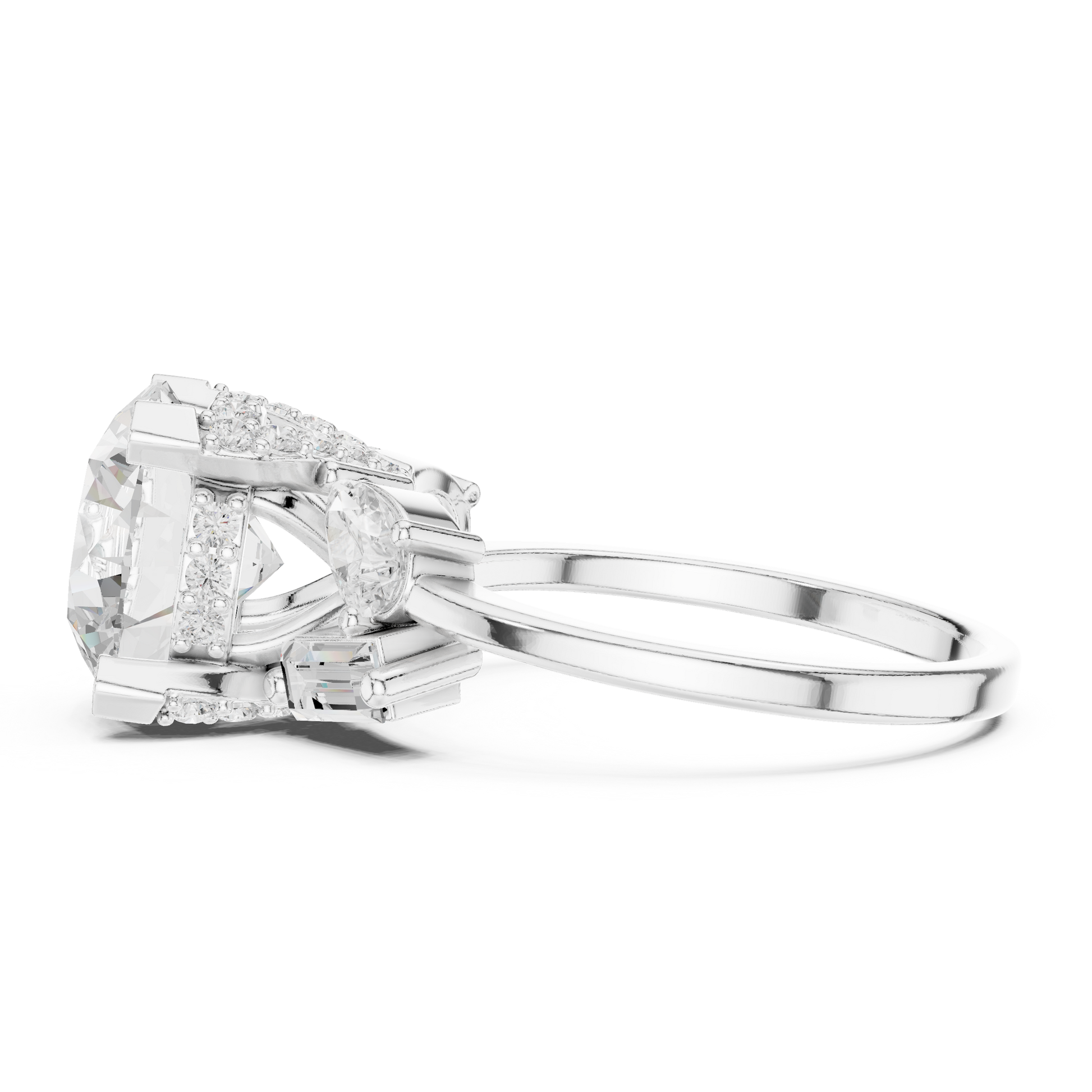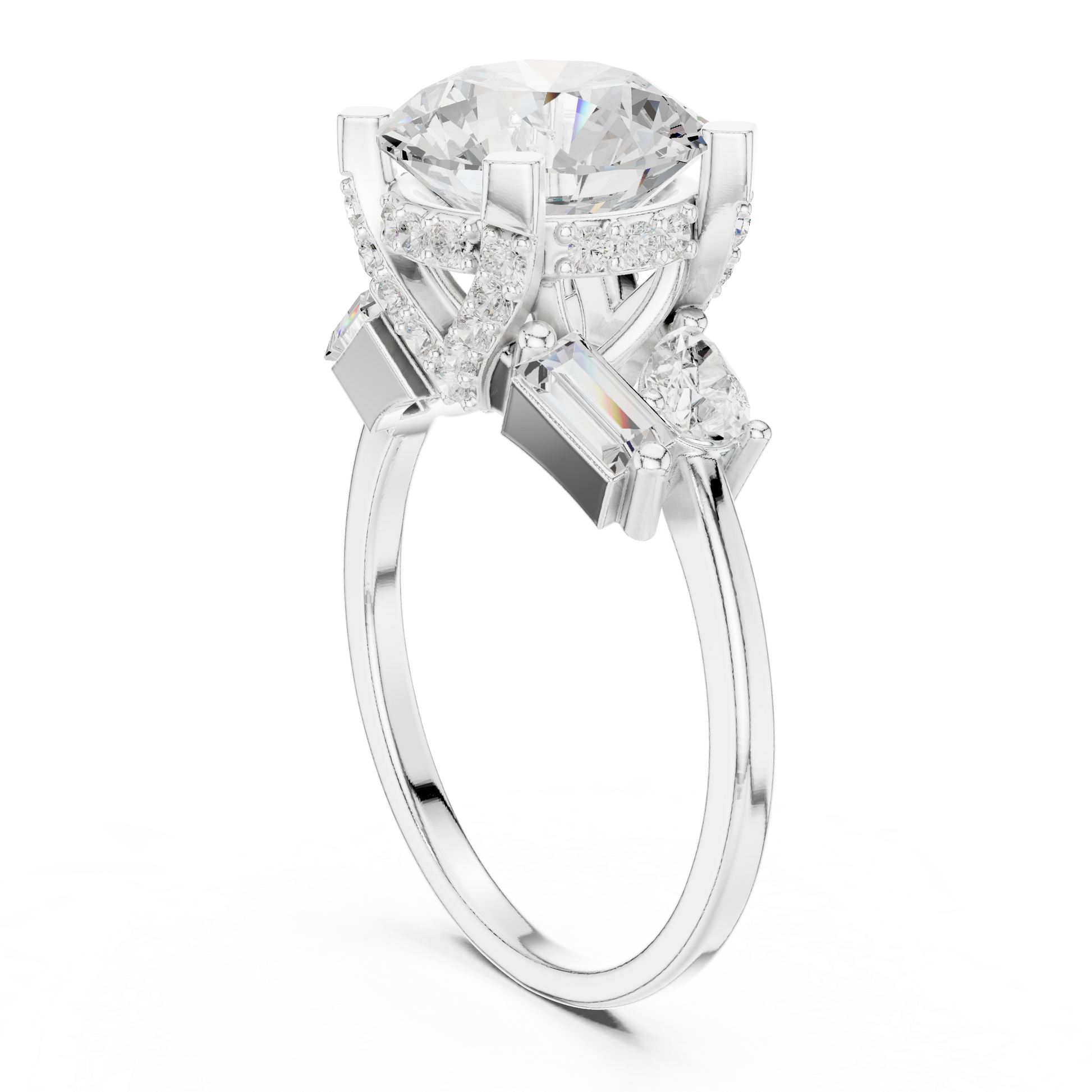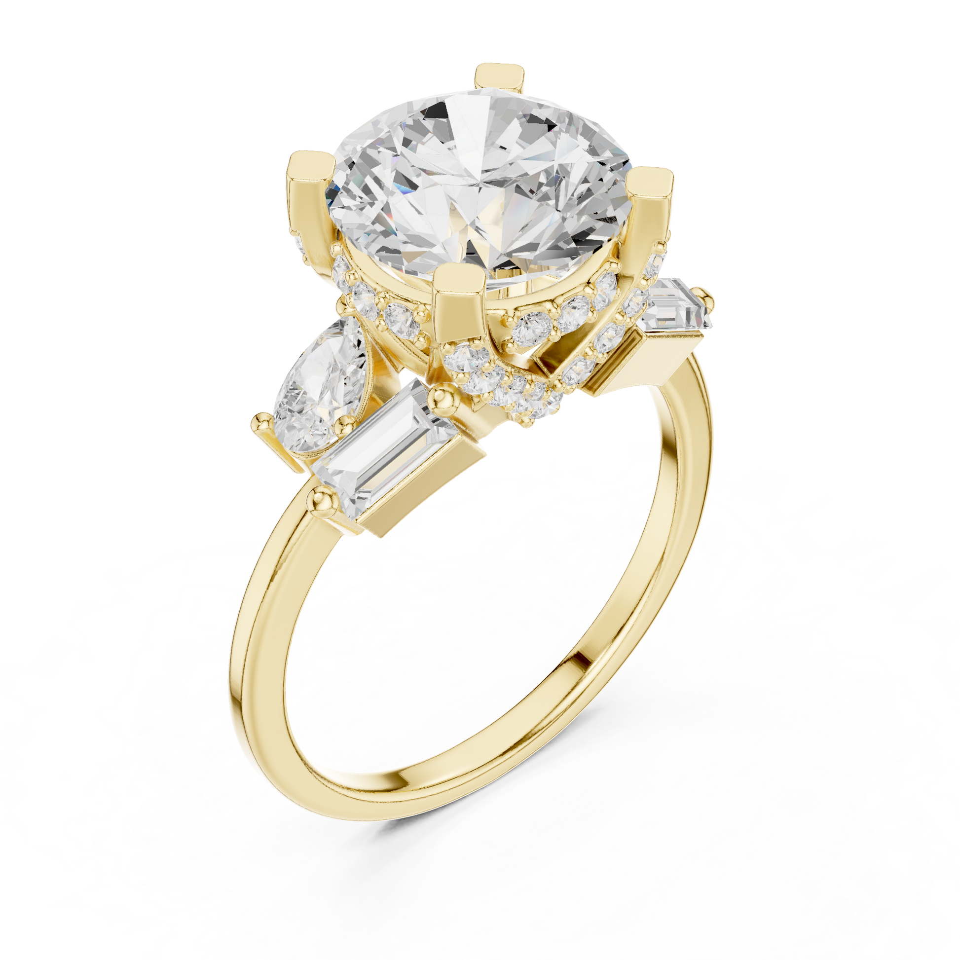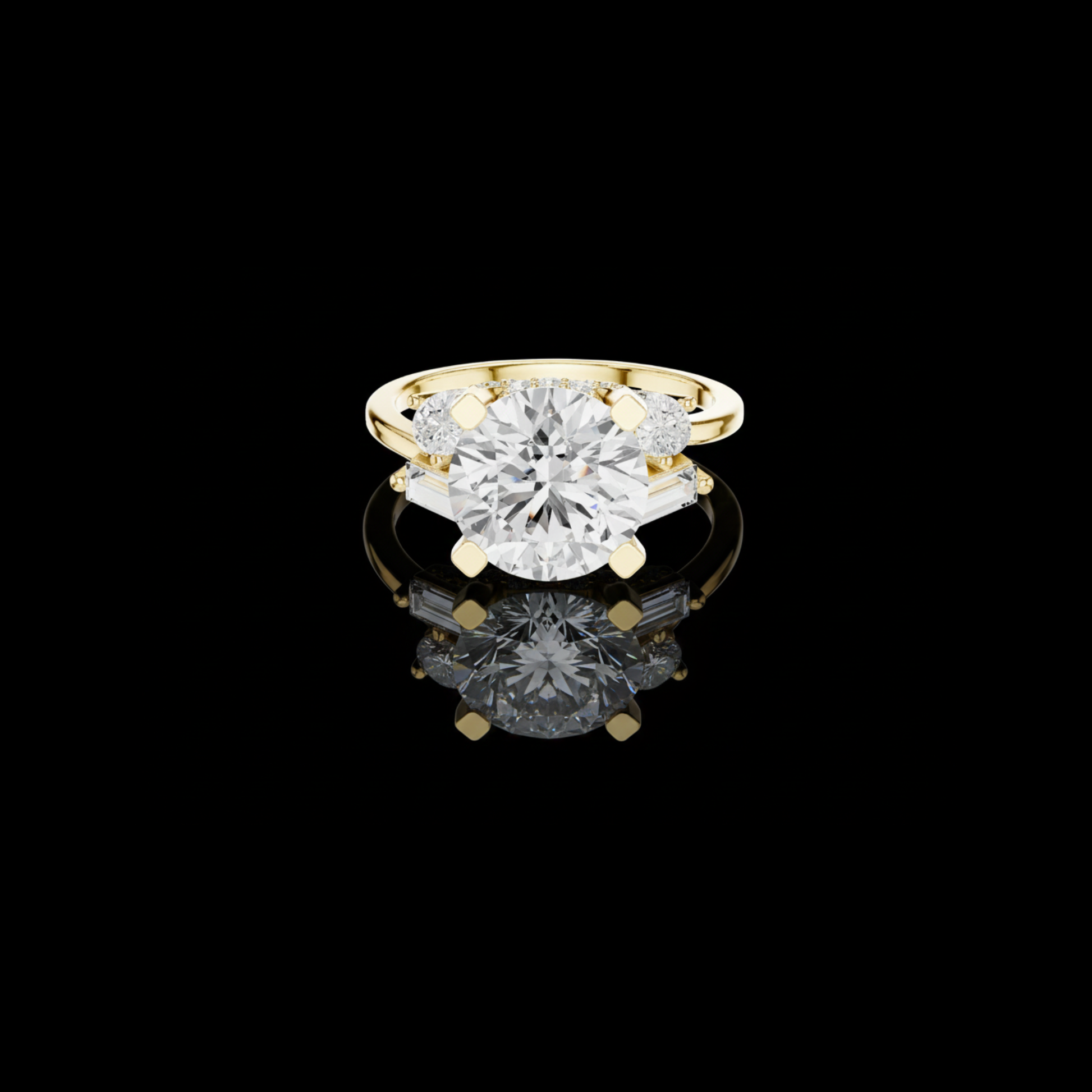 This striking three-stone ring features a dazzling round brilliant-cut diamond at its center, framed by carefully placed baguette and pear side diamonds that enhance its fire and presence. Set in polished gold, the structured prong setting provides both security and a refined architectural look, while the balanced arrangement of accent stones adds depth and dimension. Elegant yet bold, this design symbolizes past, present, and future, making it a meaningful and luxurious choice for an engagement or a timeless statement of commitment.