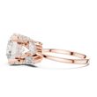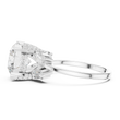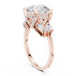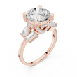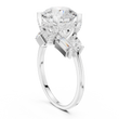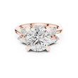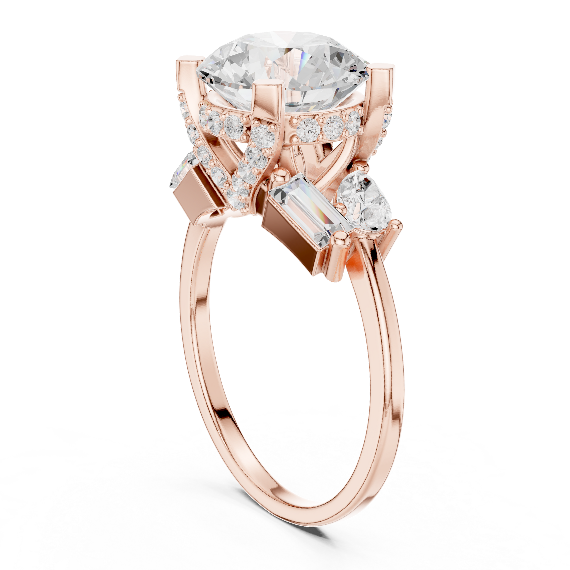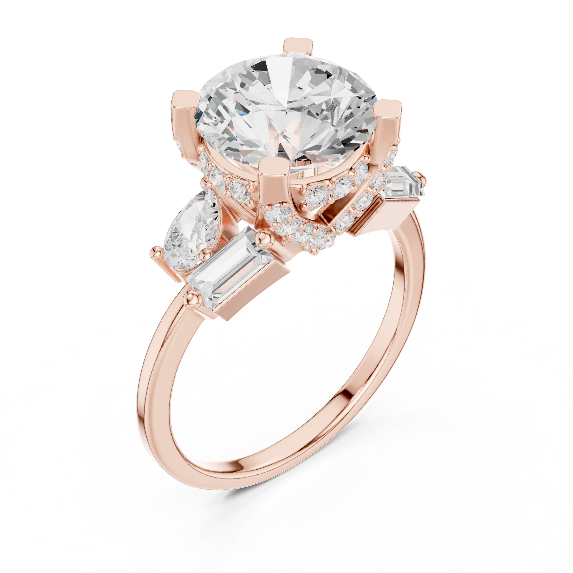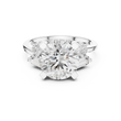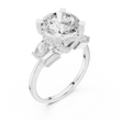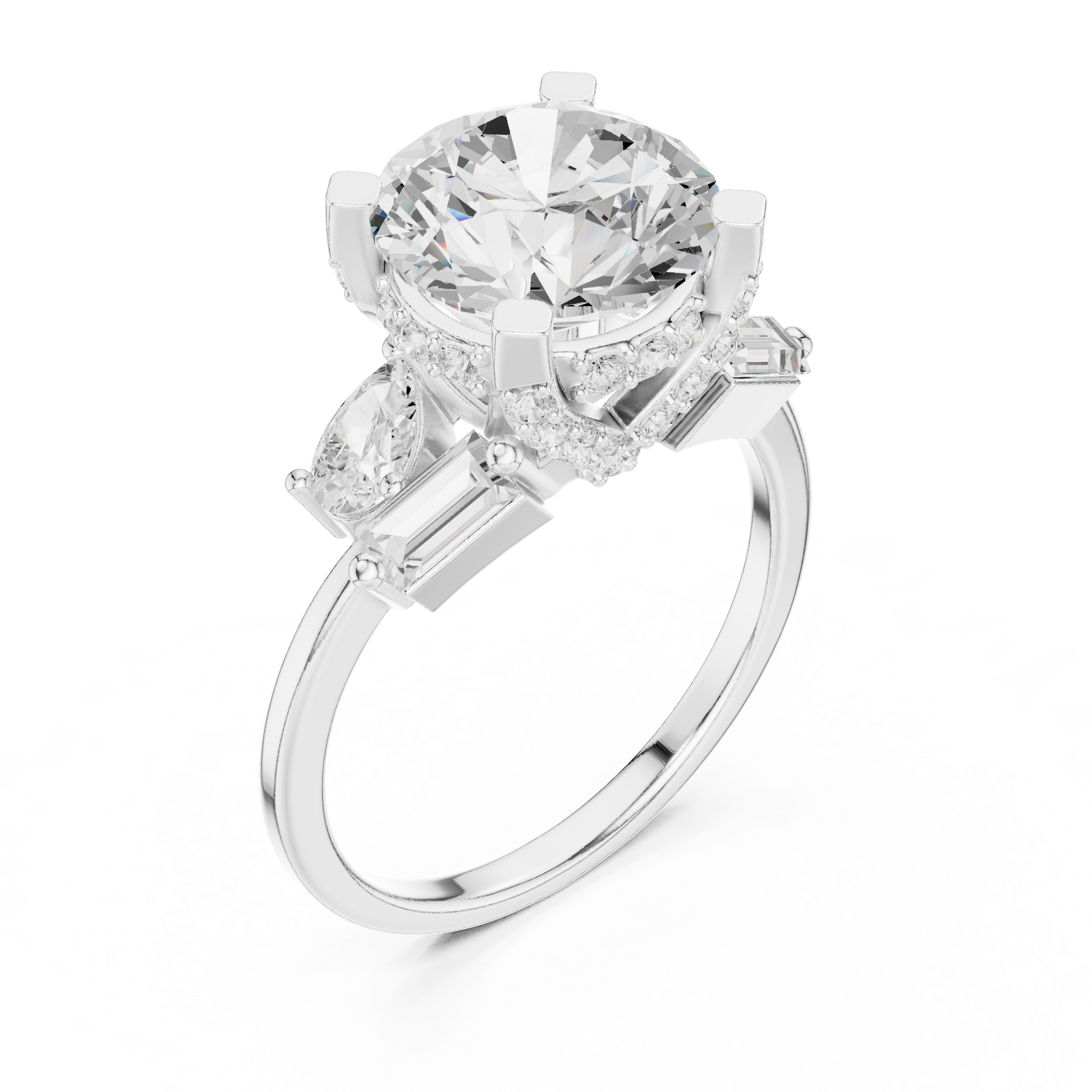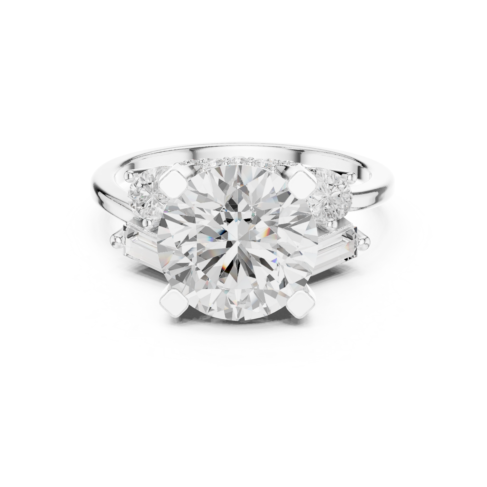 This striking three-stone ring features a dazzling round brilliant-cut diamond at its center, framed by carefully placed baguette and pear side diamonds that enhance its fire and presence. Set in polished gold, the structured prong setting provides both security and a refined architectural look, while the balanced arrangement of accent stones adds depth and dimension. Elegant yet bold, this design symbolizes past, present, and future, making it a meaningful and luxurious choice for an engagement or a timeless statement of commitment.