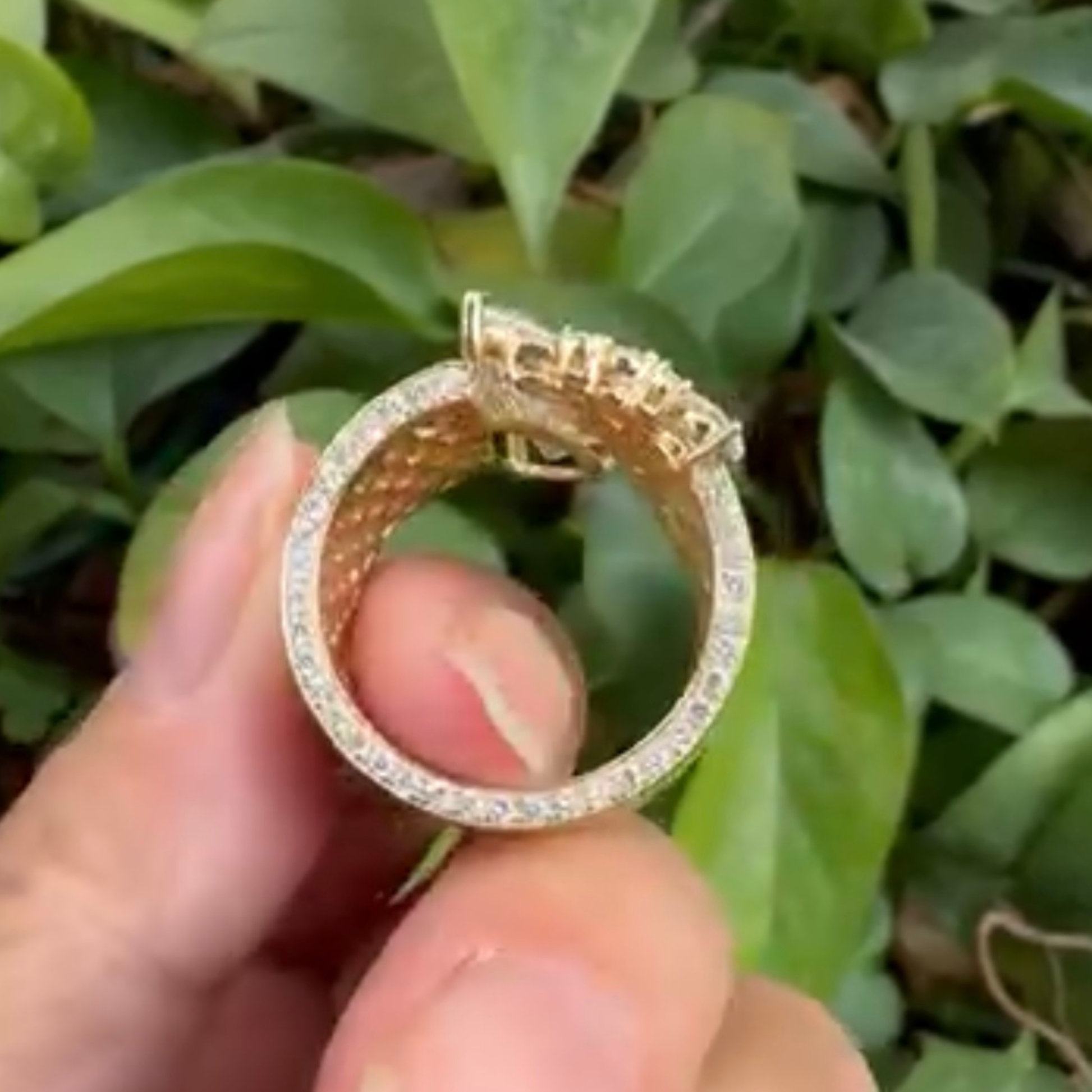 At Ivevar Luxury, this ring is designed as a bold expression of artistry and modern elegance. Showcasing a striking pear cut diamond, the open-band structure creates a powerful visual balance between the center stone and the intricate floral cluster of marquise and round diamonds on the opposite side. the sculptural shank features a polished high-gloss finish with delicate pave detailing that enhances brilliance from every angle. The asymmetrical silhouette gives this ring a contemporary, high-fashion appeal while maintaining refined craftsmanship.