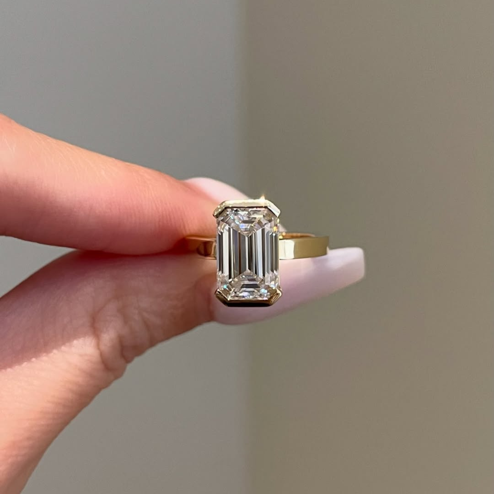 This exquisite ring features a bold emerald-cut diamond, celebrated for its step-cut facets and crystal-clear symmetry. Set in a smooth band, the design highlights a modern architectural silhouette that feels both luxurious and effortlessly sophisticated. The elongated shape enhances brilliance while maintaining a sleek, contemporary aesthetic, making it perfect for those who appreciate understated glamour and precision craftsmanship. Ideal as a statement ring, engagement ring, or a refined everyday luxury piece.