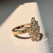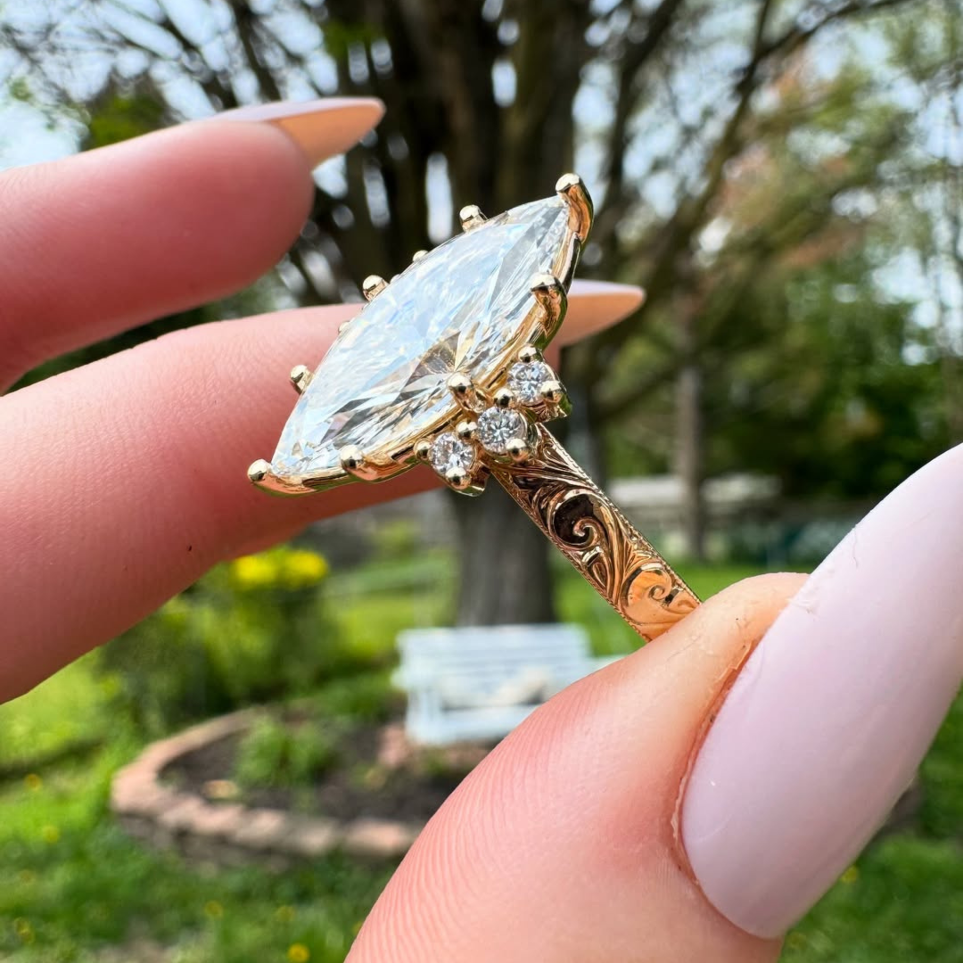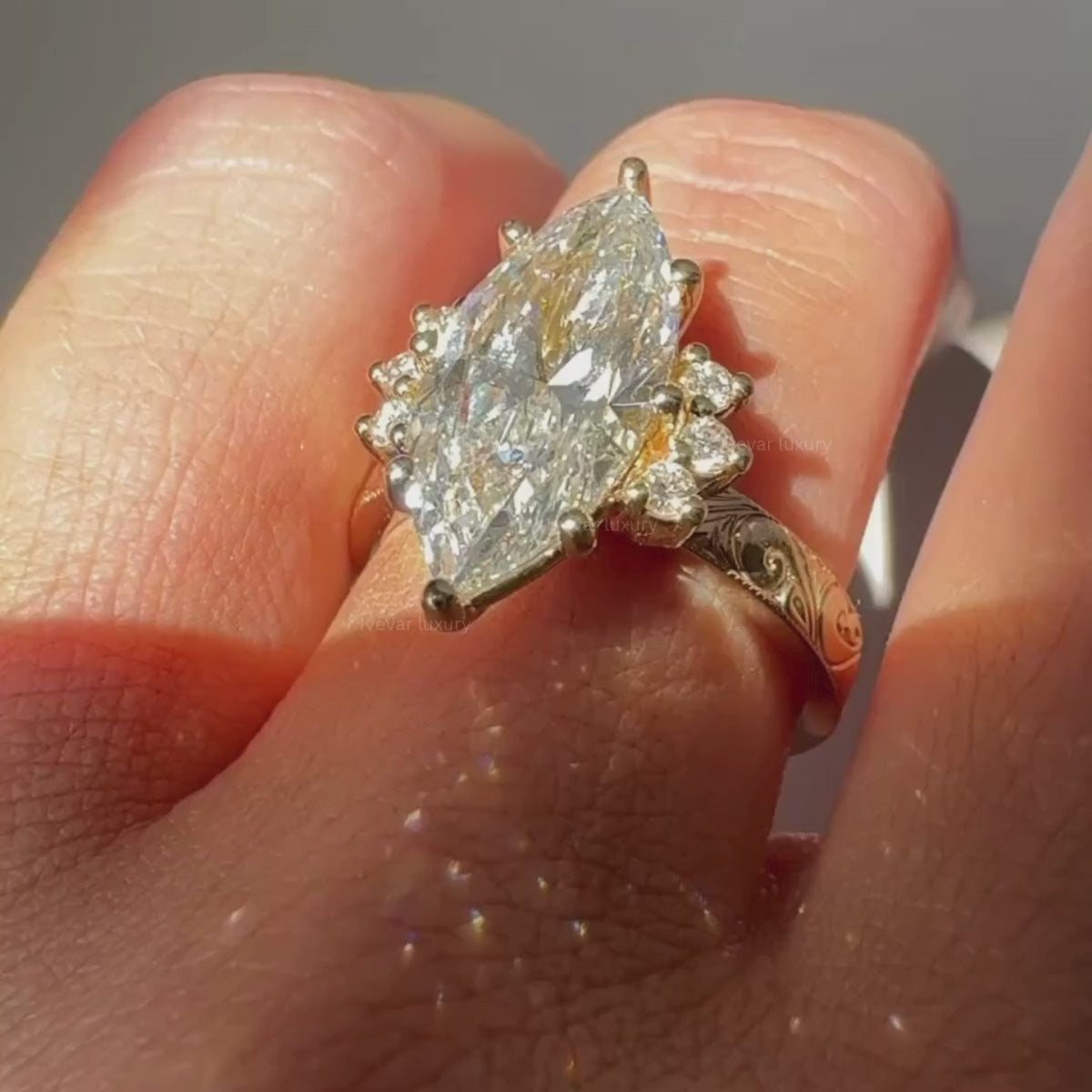 This captivating ring showcases a striking marquise-cut center diamond, admired for its elongated shape and exceptional brilliance. The diamond is secured in elegant prongs, enhancing its light reflection and dramatic presence. Delicate side diamonds add radiant sparkle, while the beautifully detailed vintage-inspired gold band features graceful engraved motifs for timeless charm. Designed for those who appreciate luxury craftsmanship, romantic elegance, and statement-worthy beauty, this ring is a breathtaking symbol of everlasting love and devotion.
