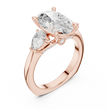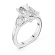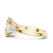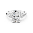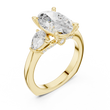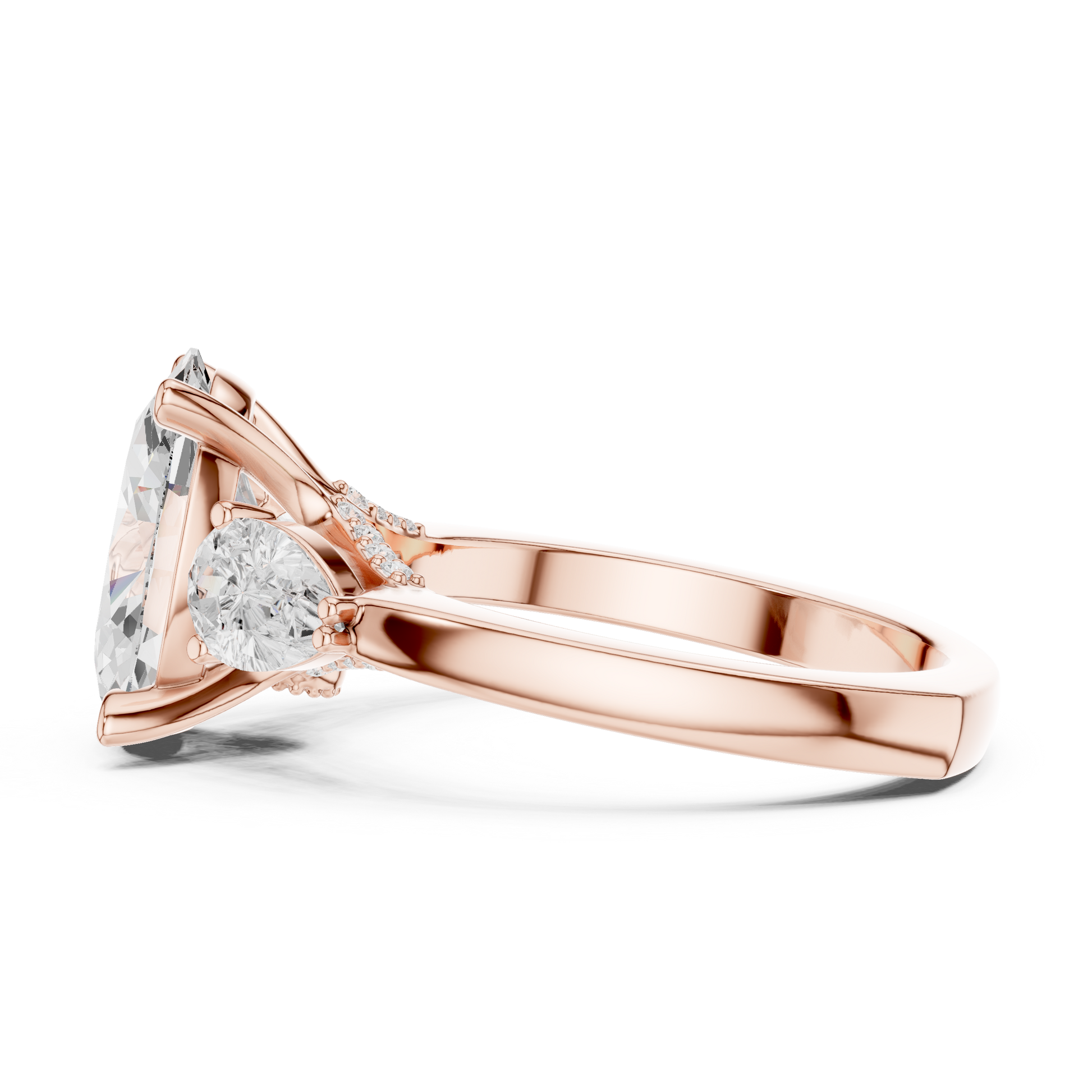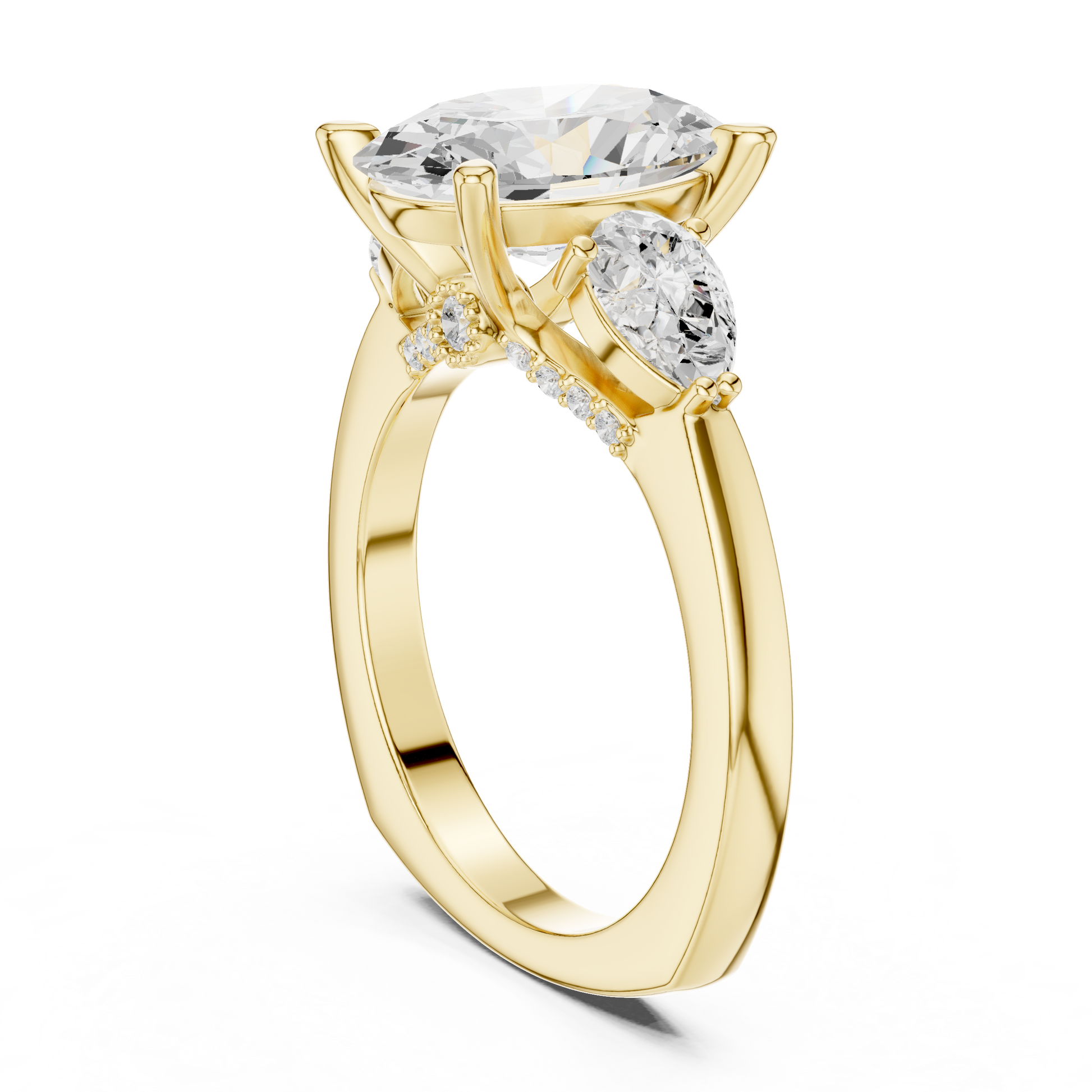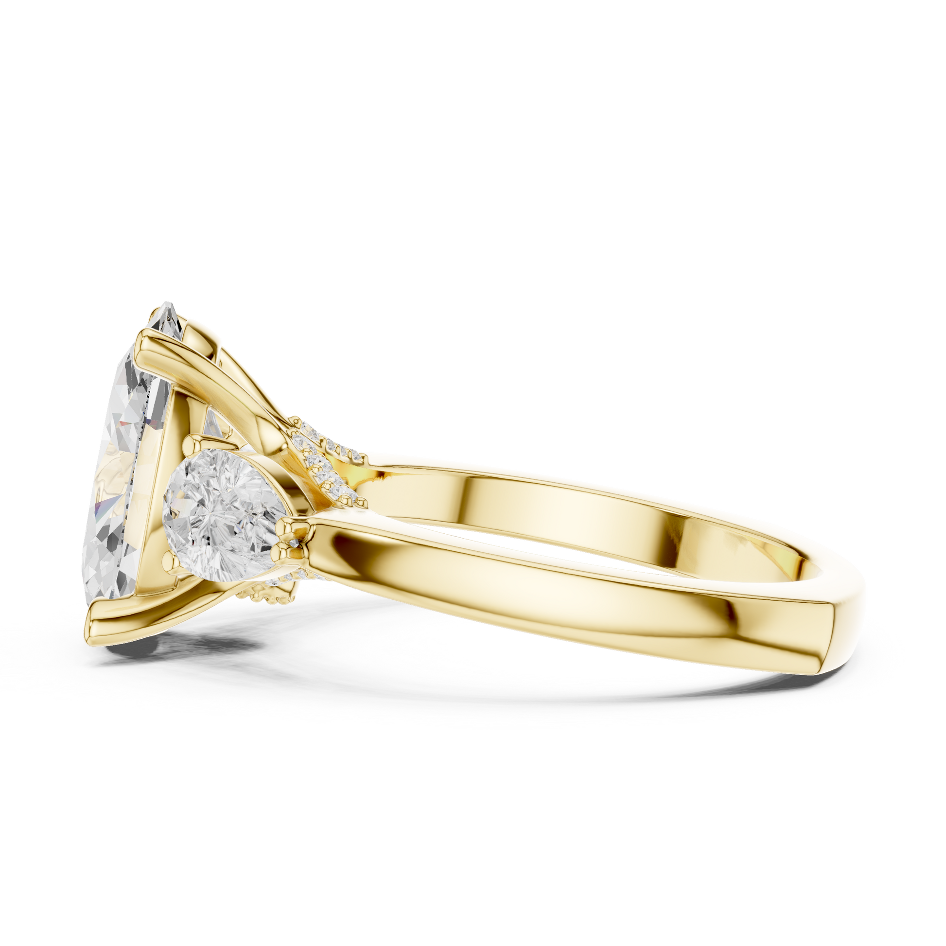 This breathtaking three-stone engagement ring features a luminous oval-cut center diamond paired with two perfectly matched round side stones for a balanced, radiant sparkle. Set in rich gold, the design blends graceful curves with a bold, elongated silhouette that enhances brilliance from every angle. A symbol of past, present, and future, this ring offers timeless elegance with a modern, luxurious touch—perfect for the bride who loves refined sophistication and iconic sparkle.