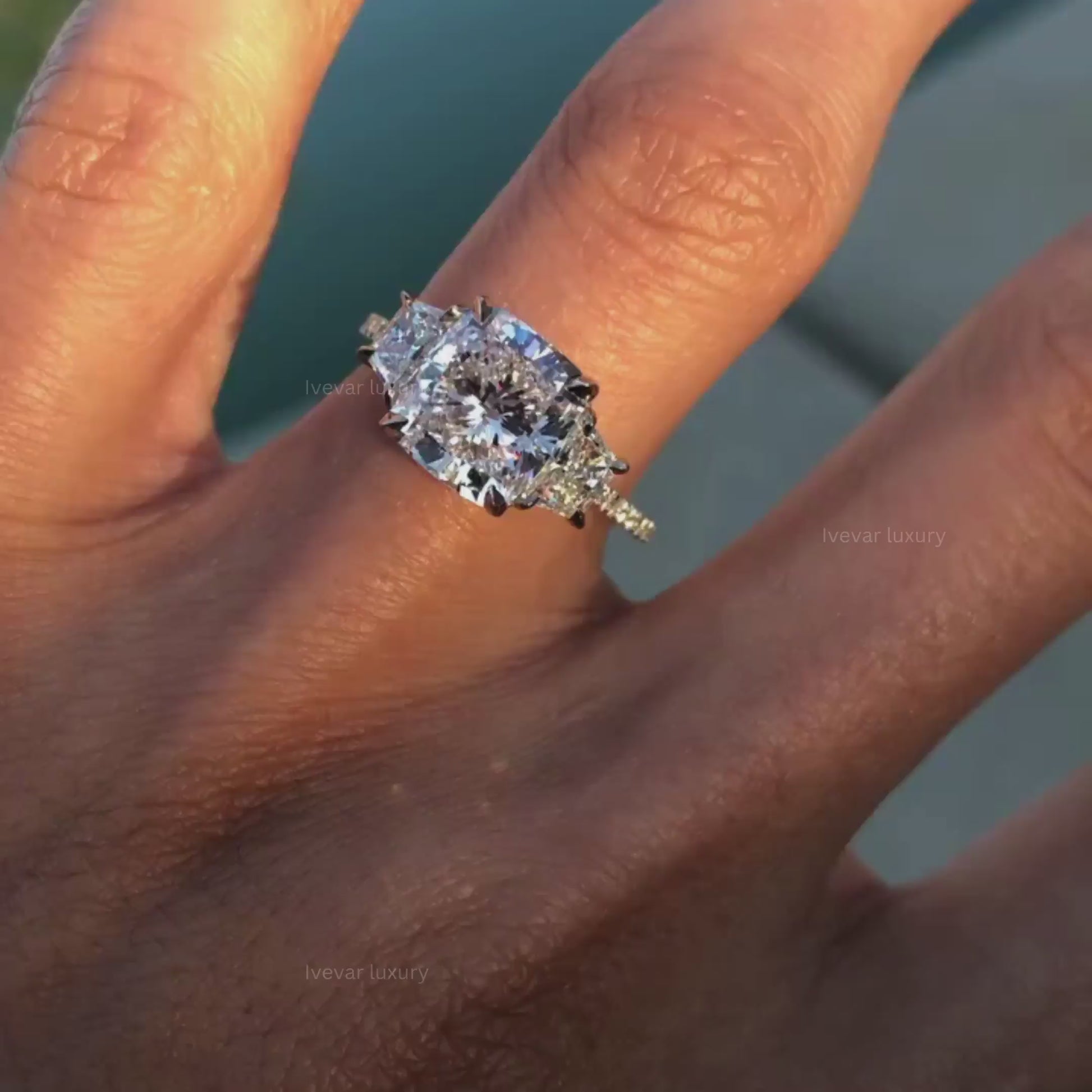 This striking ring features a luminous cushion-cut center stone that blends sharp structure with exceptional brilliance. Flanked by precision-cut trapezoid side diamonds, the design creates a bold, balanced silhouette that enhances the center stone’s presence. A delicate pavé band adds refined sparkle, completing a sophisticated composition that feels both powerful and timeless.