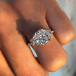 This striking ring features a luminous cushion-cut center stone that blends sharp structure with exceptional brilliance. Flanked by precision-cut trapezoid side diamonds, the design creates a bold, balanced silhouette that enhances the center stone’s presence. A delicate pavé band adds refined sparkle, completing a sophisticated composition that feels both powerful and timeless.
