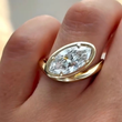 This elegant solitaire ring features a striking marquise-shaped diamond secured within a refined bezel-inspired setting. The polished yellow gold band sweeps gracefully around the center stone, creating a fluid wrap silhouette that feels both modern and timeless. Designed to highlight the elongated sparkle of the marquise cut, this ring is ideal as a statement piece, alternative engagement ring, or contemporary fine jewelry essential.