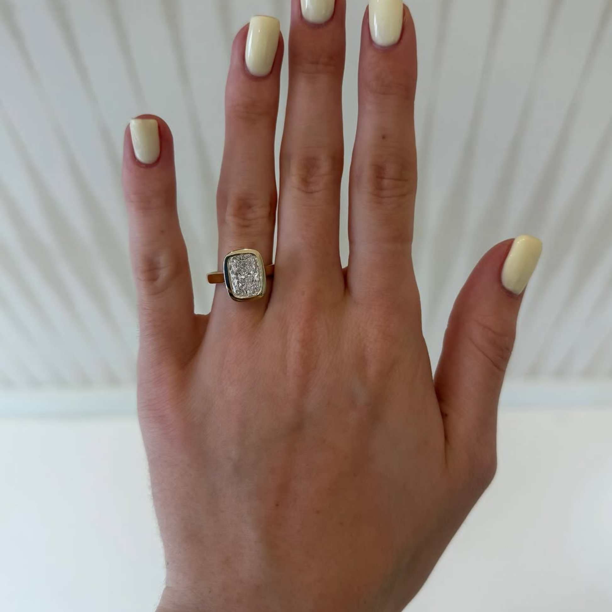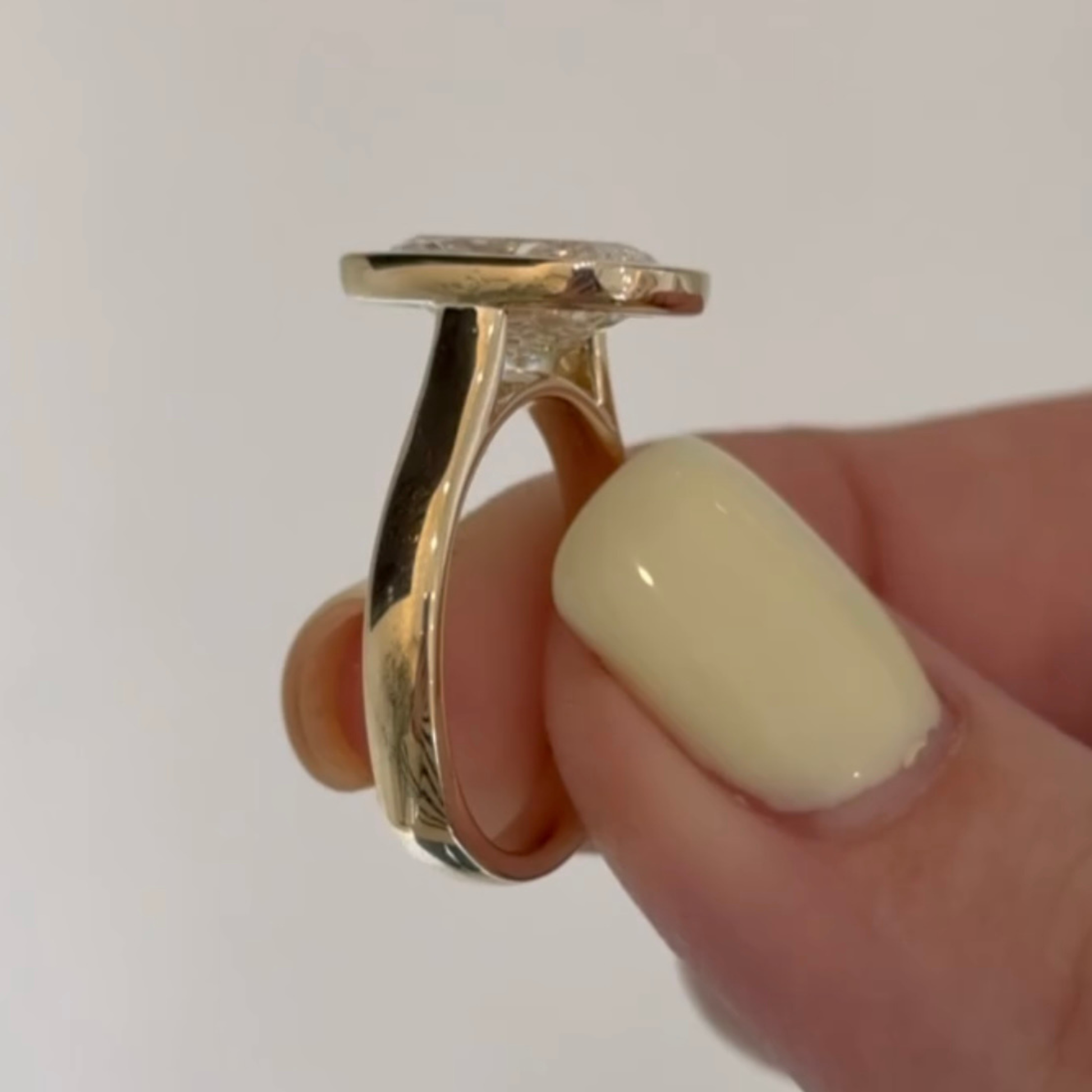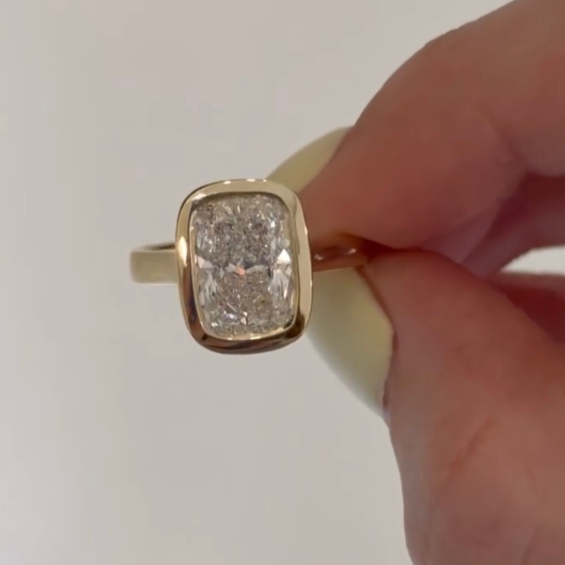 This refined creation from Ivevar Luxury showcases a breathtaking crushed ice radiant diamond elegantly secured in a sleek bezel setting, offering a perfect balance of modern design and timeless sophistication. the smooth, high-polish band enhances the brilliance of the center stone while maintaining a clean, minimalist aesthetic. The elevated, airy structure allows light to flow freely beneath the diamond, amplifying sparkle and creating a striking floating effect.