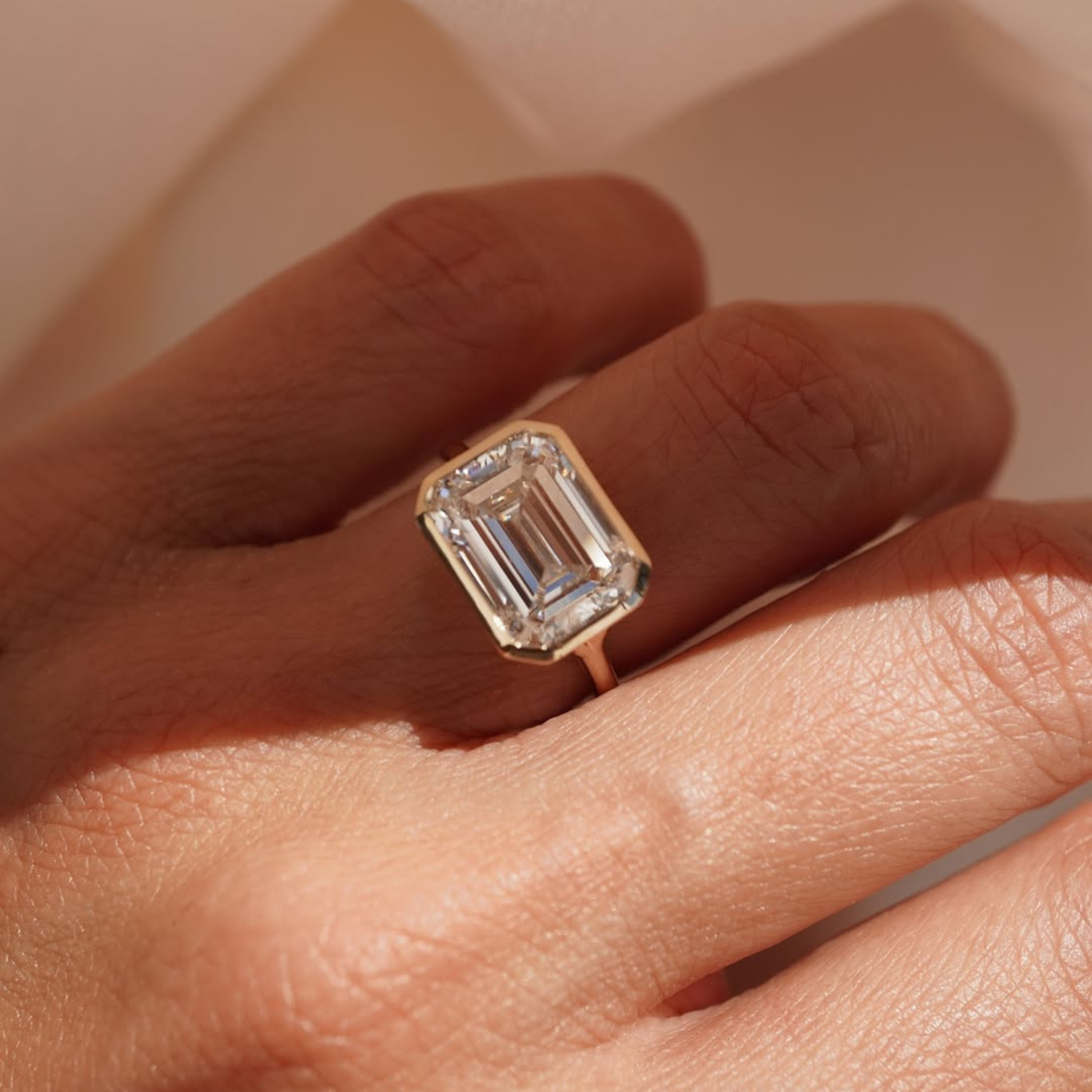 This refined solitaire ring highlights a beautifully proportioned emerald-cut diamond framed in a sleek bezel setting. Crafted in polished gold, the minimalist band and geometric lines emphasize the diamond’s step-cut clarity and mirror-like brilliance. Sophisticated and understated, this design is perfect for lovers of modern elegance, making it an exceptional engagement ring or timeless everyday luxury piece.