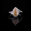 This exceptional ring features a striking, substantial pear-cut diamond exhibiting a rich, warm fancy vivid yellow hue. The beautiful teardrop stone is outlined by a delicate halo of micro-pave set round diamonds, which provides a crisp contrast and enhances the center stone's vibrant color.The setting is highly contemporary, featuring a bypass or tension-style shank crafted from white precious metal. The band splits as it approaches the center, with one side of the split shank also fully set with pave diamonds from Ivevar.