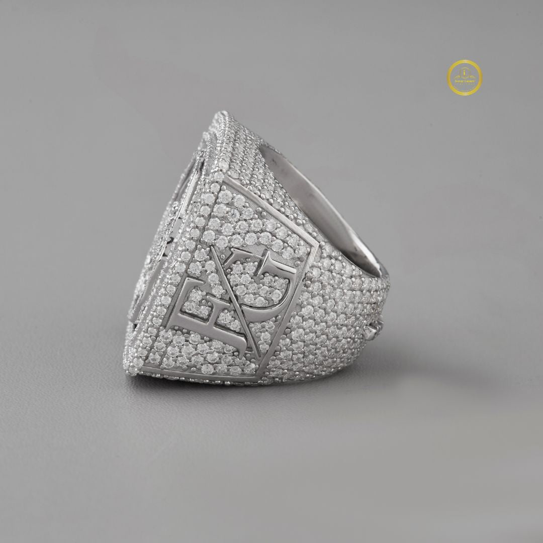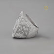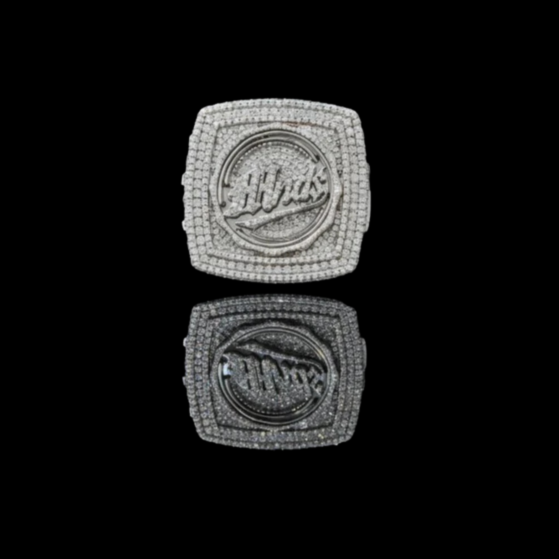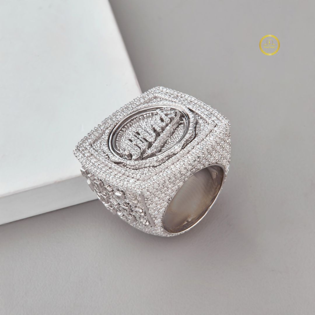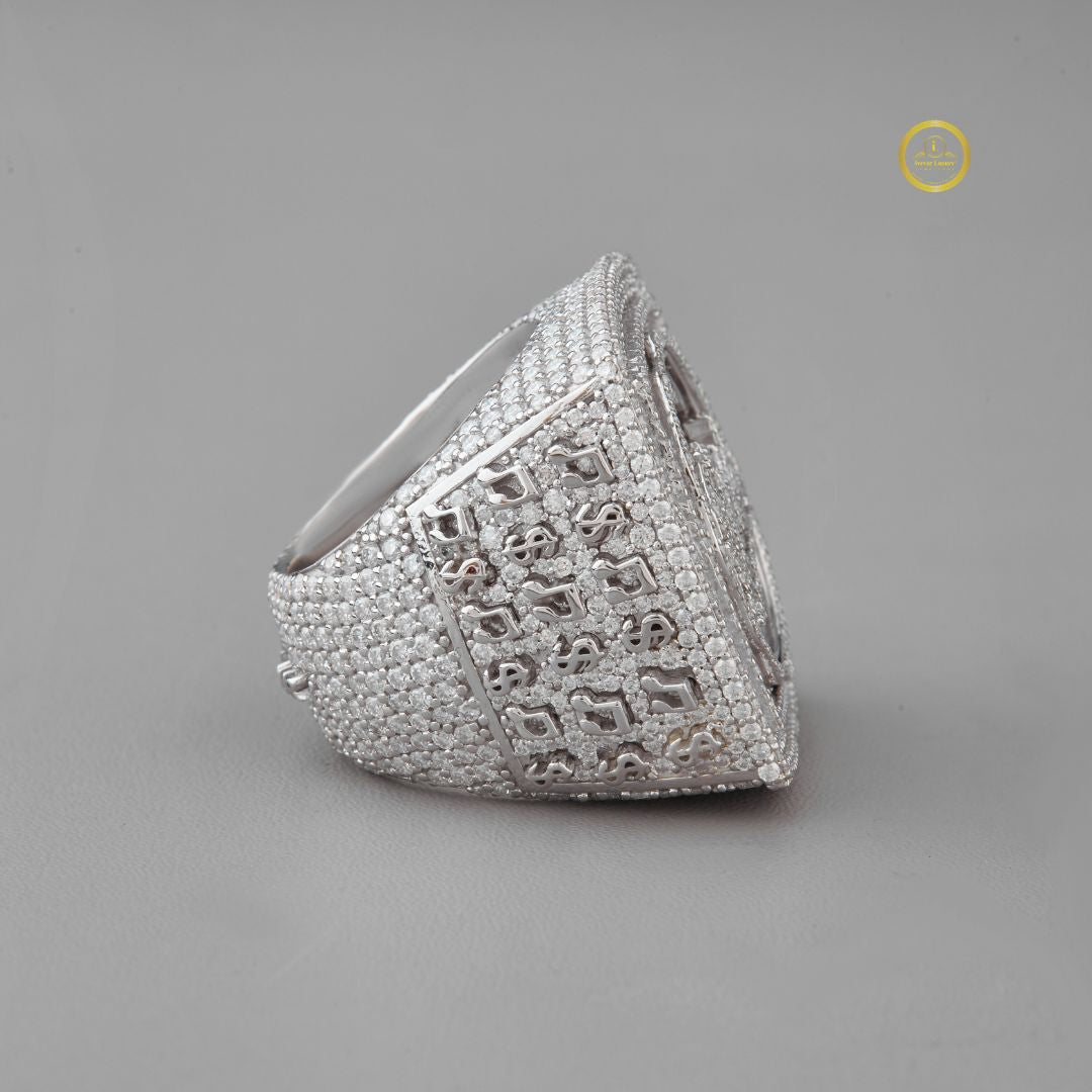This luxurious ring showcases a bold, square silhouette completely paved in sparkling diamonds, drawing the eye to its raised circular centerpiece adorned with an elegant script-style emblem. The meticulous stone placement creates a radiant, high-end finish, while the mirrored reflection beneath emphasizes its brilliance and craftsmanship. Designed to stand out, this piece exudes exclusivity and refined style, making it a powerful statement of prestige. This is a spectacular, oversized hip-hop style statement ring from Ivevar Luxury.