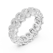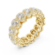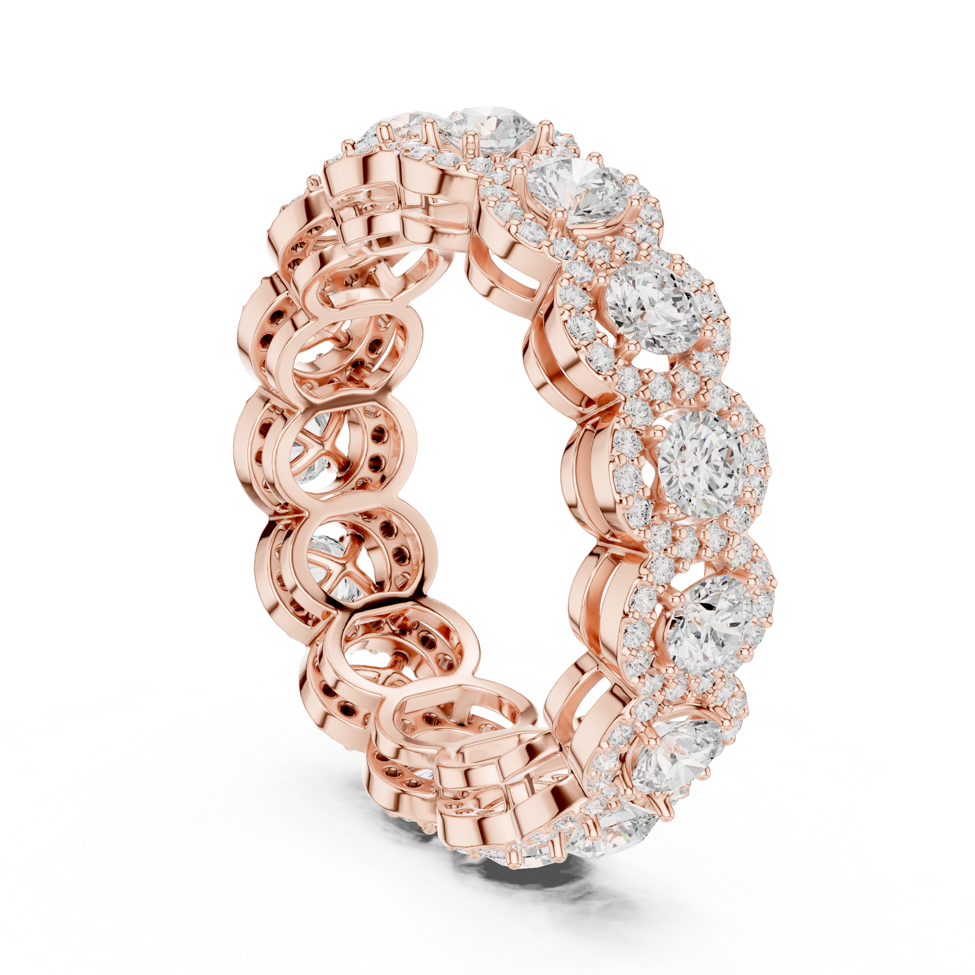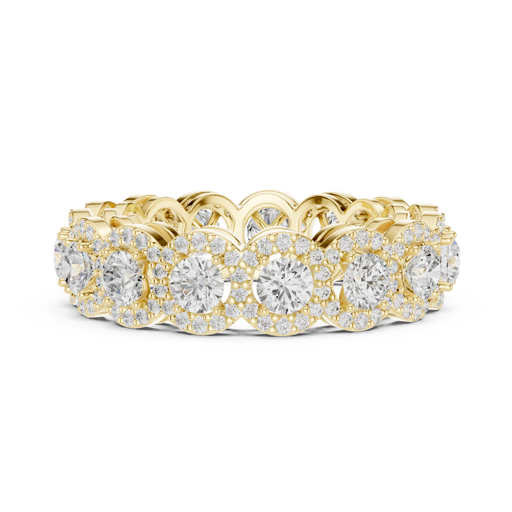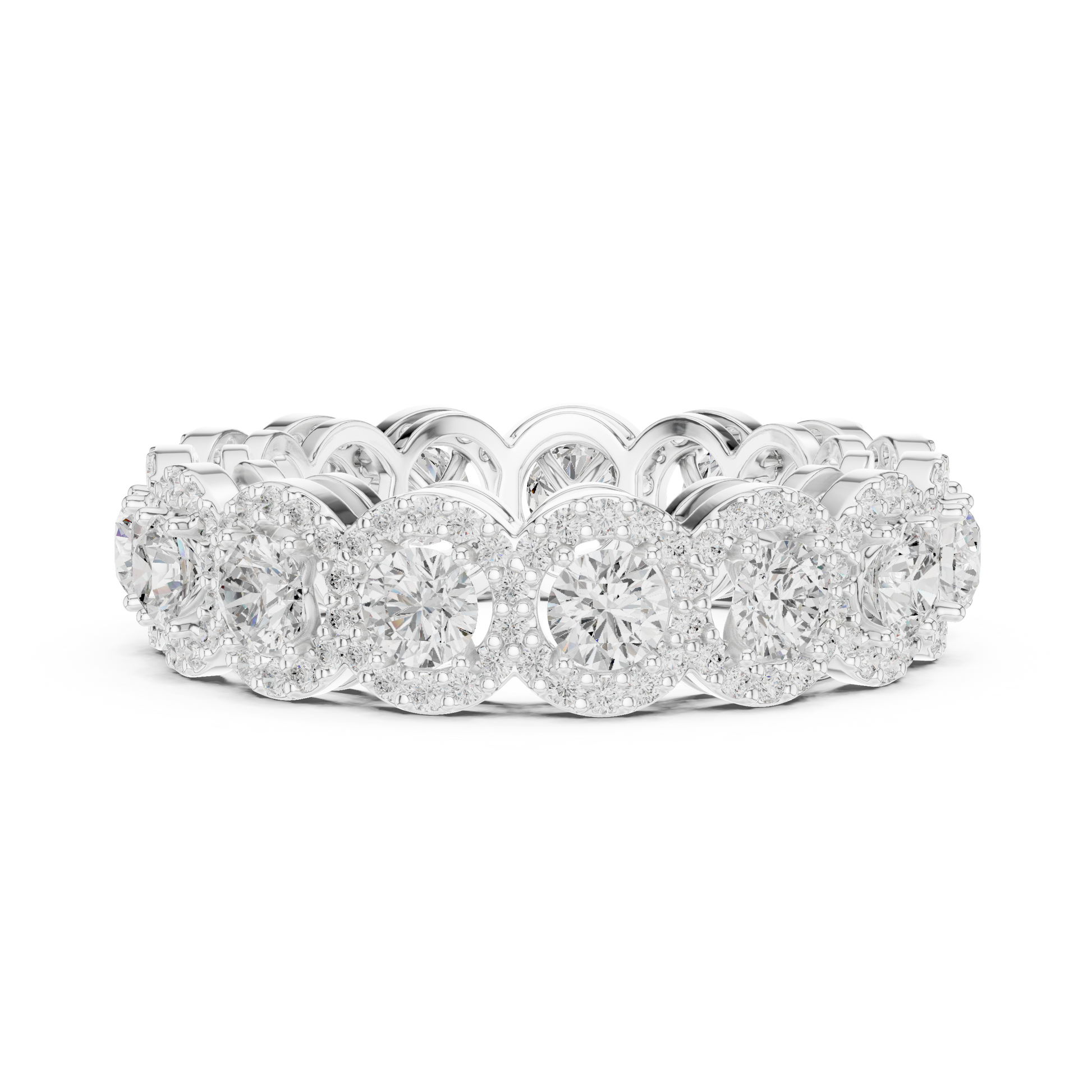 Indulge in the brilliance of this exquisite eternity band, crafted in rich and adorned with a continuous circle of sparkling round-cut diamonds. Each diamond is framed by a delicate halo of smaller stones, creating a seamless loop of light that wraps gracefully around the entire band.The ring features an elegant interlocking openwork pattern along the inner gallery, adding both beauty and refined craftsmanship to its design. Perfect as a wedding band, anniversary piece, or a statement luxury ring, this piece delivers unmatched radiance and timeless sophistication.