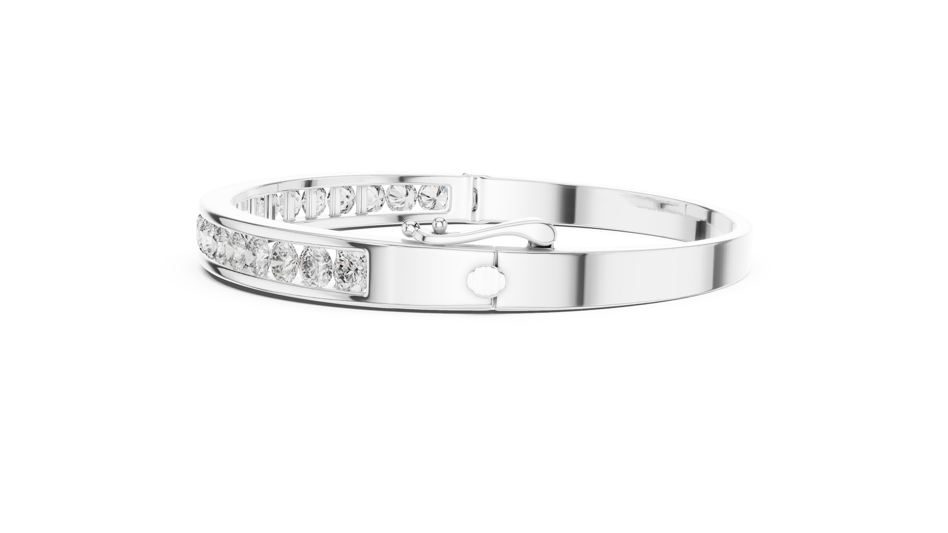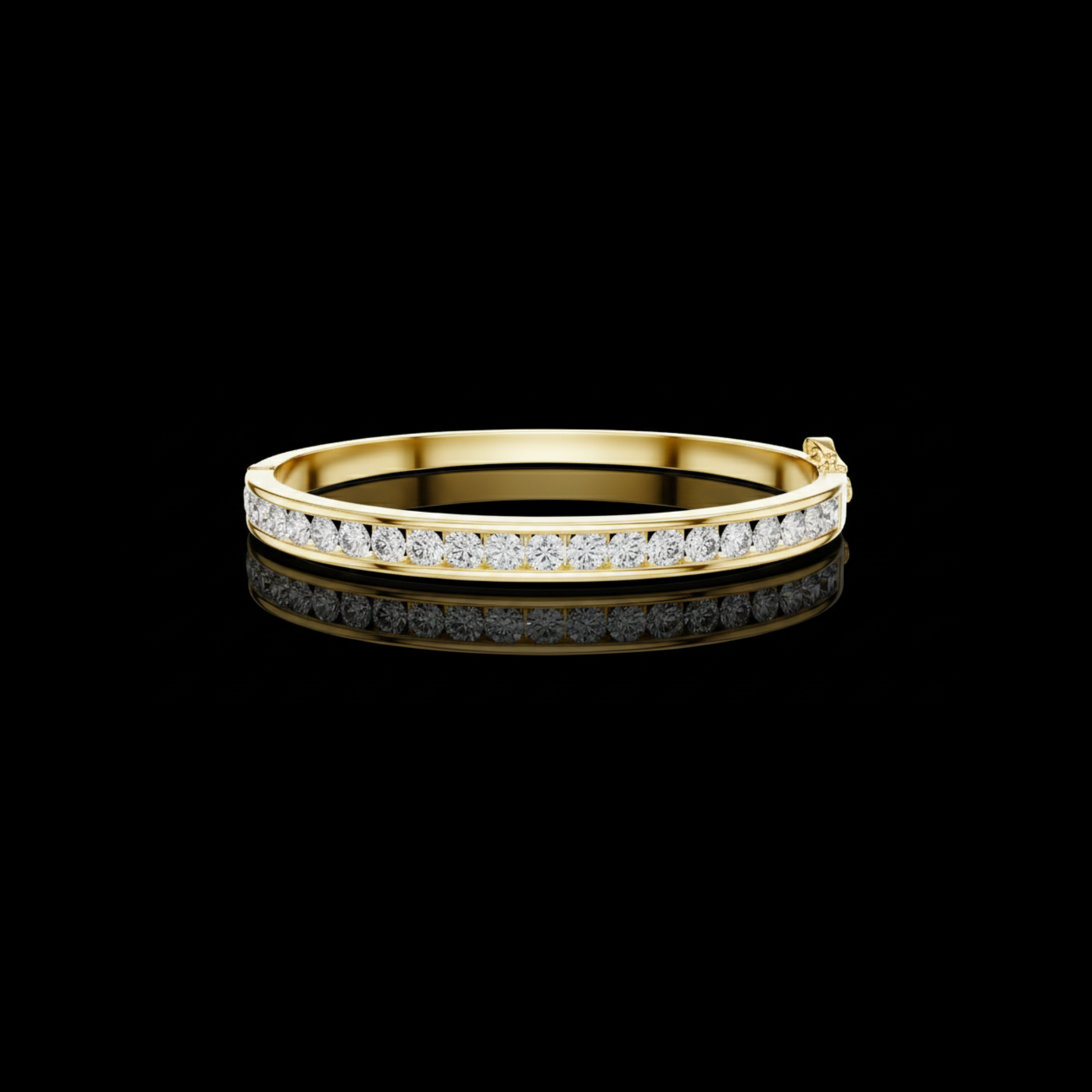 This elegant gold bangle bracelet features a seamless row of channel-set round brilliant diamonds, offering a refined balance of sparkle and sophistication. The sleek, polished gold frame enhances the brilliance of each diamond while providing a smooth, comfortable fit around the wrist. Designed with a secure clasp and a timeless silhouette, this bracelet is perfect for everyday luxury or as a graceful accent for formal occasions, making it a lasting addition to any fine jewelry collection from Ivevar Luxury.