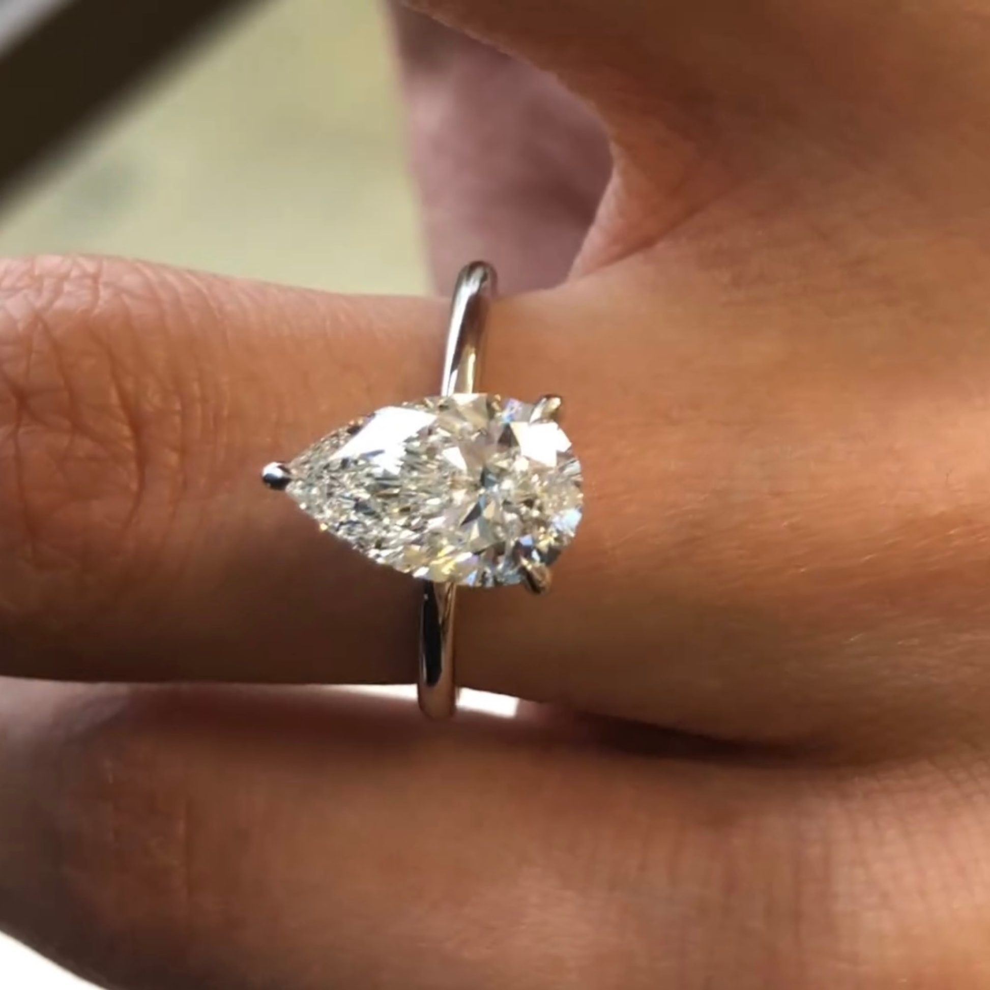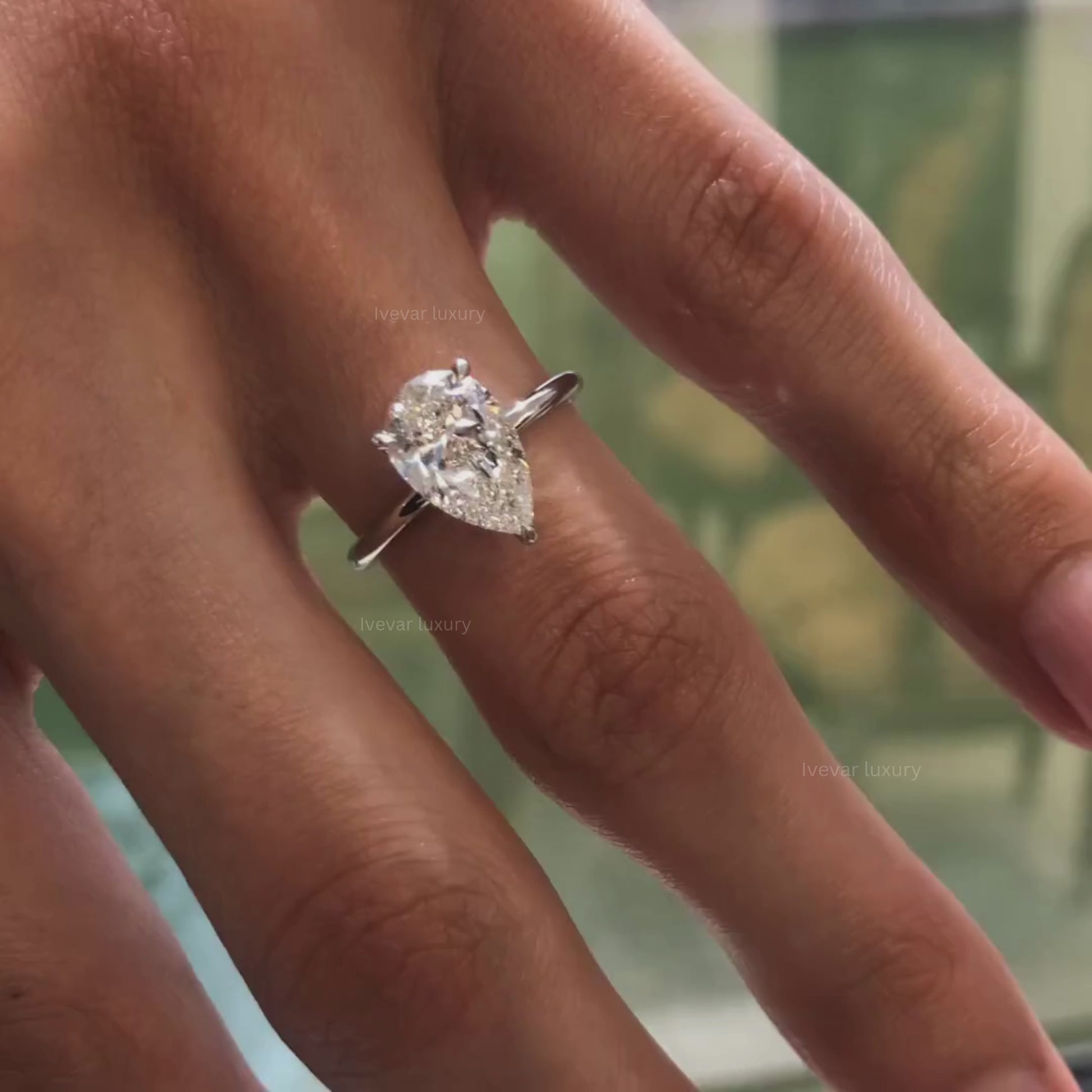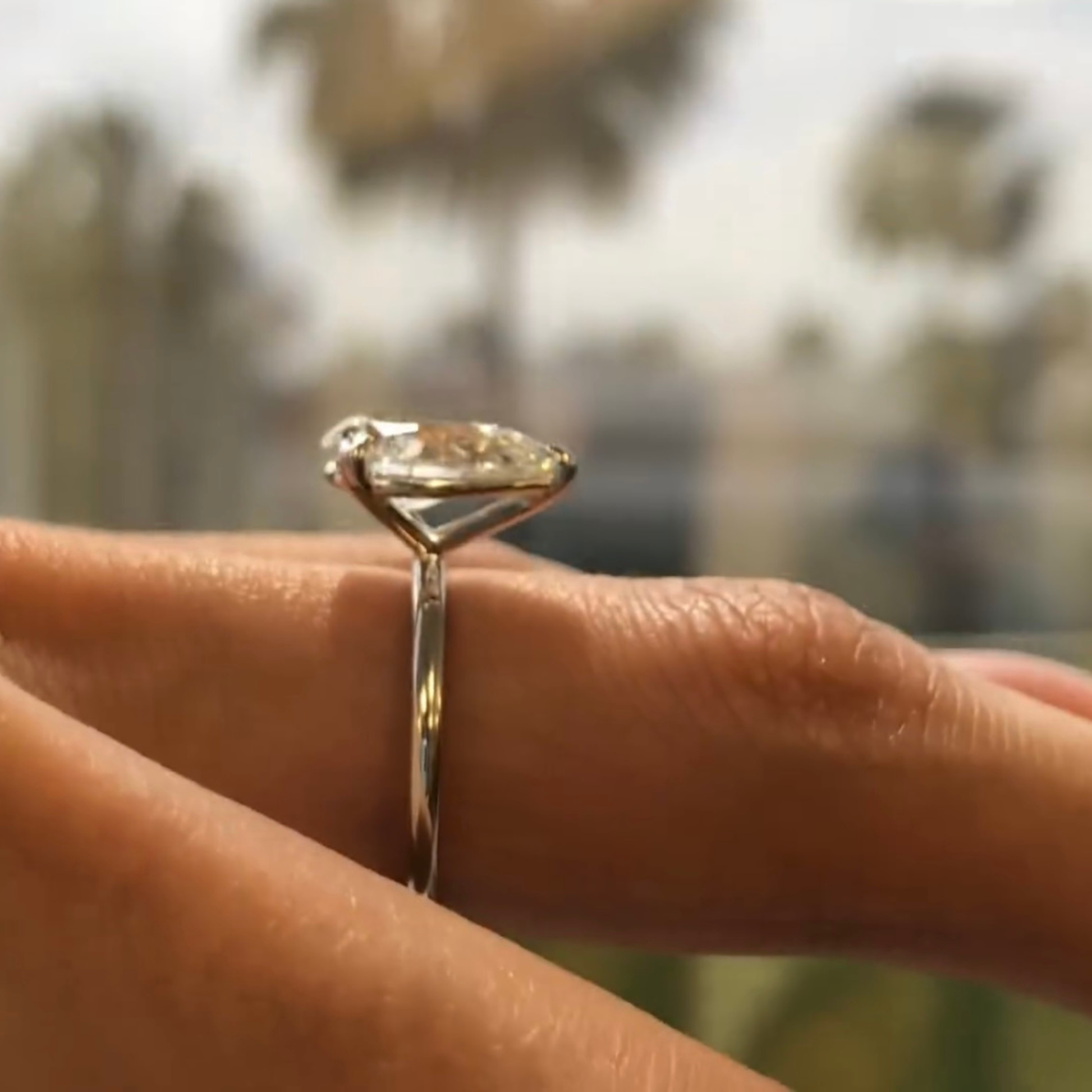 This elegant solitaire ring features a luminous pear-shaped center stone secured in a refined three-prong setting that demonstrates brilliance and elongates the finger. The slim, high-polish gold band offers a clean and timeless profile, allowing the stone to remain the focal point. Perfect for modern romantics, this design blends simplicity, sophistication, and enduring beauty.