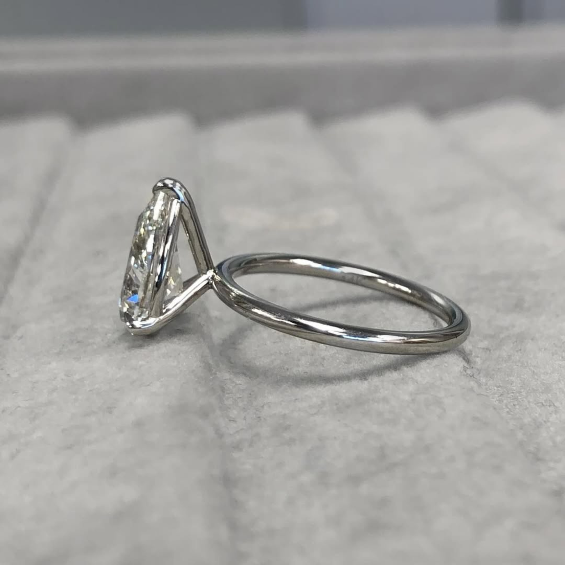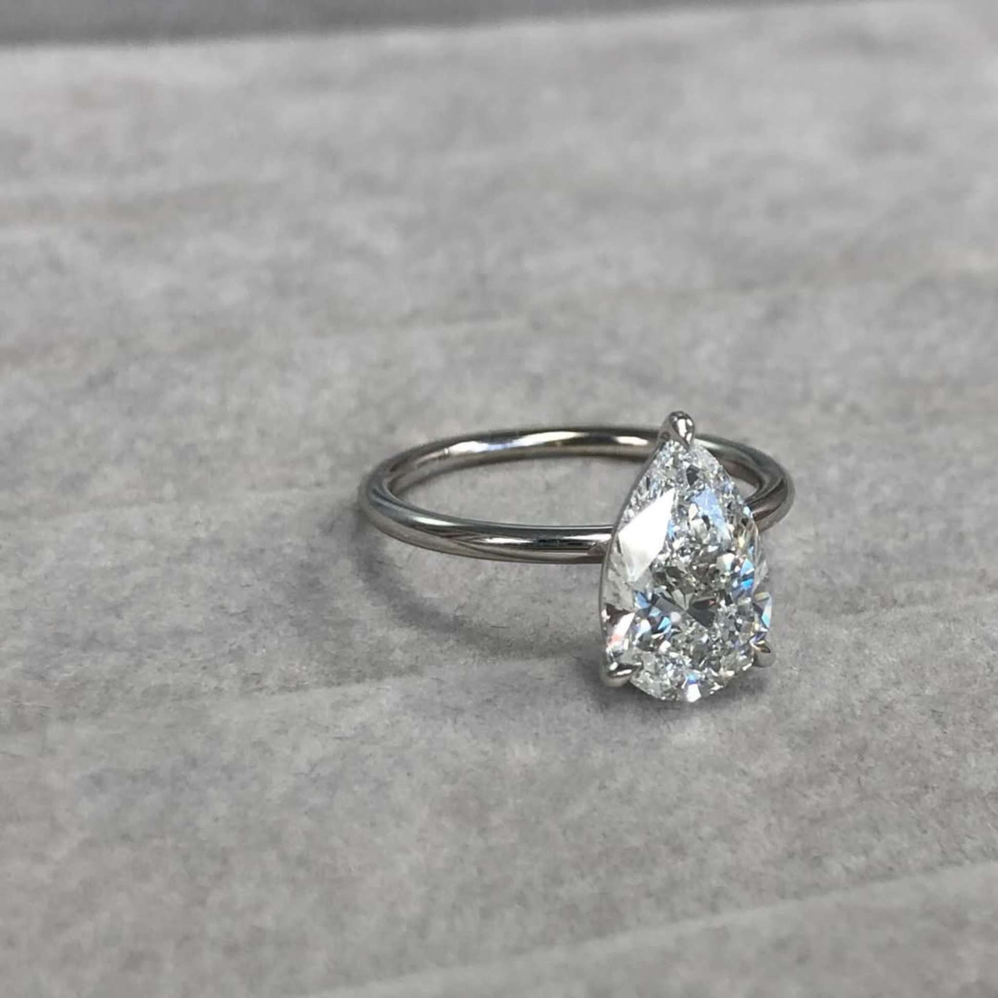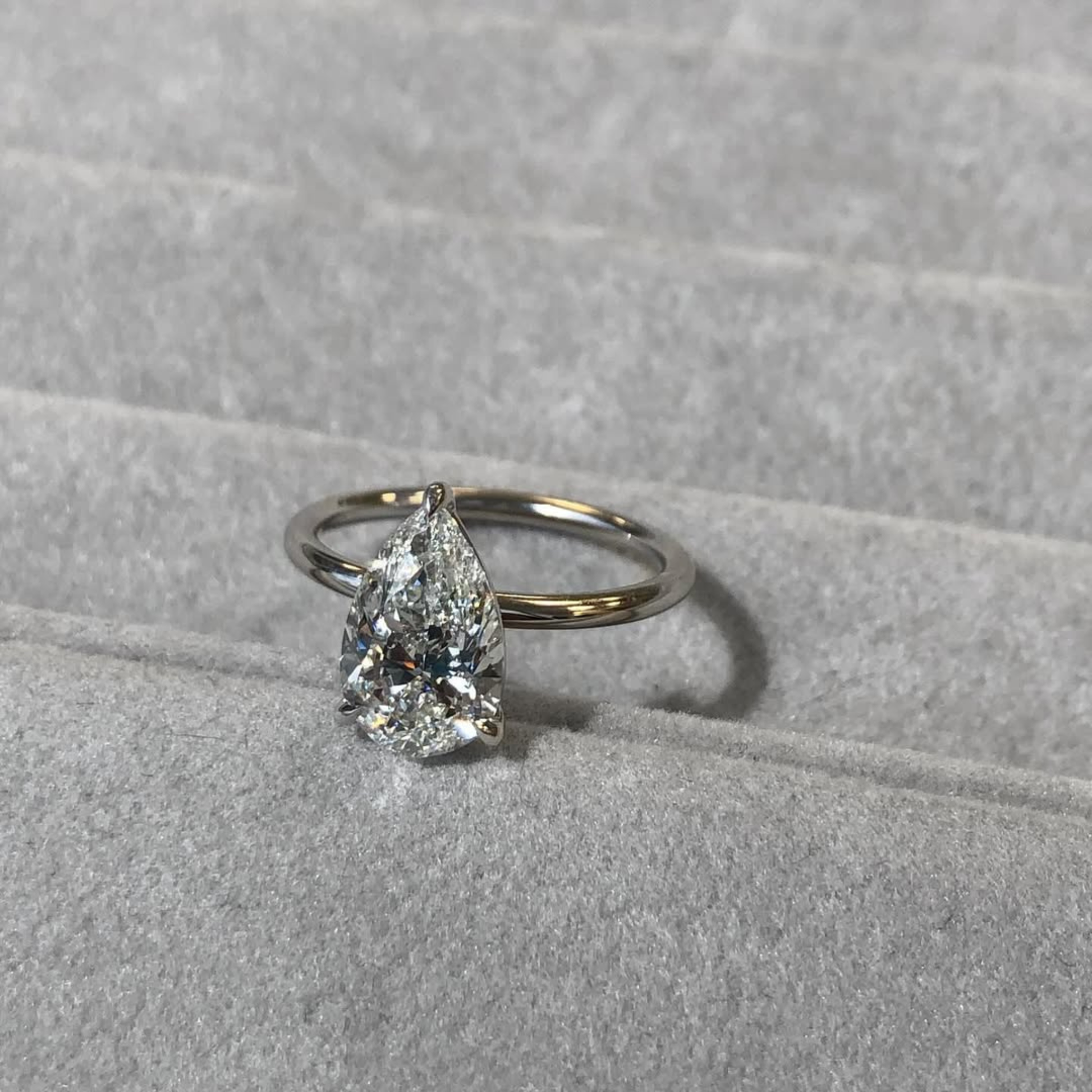 This elegant solitaire ring features a luminous pear-shaped center stone secured in a refined three-prong setting that demonstrates brilliance and elongates the finger. The slim, high-polish gold band offers a clean and timeless profile, allowing the stone to remain the focal point. Perfect for modern romantics, this design blends simplicity, sophistication, and enduring beauty.